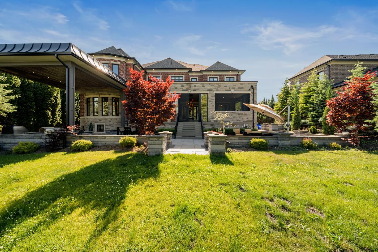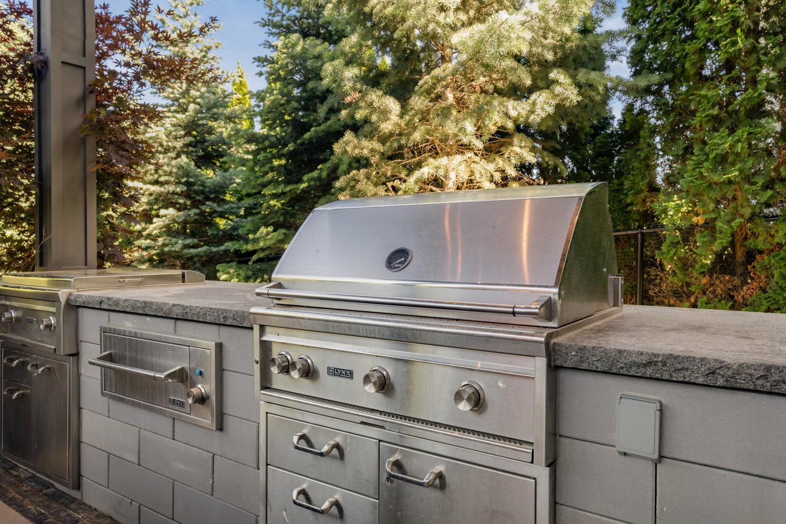 • Private backyard with built-in BBQ area and mature trees for seclusion.