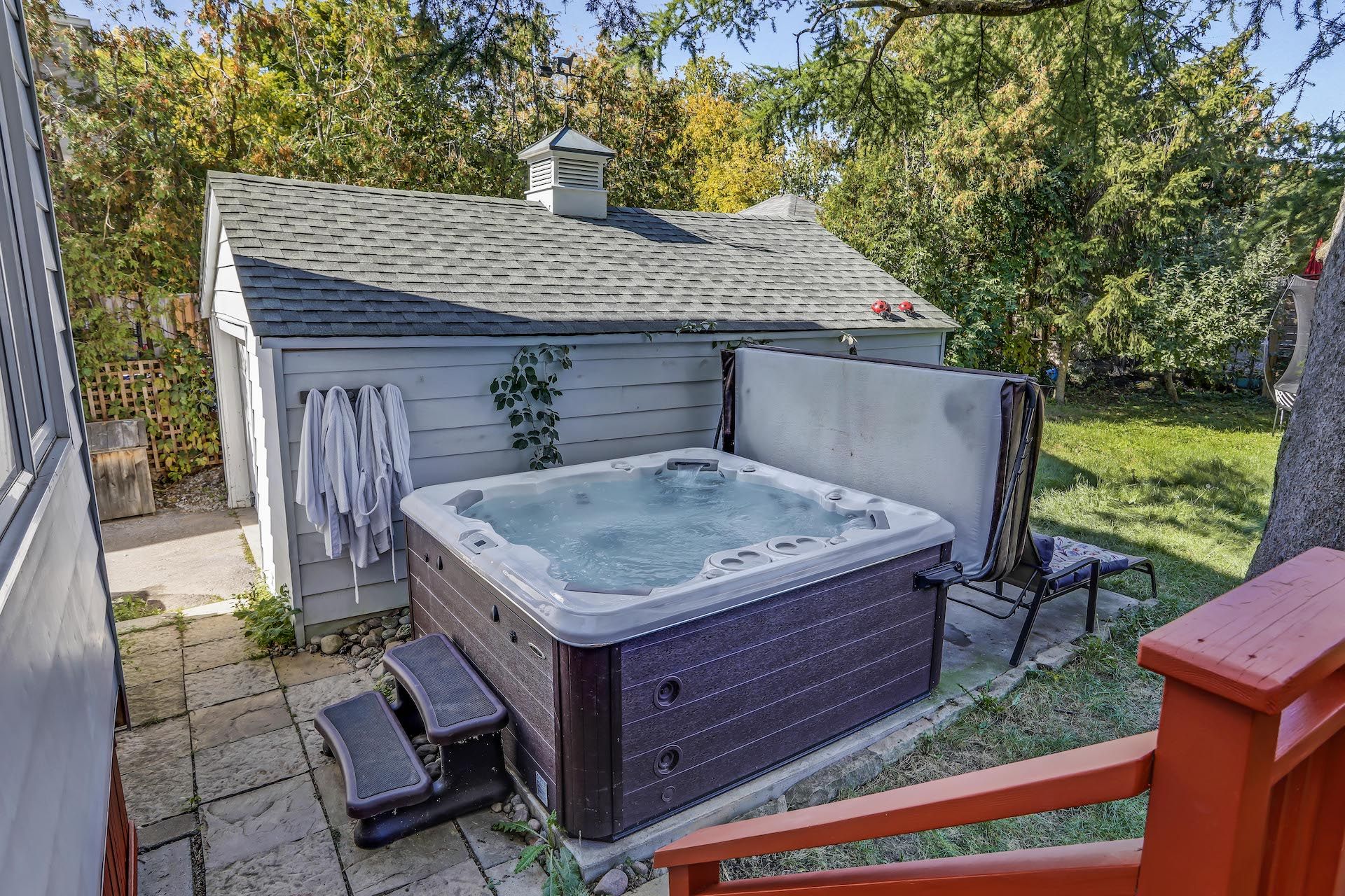 • Private backyard oasis with mature trees, terrace, and hot tub.