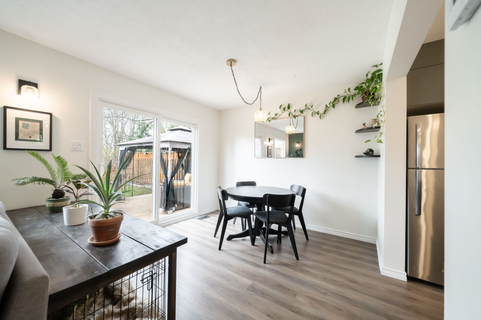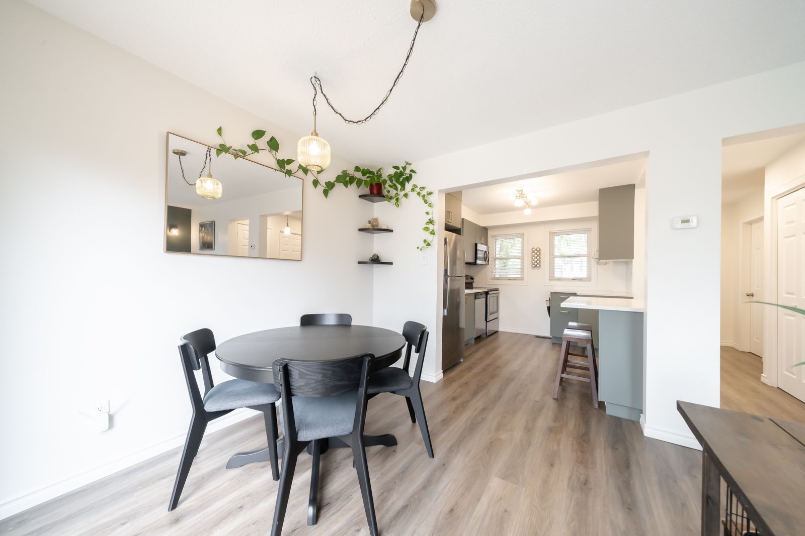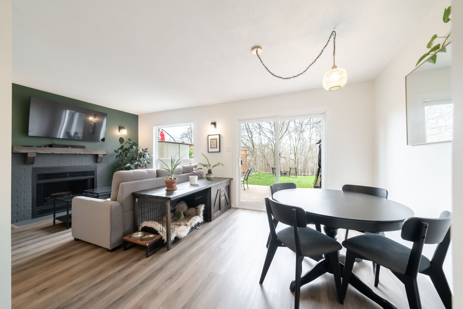 Beautifully upgraded home backing onto your own private oasis with trails & d'aubigny creek. This stunning 3 bedroom, 3 bathroom home has been extensively & thoughtfully upgraded throughout. Step into a fully renovated open concept kitchen featuring quartz countertops, ceramic tile backsplash, gold hardware, new cabinetry, and a double farmhousesink. Large windows fill the space with natural light, while the spacious island offers seating, storage, and the perfect gathering space for entertaining. Vinyl flooring flows seamlessly into the living and dining areas, where you'll find a cozy grey brick fireplace with a custom oak mantel and stylish sconces for controlled lighting. Large windows showcase your private backyard, creating a bright and inviting atmosphere. The main floor includes a convenient 2 pc bathroom with a modern colour drenched design, plus a sleek popcorn free ceiling w/ potlights for a clean, contemporary finish. A fresh stained railing & trendy chandelier lead you upstairs to three well sized bedrooms. The primary bedroom offers an enlarged window overlooking the peaceful trail, providing rare privacy and natural views. The full bathroom has been refreshed with newpaint and ceramic tile for a crisp, updated feel. The finished basement is perfect for entertaining, featuring a custom wet bar featuring a live edge wood top, seating, stone & mirror backsplash, completed with a beverage fridge. In addition, comfortably enjoy move night w/ pot lights, wood beam accents, and custom barn doors. The laundry/ bathroom includes ceramic tile flooring & dual use utility sinkstep outside to a 450 sf wood deck with b/i waste storage, an iron pergola, and a 10' stained trellis for added privacy. A natural stone garden border to complete, while a back gate offers direct access to scenic trails and a nearby conservation area. Located close to highways, shopping, trails, and the grand river, this turnkey home is ready for you to enjoy this summer to the fullest!