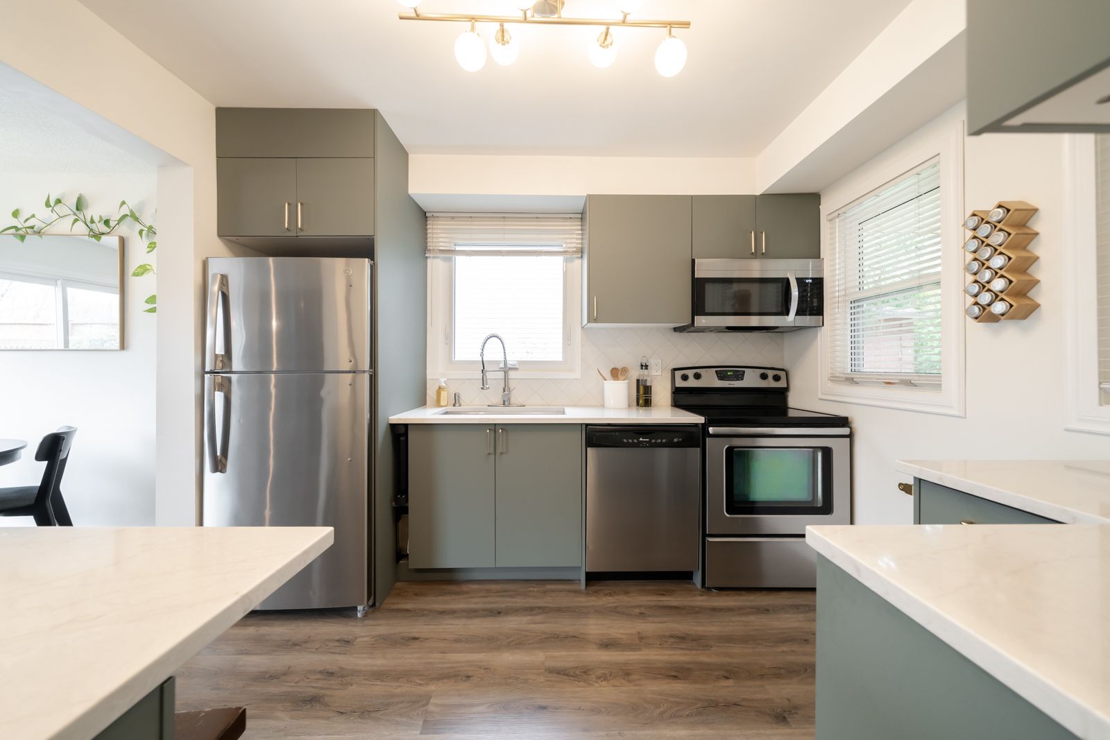 • Open concept kitchen with quartz countertops and ample gathering space.