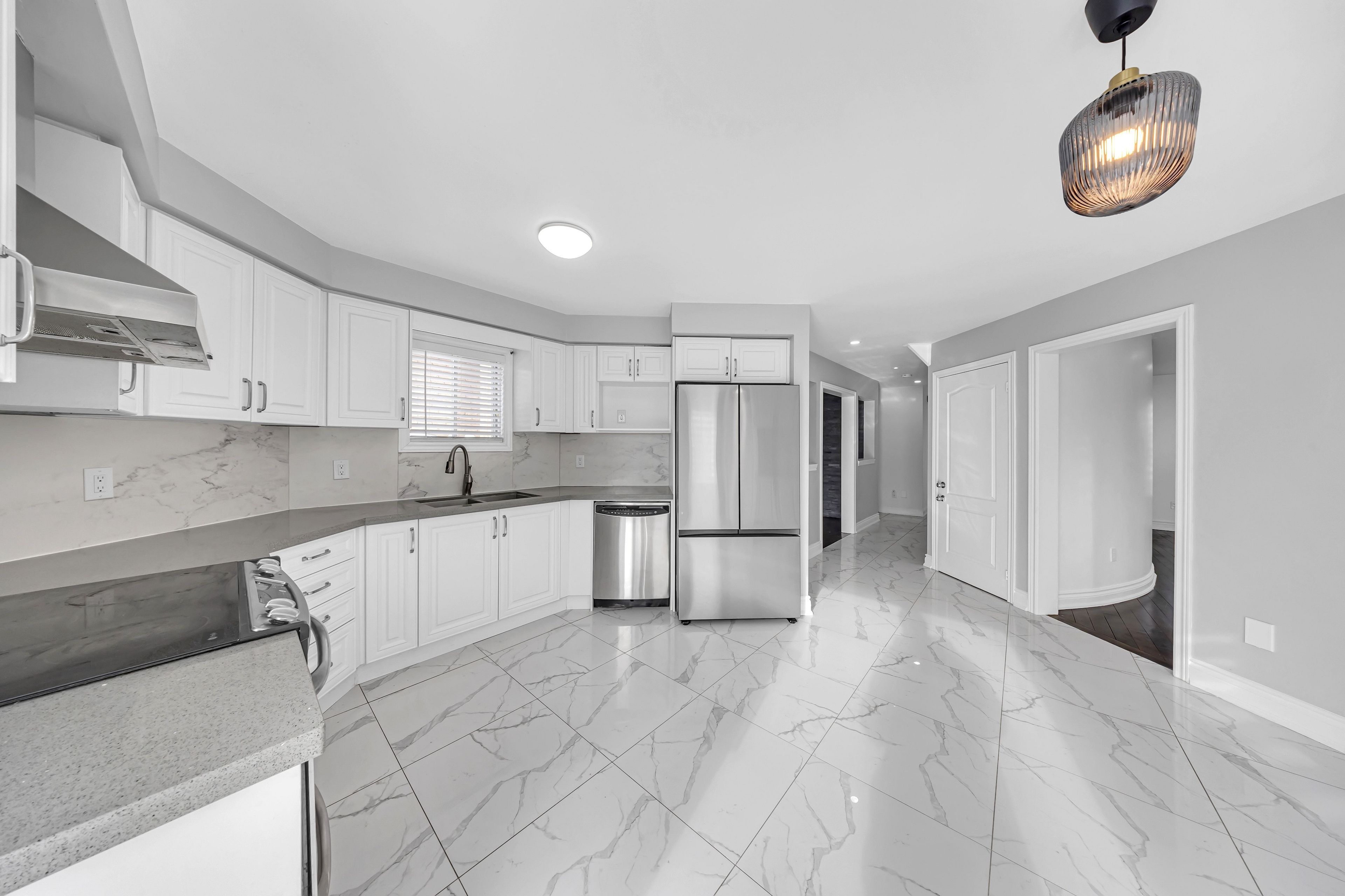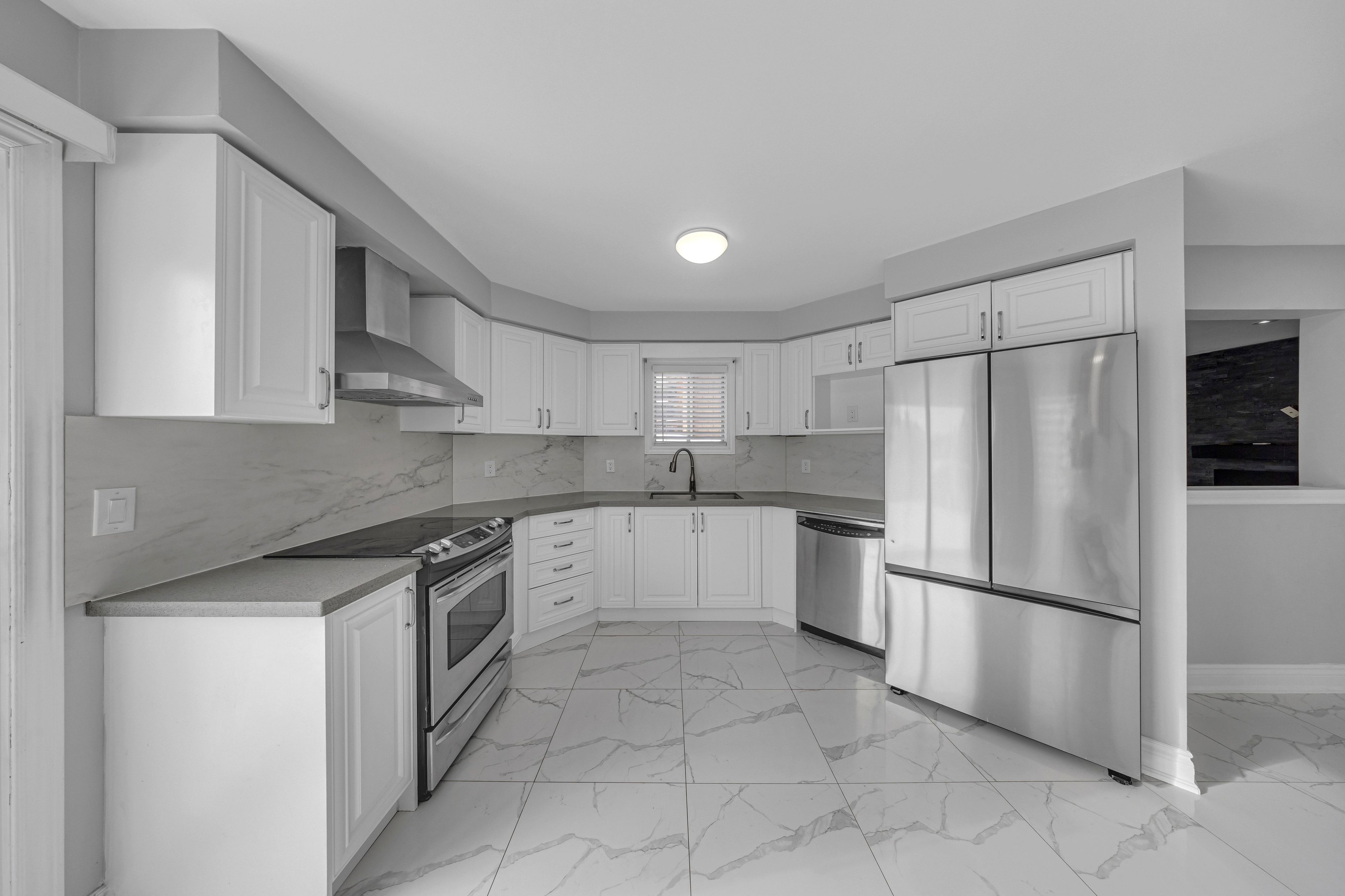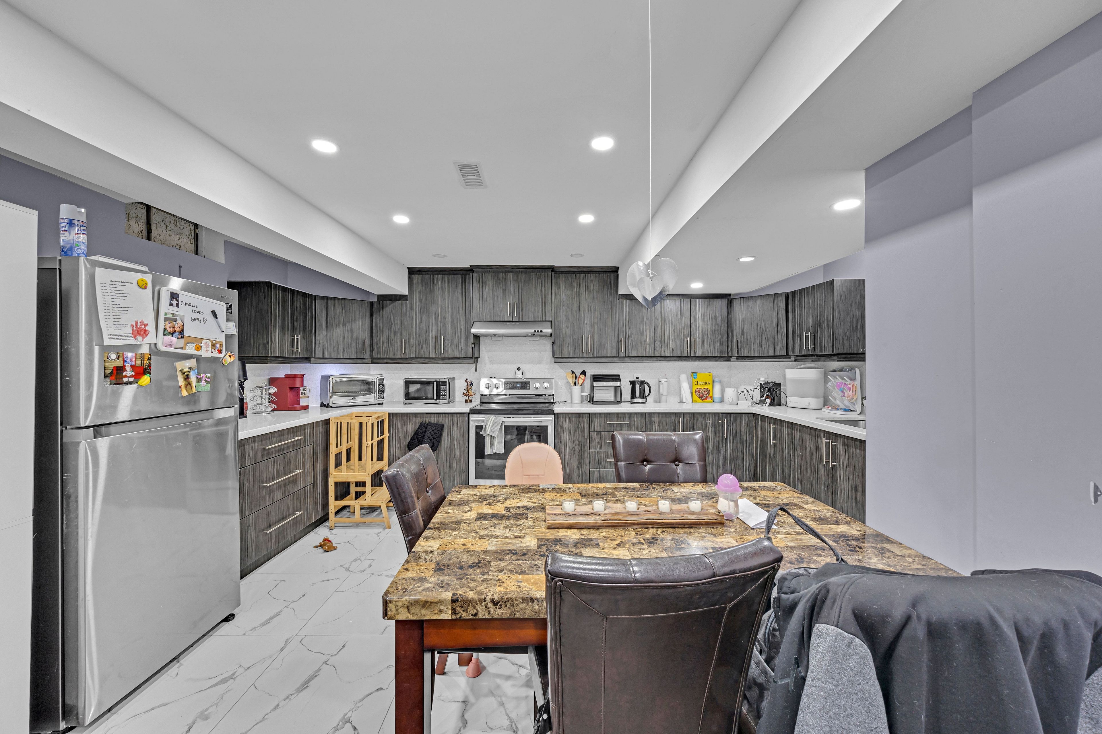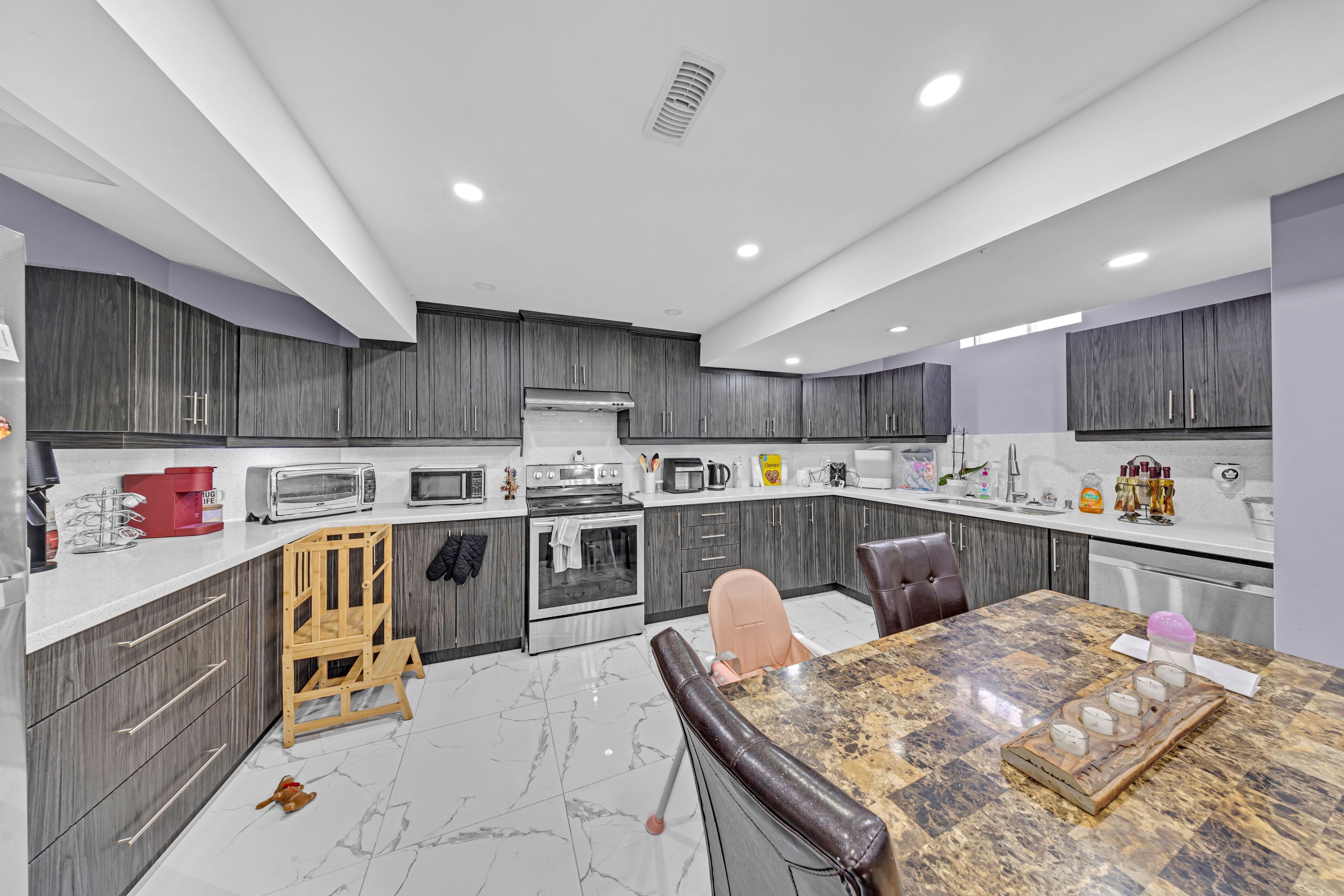 • Modern kitchen featuring quartz countertops and stainless steel appliances.