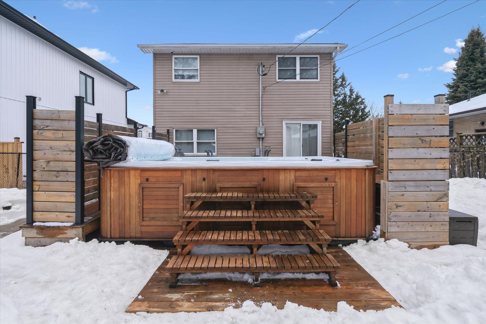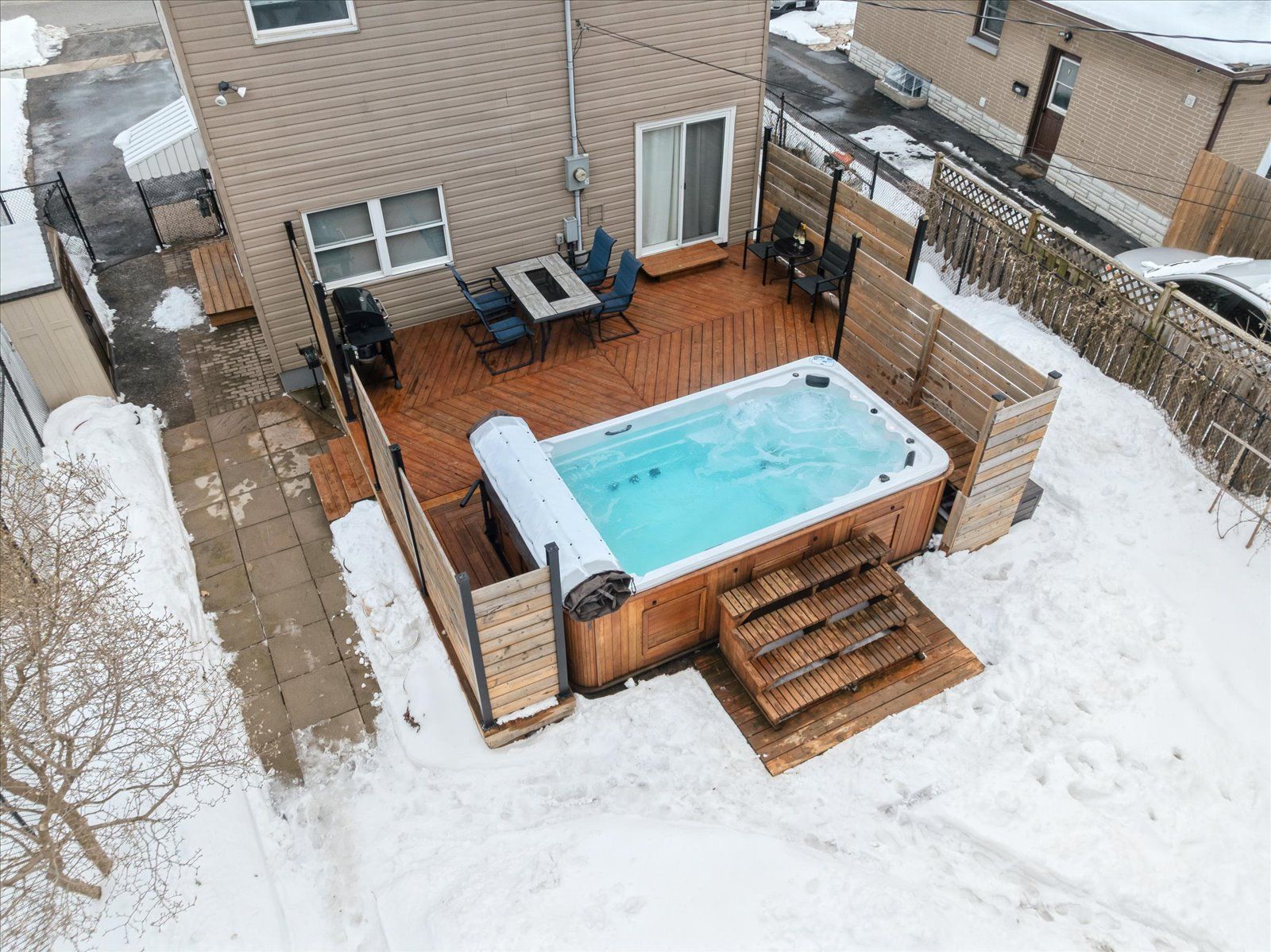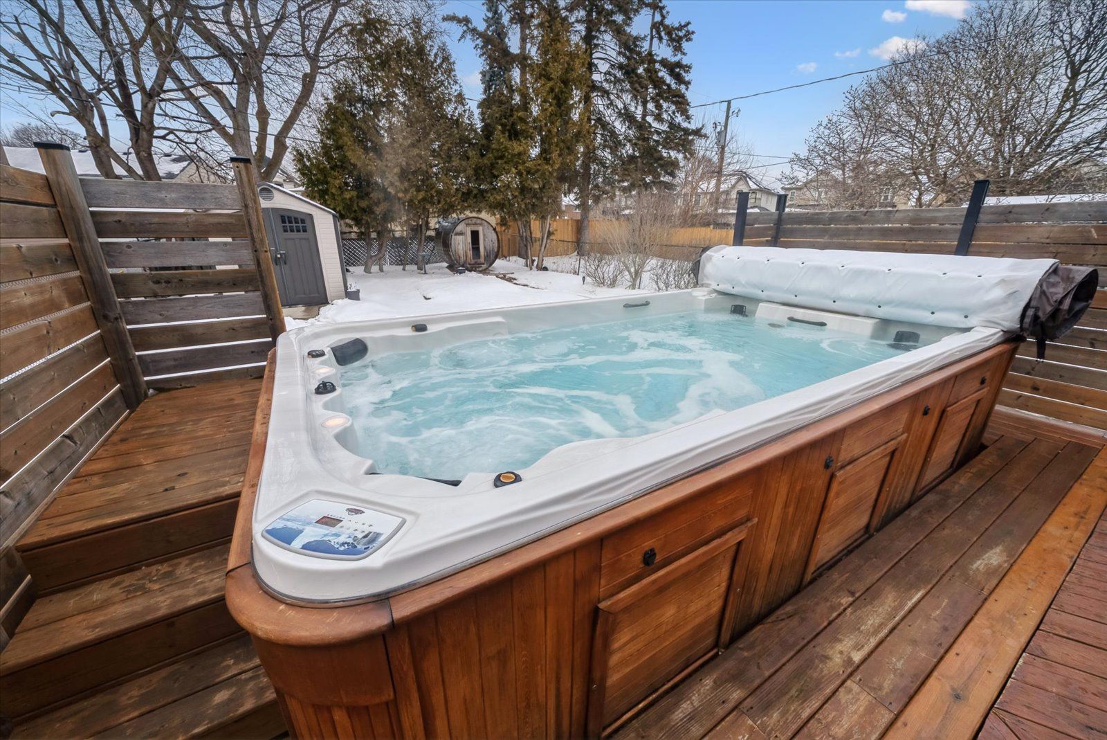 • Spacious backyard features a deck, swim spa, and private sauna.