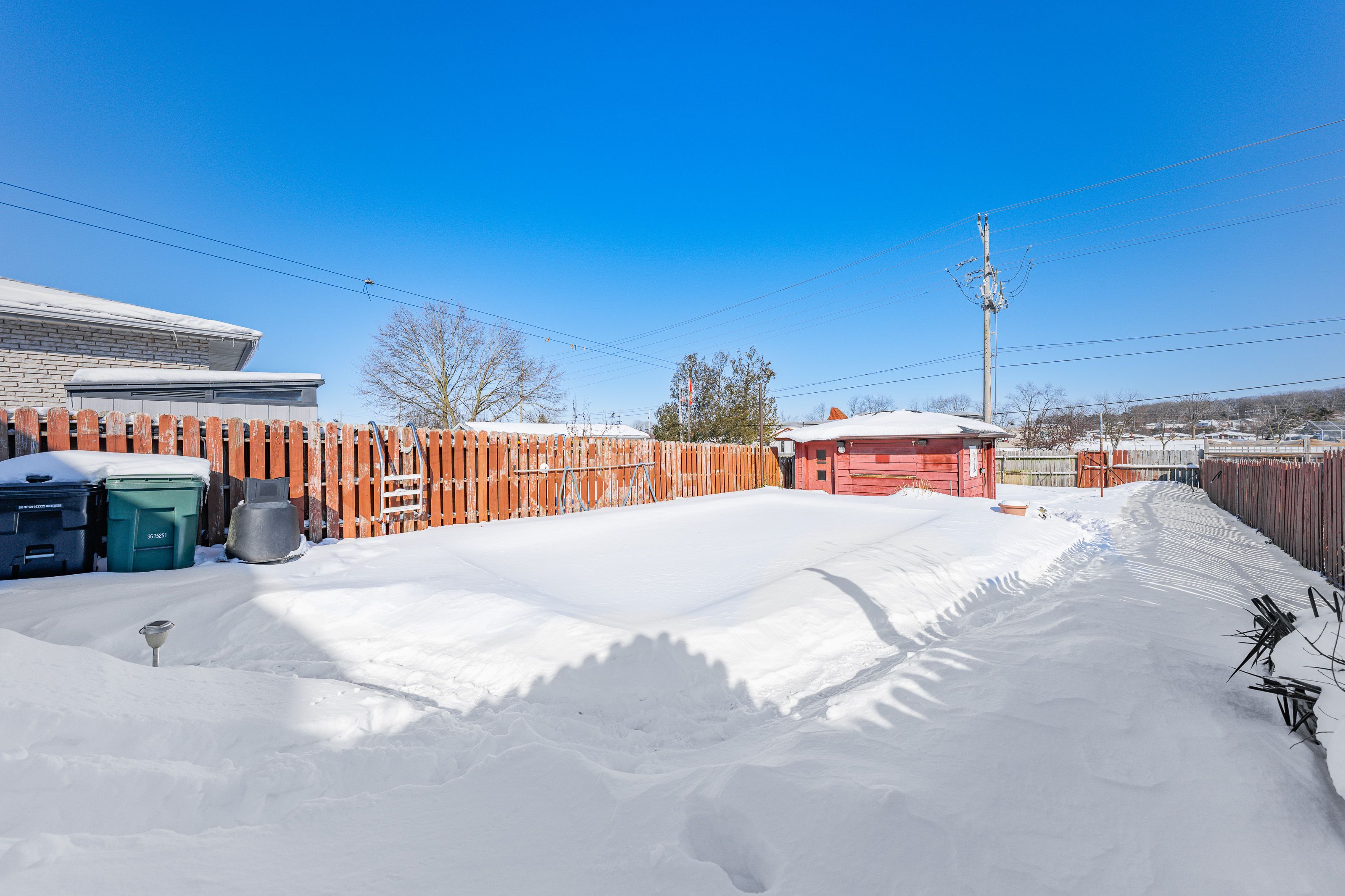• Outdoor area features a large deck, pool, and storage shed with hydro.