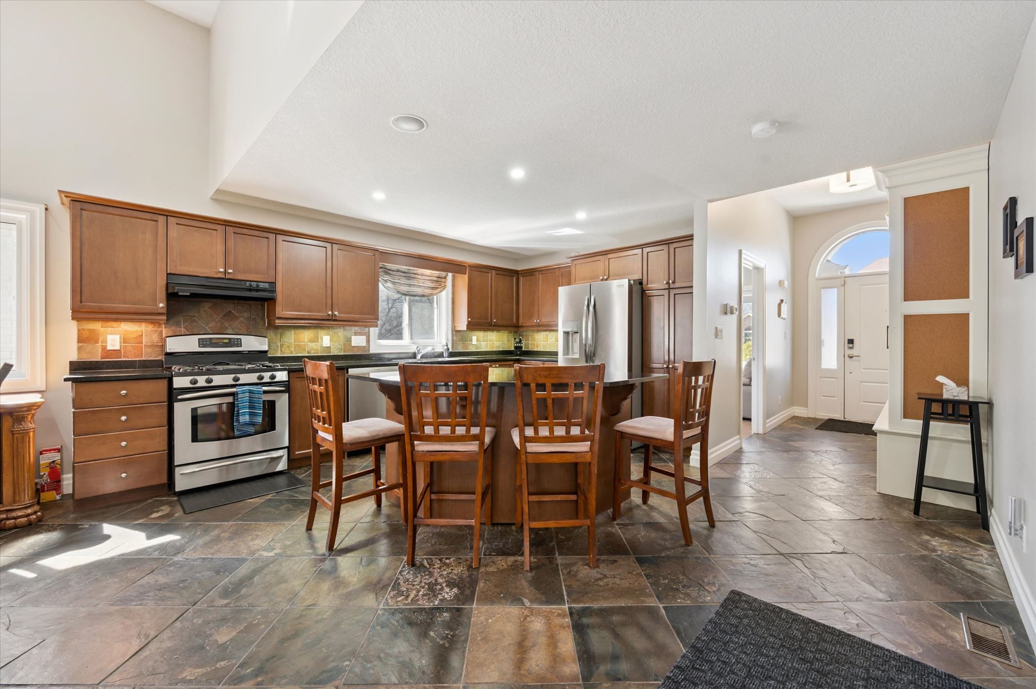 • Large eat-in kitchen featuring granite countertops and upgraded cabinetry.