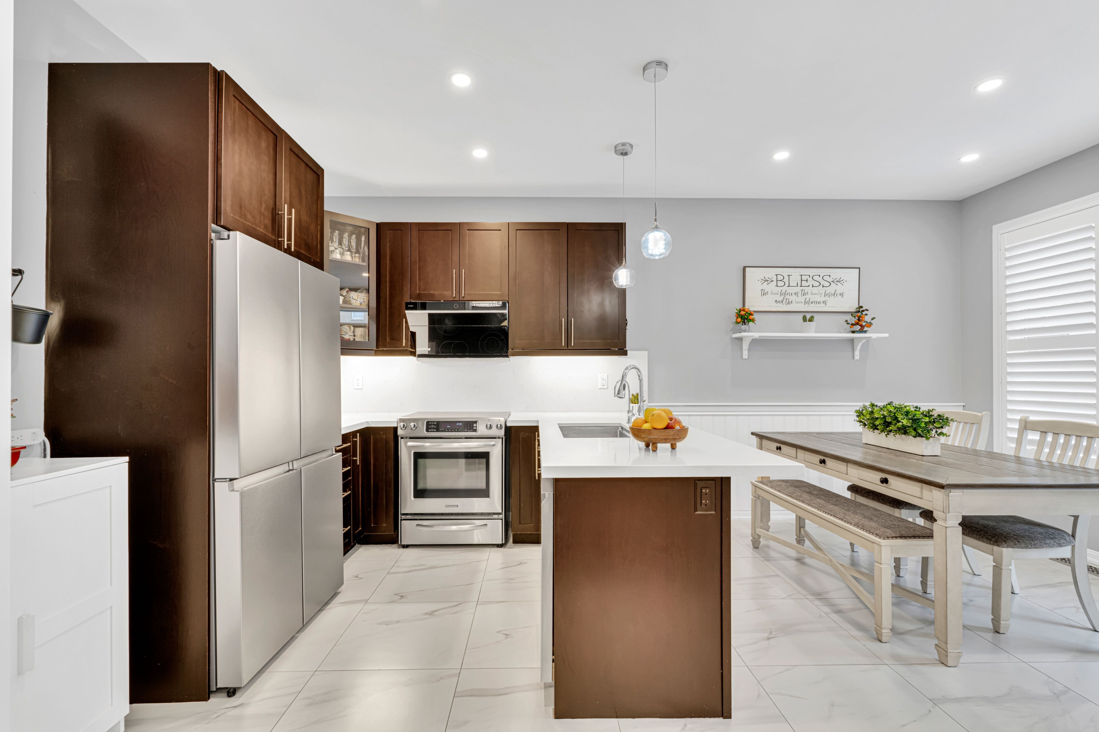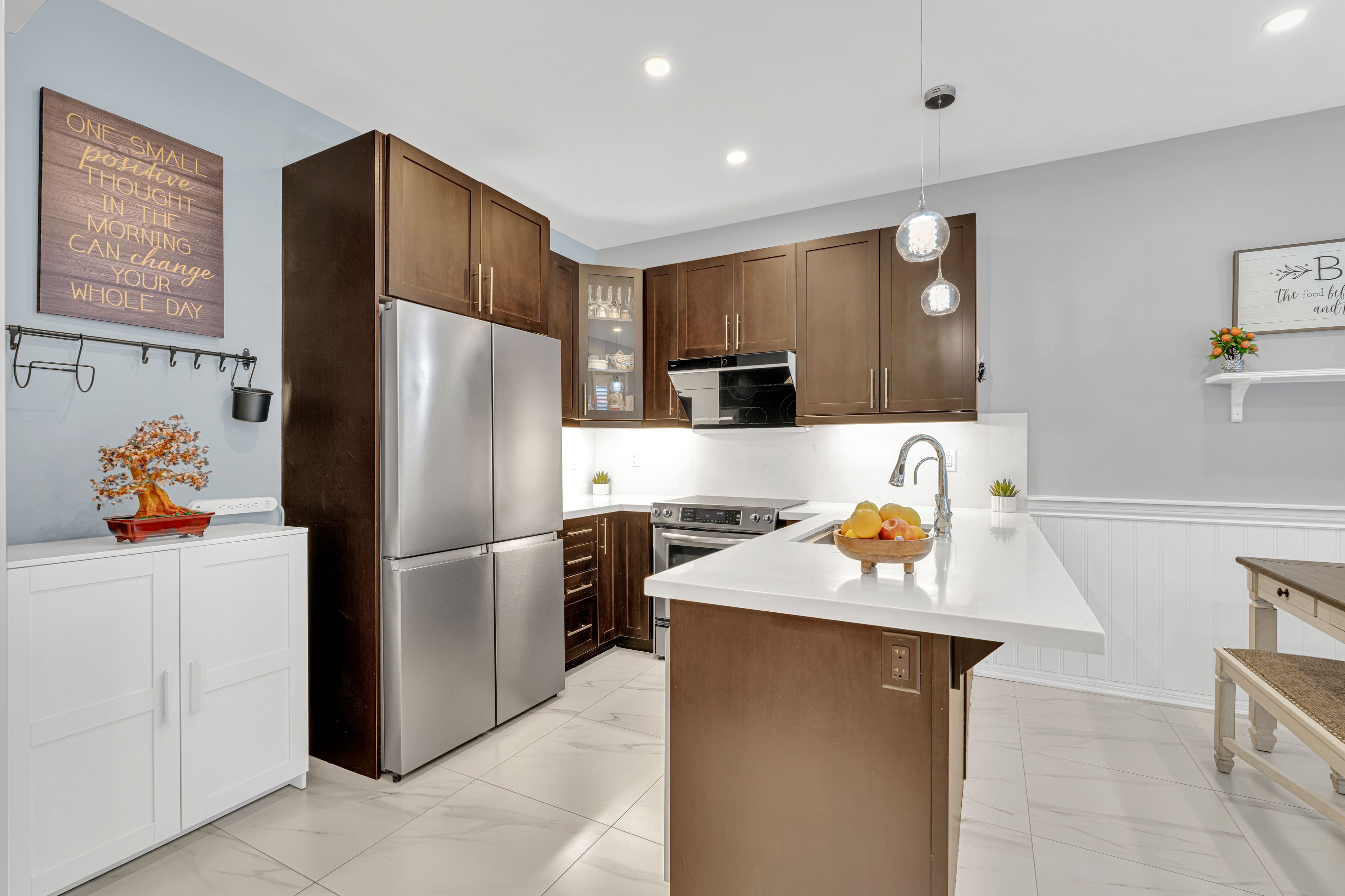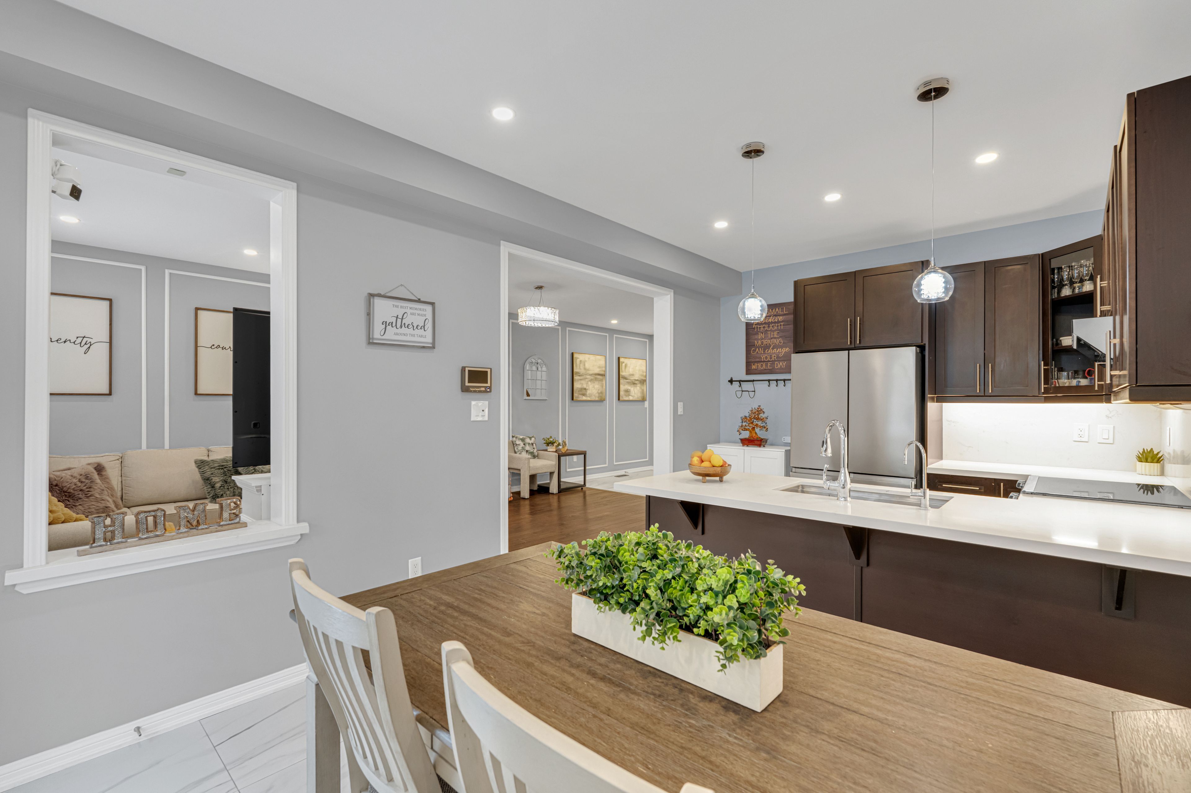 • Open concept kitchen with upgraded cabinets and quartz countertops.
