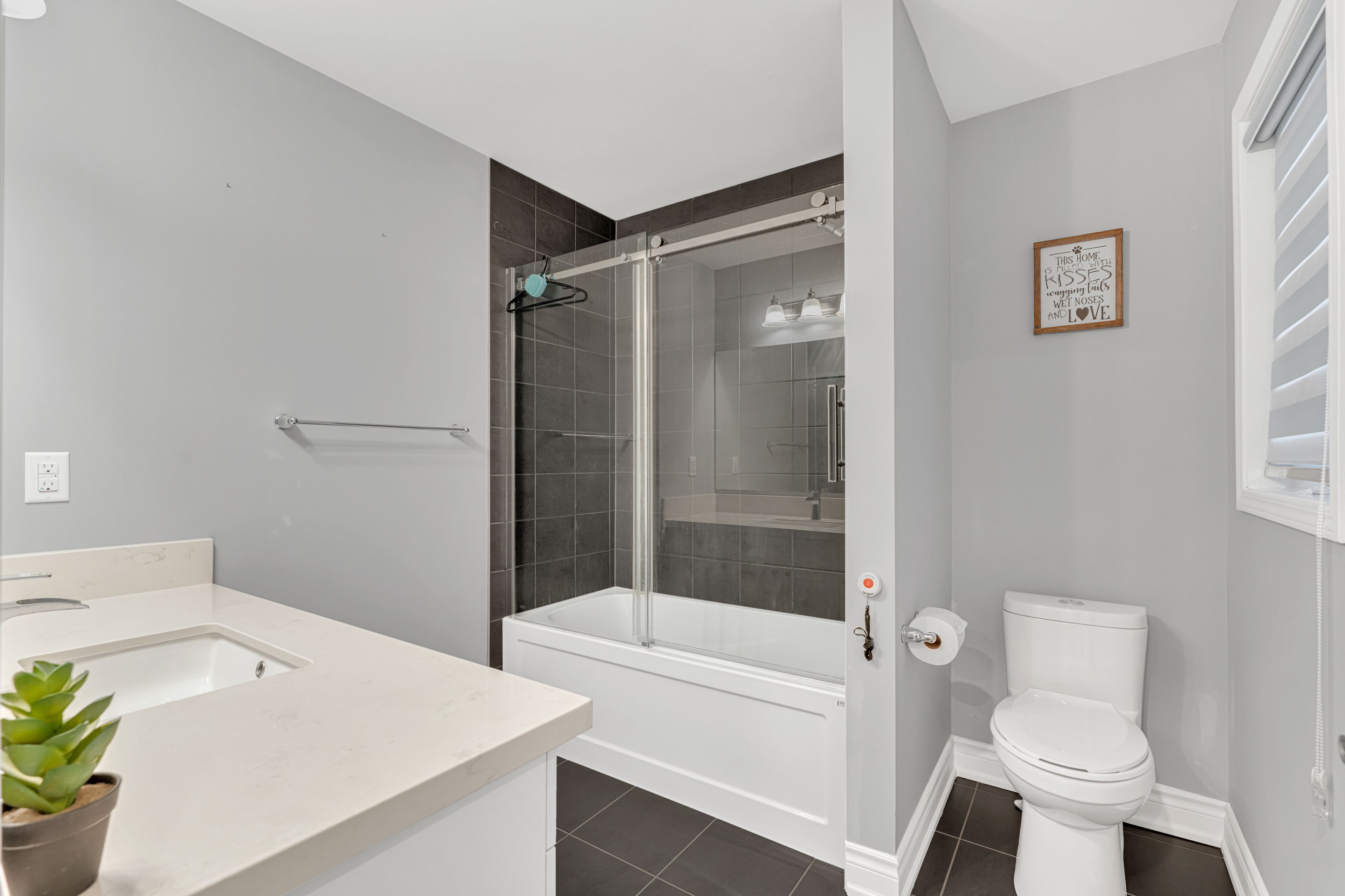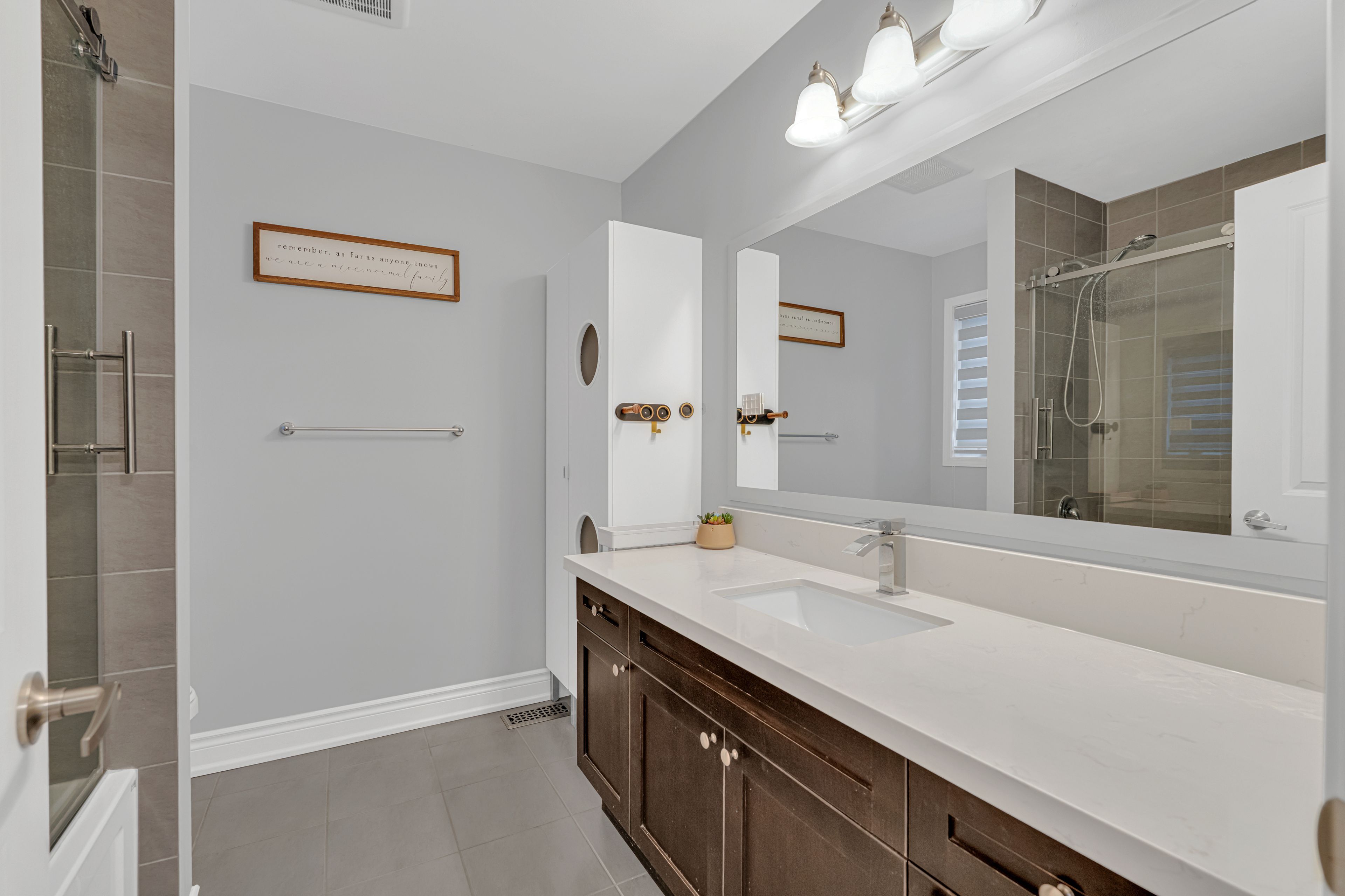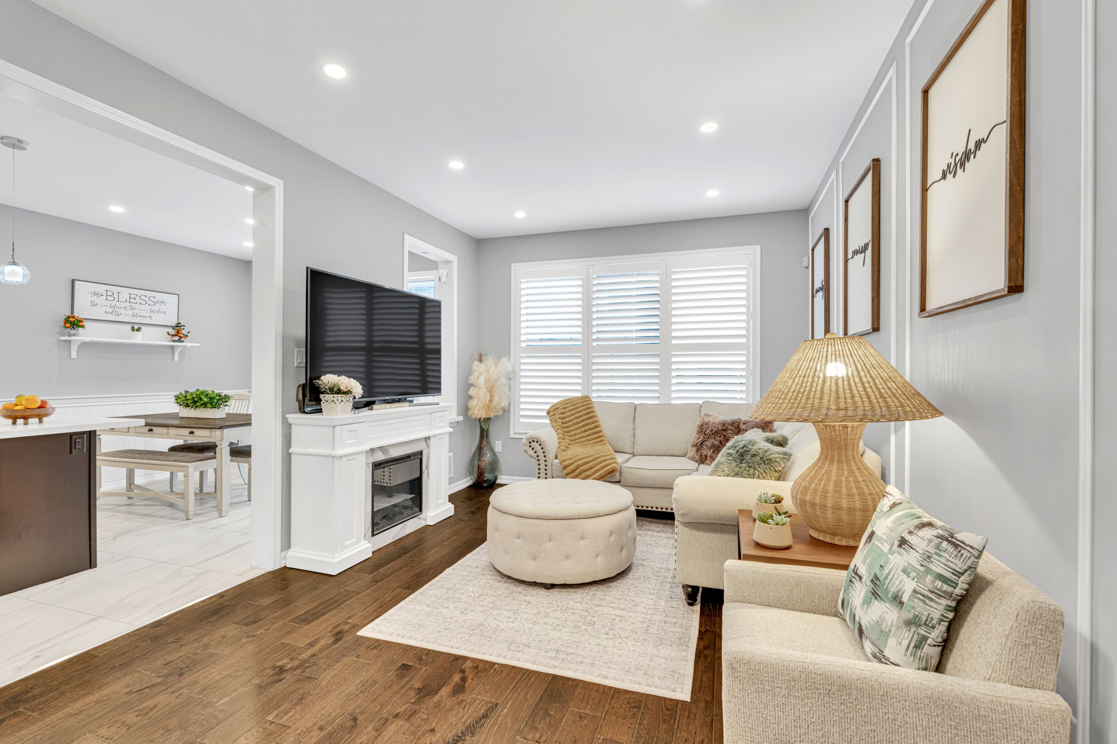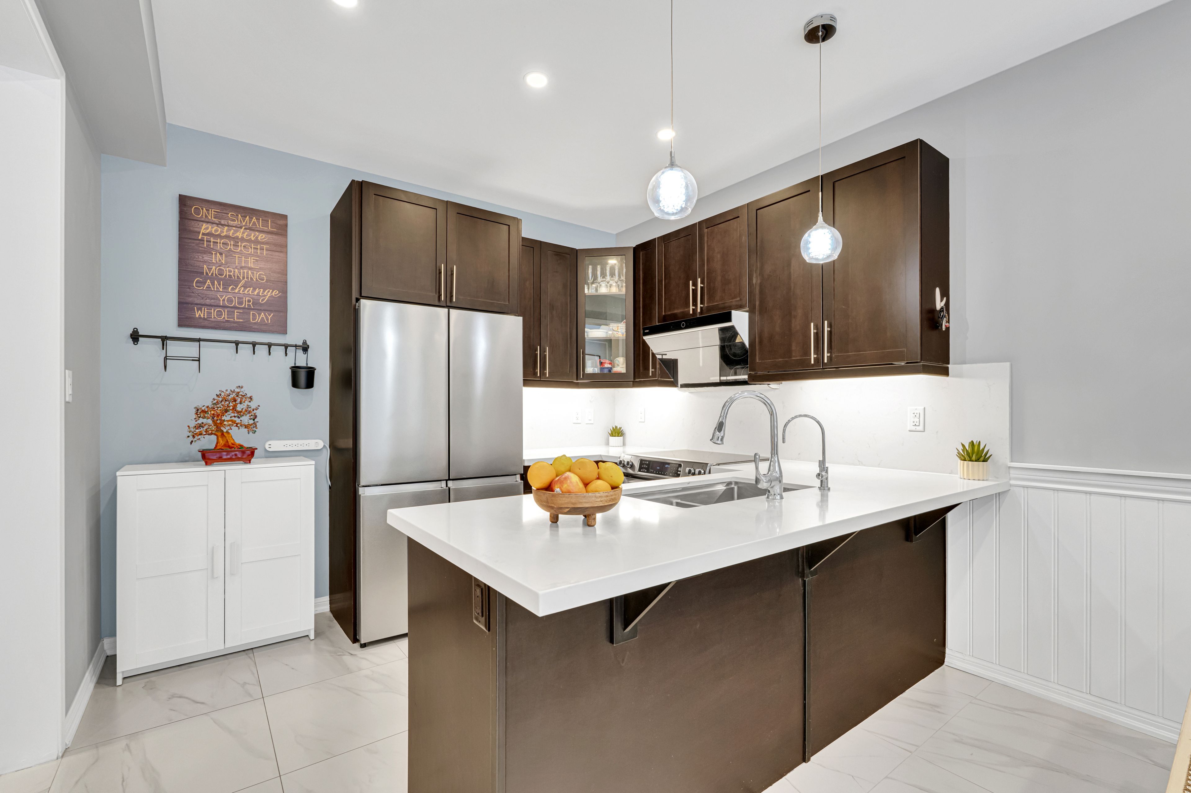 • Open concept kitchen with upgraded cabinets and quartz countertops.