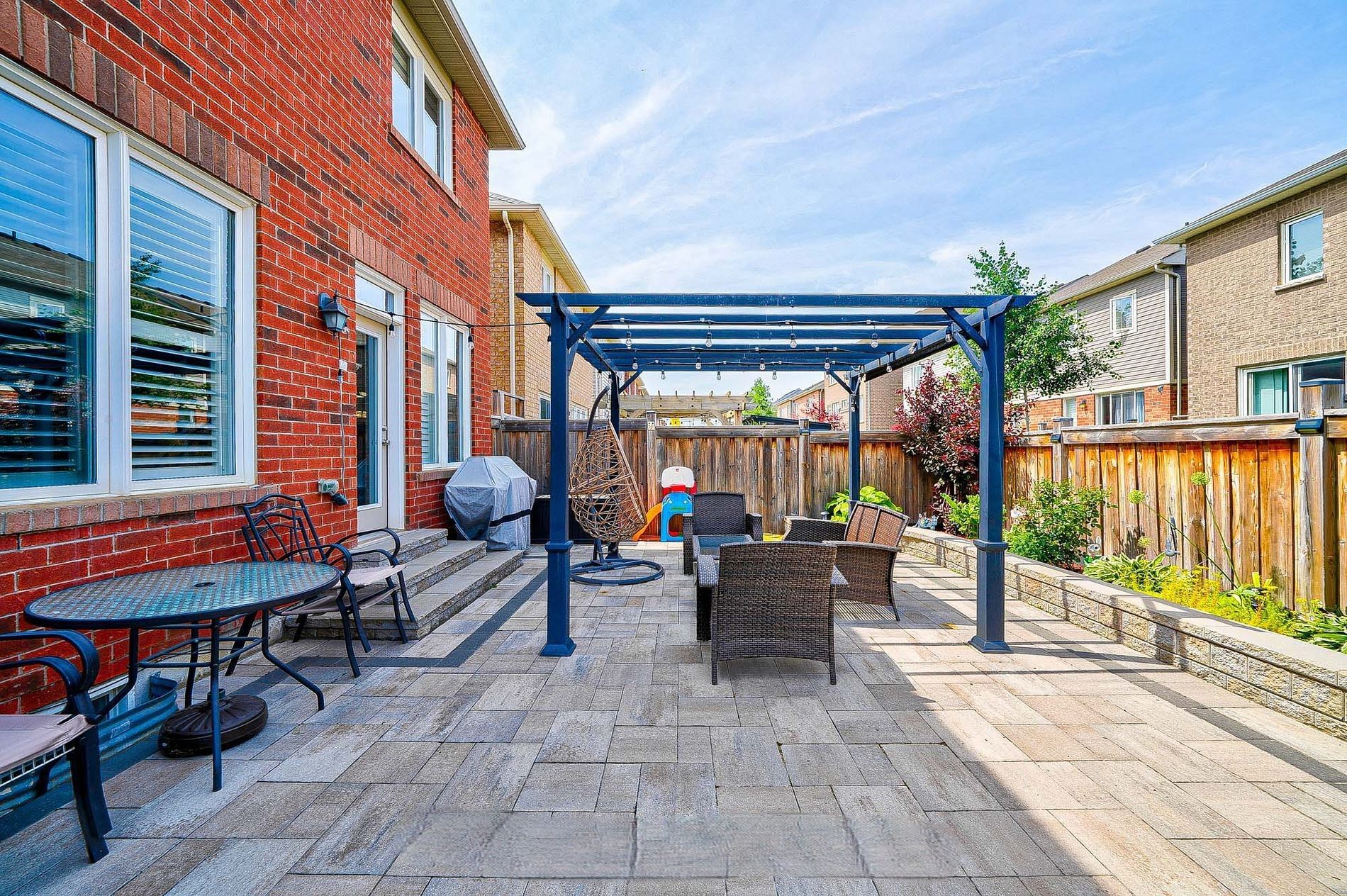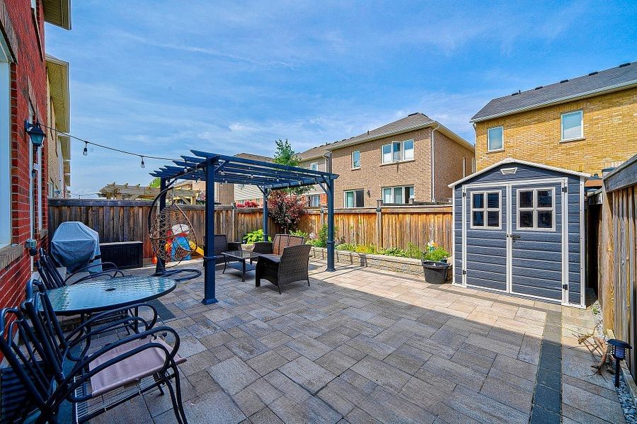 • Fully fenced backyard with interlocking patio, great for gatherings.