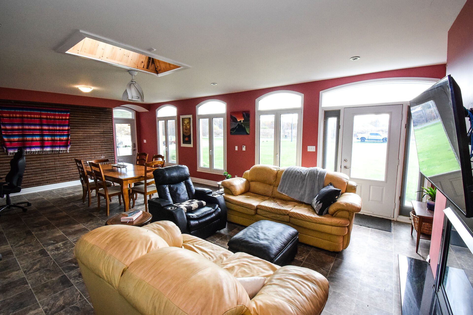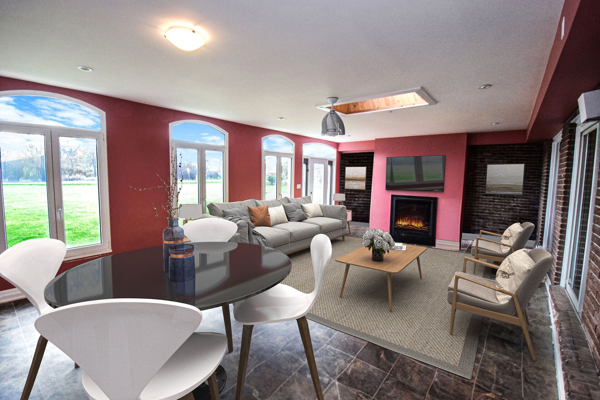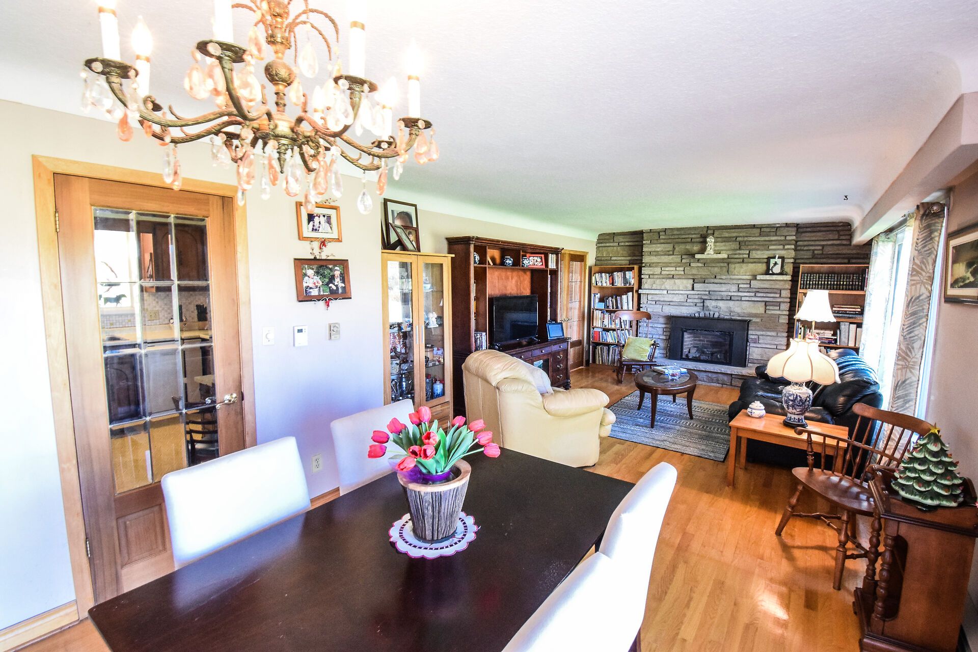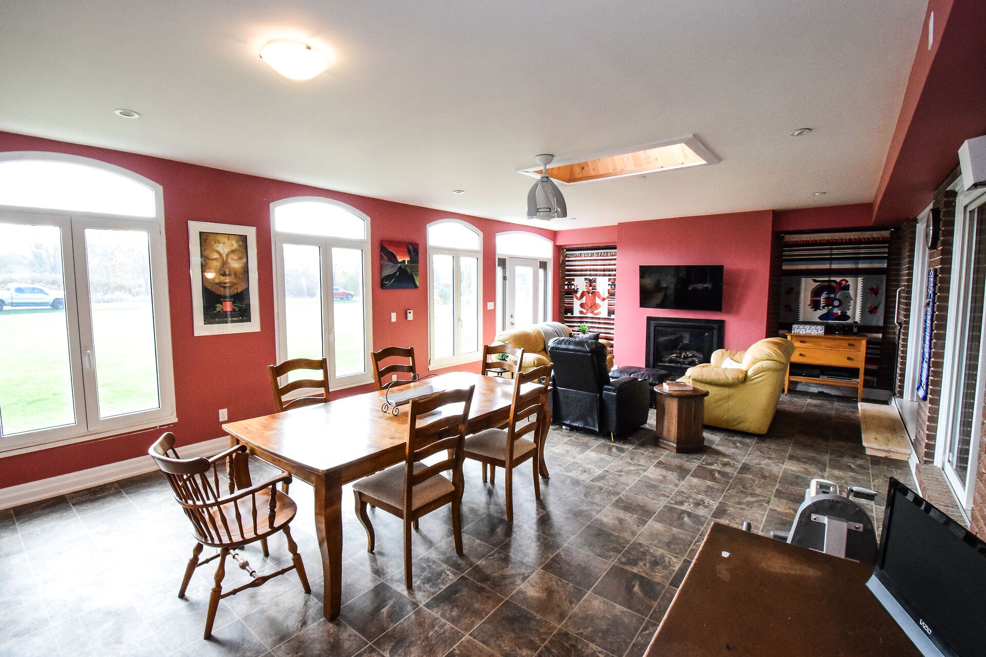 • Bright open concept family room with fireplace and vinyl flooring.