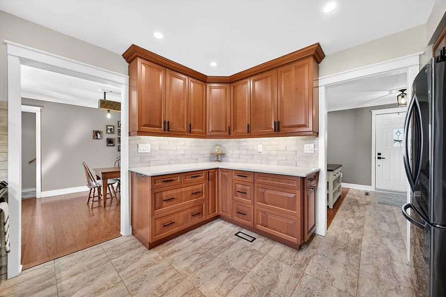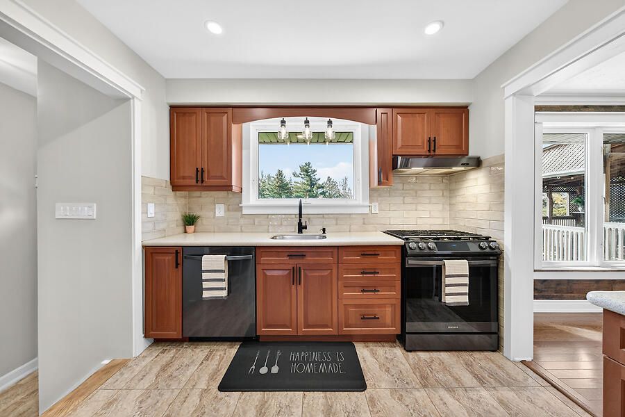 • Upgraded kitchen with custom cabinetry and direct patio access.