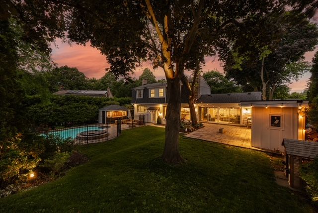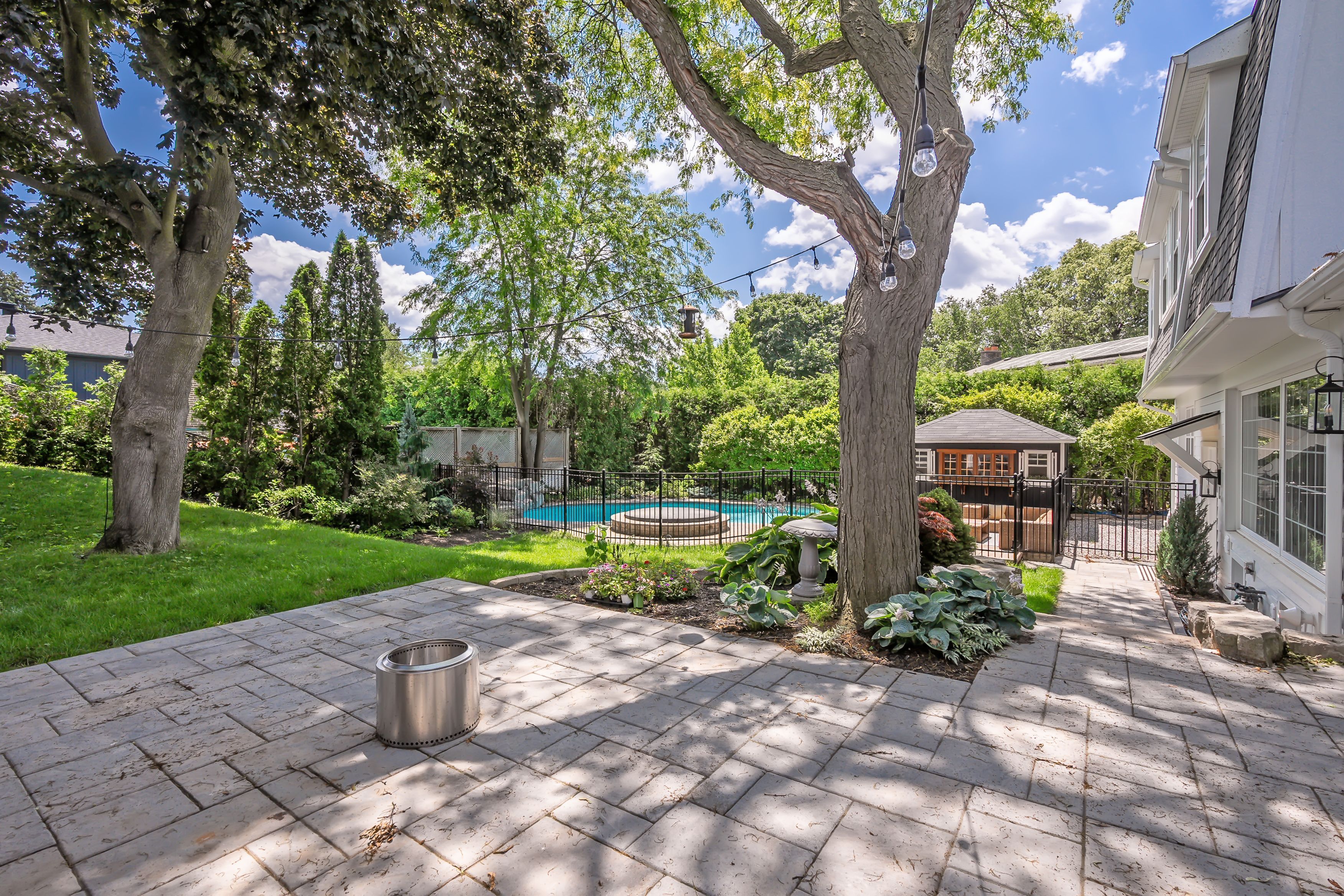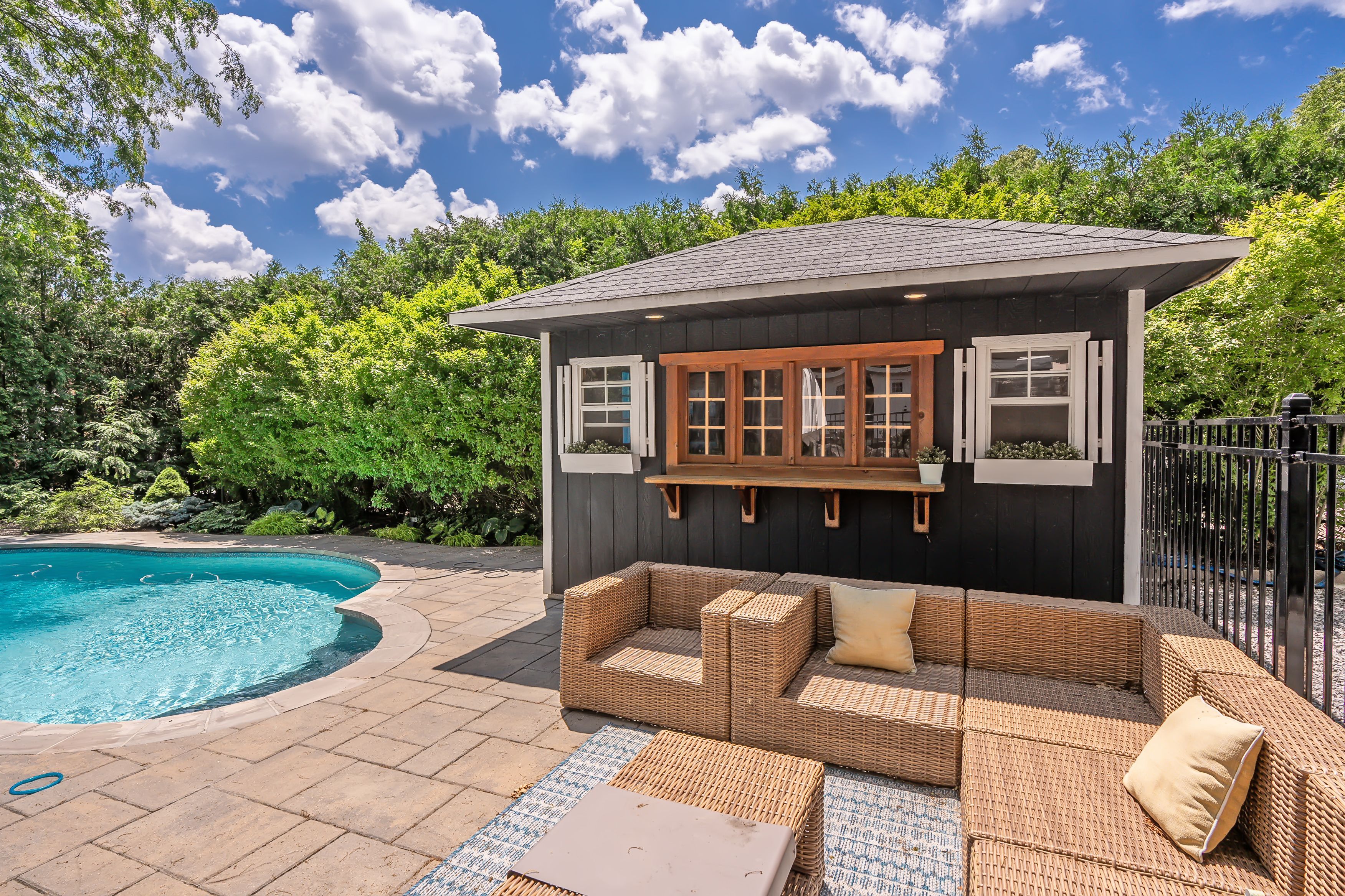 • Inviting backyard oasis featuring a pool, hot tub, and pool house.