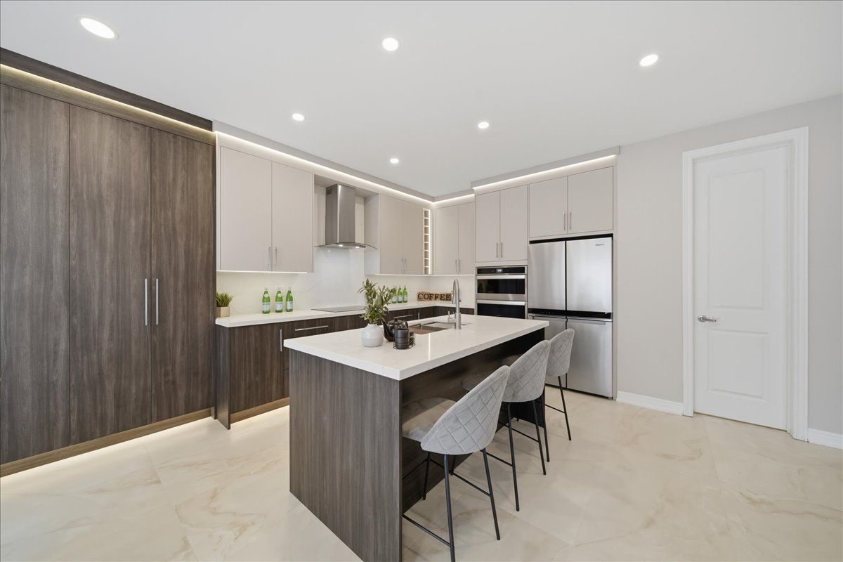• Modern kitchen with new appliances, quartz countertops, and large island.