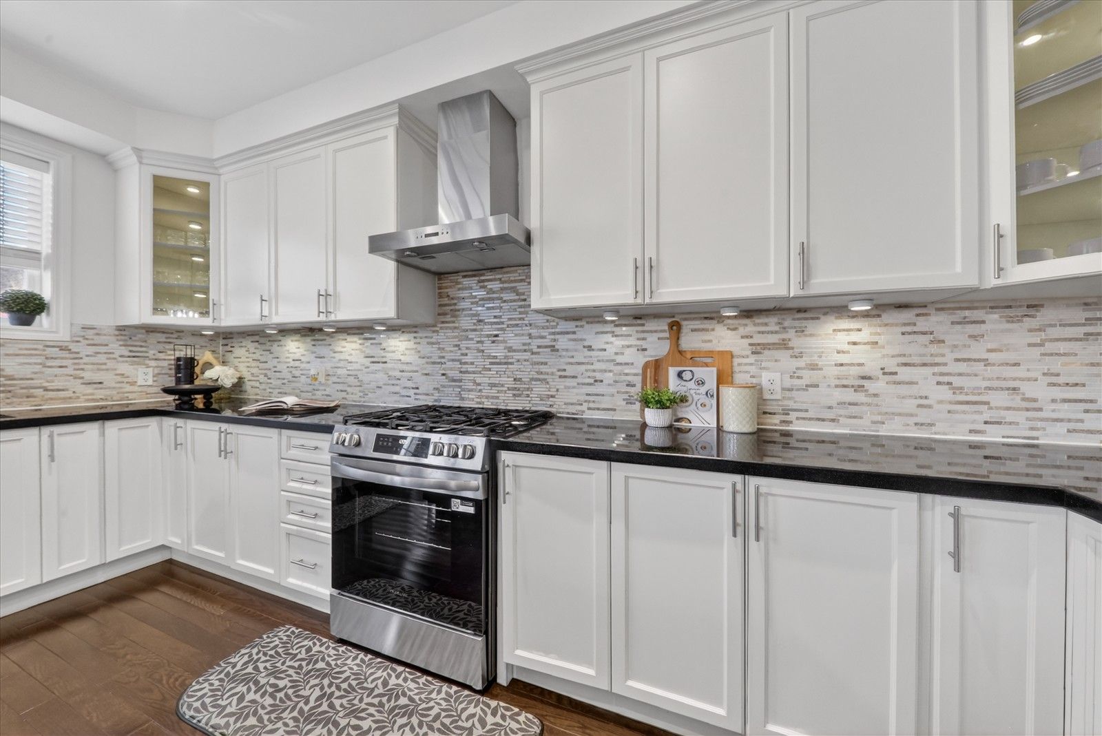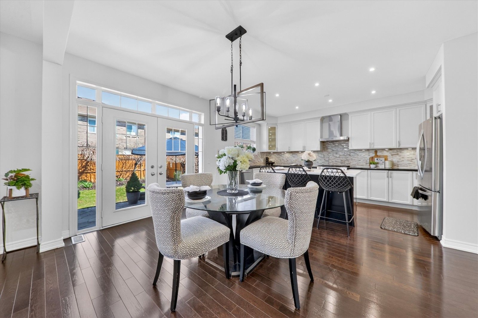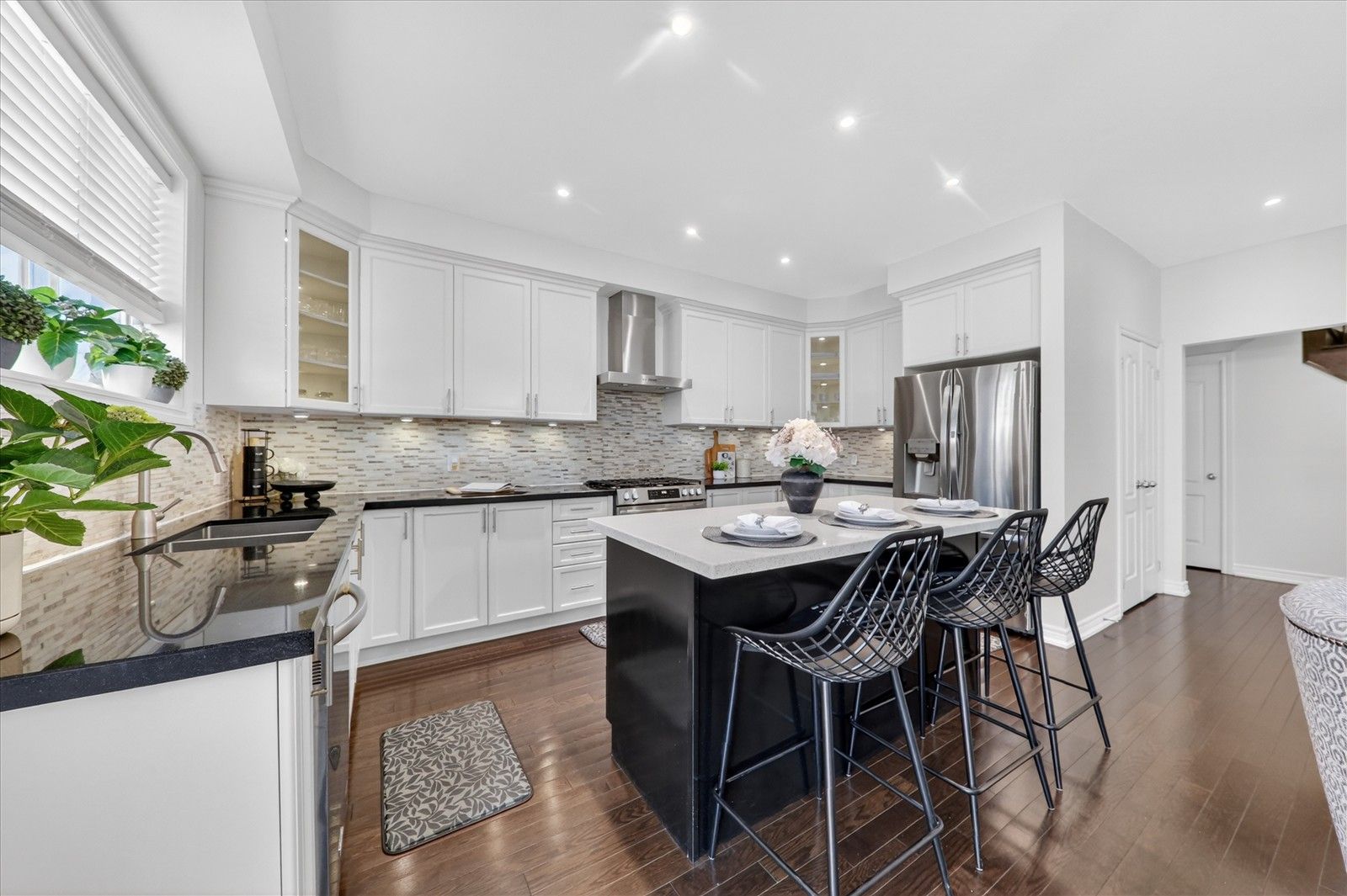 • Chef-inspired kitchen with quartz countertops and spacious eat-in area.
