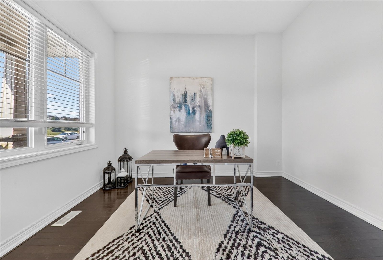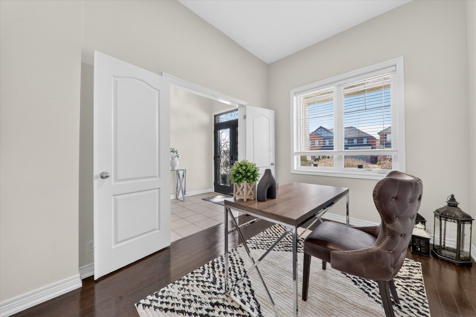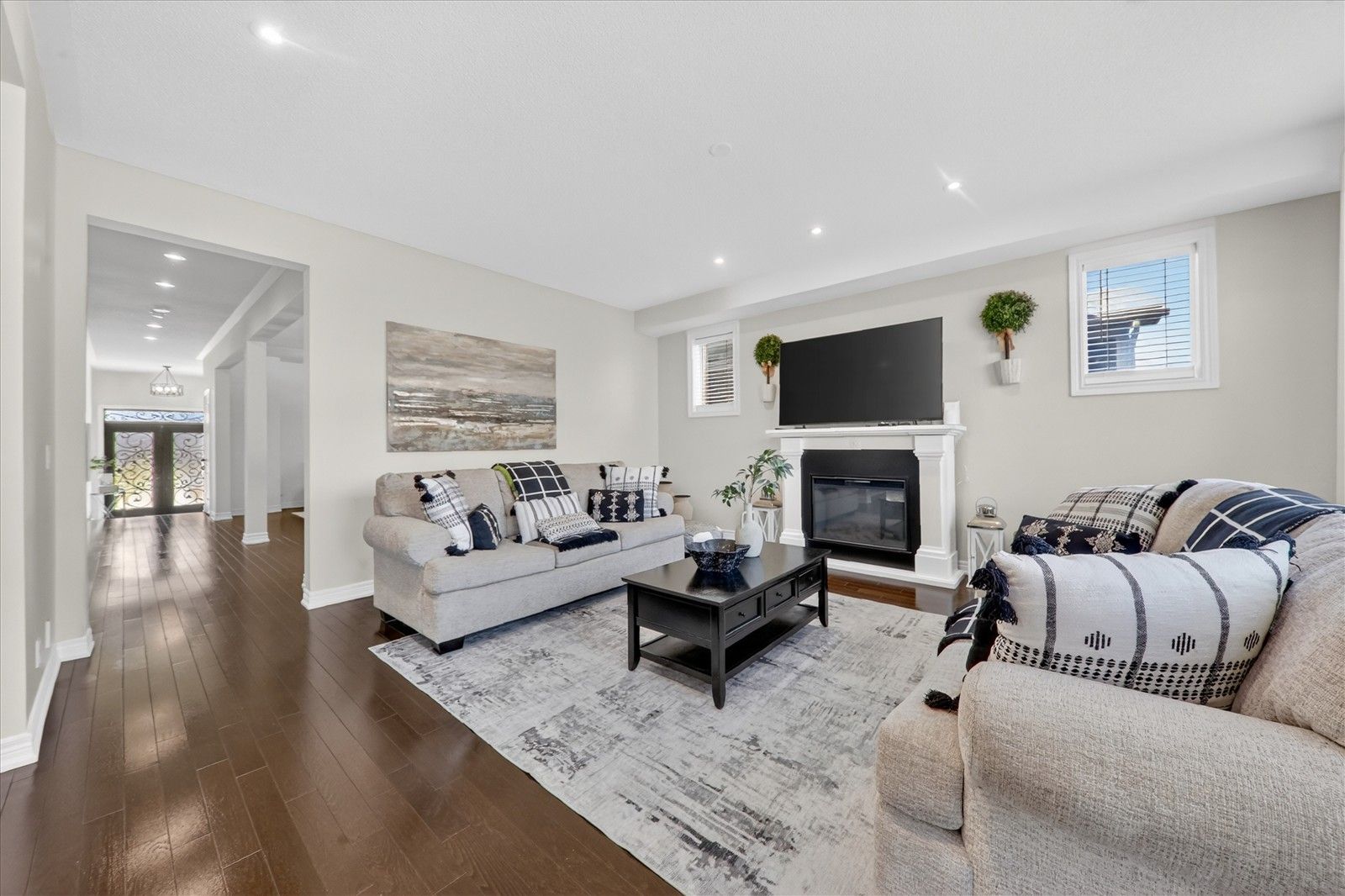 • Custom oak staircase and rich hardwood flooring add elegance.
