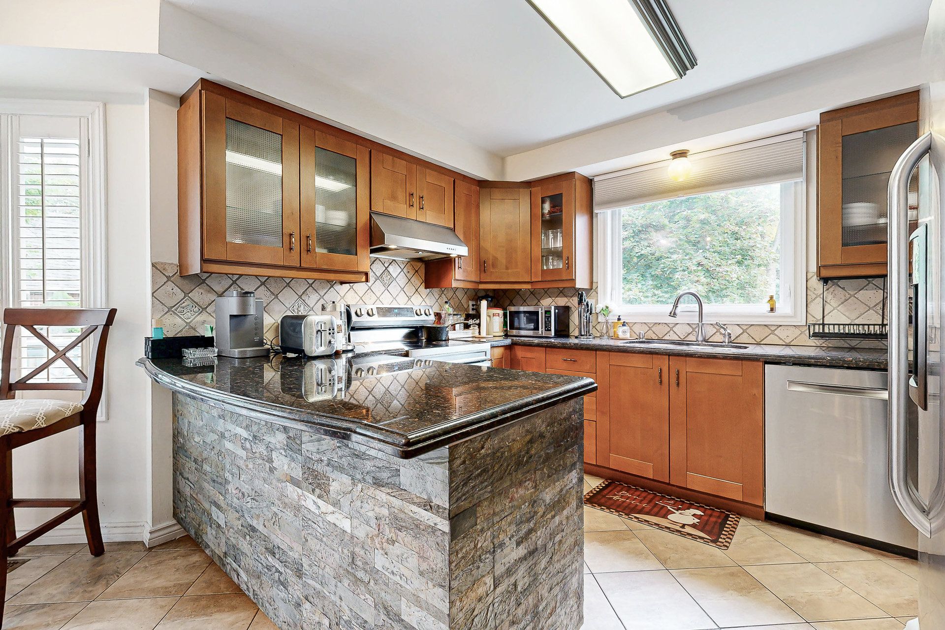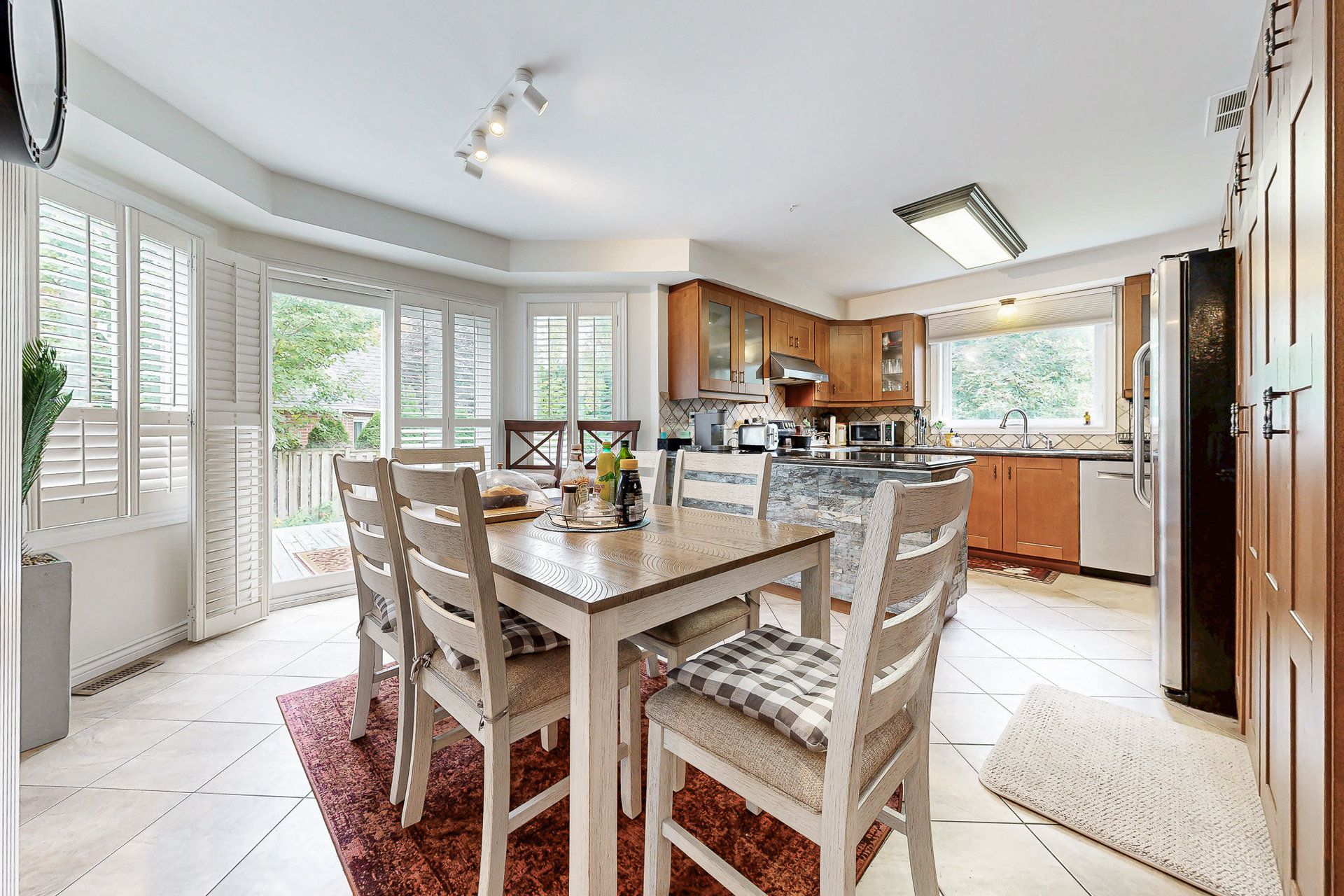 • Gourmet kitchen with granite counters and access to the deck.
