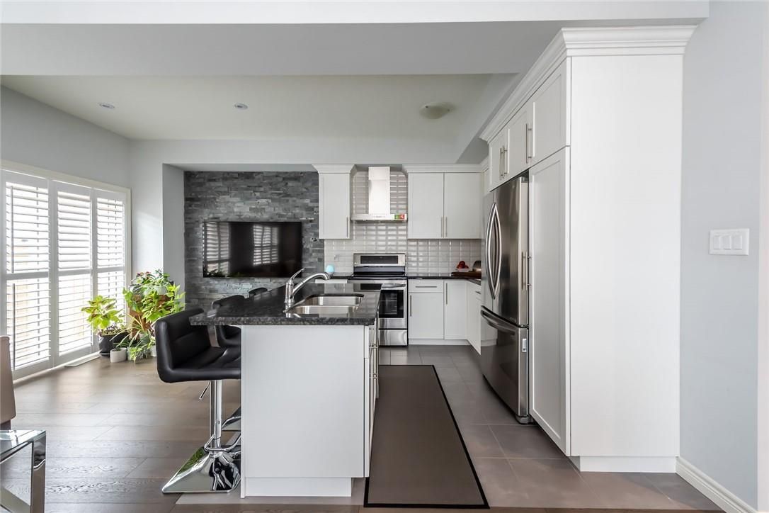 This pristine, meticulously maintained 3 bdrms, 2 1/2 bath, town-home features modern and stylish finishes, located in one of most sought after sites "shoreview place". Welcoming contemporary open-concept main floor provides vibrant space featuring elegant 9ft ceilings, luxury living room boasting stylish stone wall, engineering hardwood flooring, california shutters, pot lights, & high-end finishes. Modern open concept kitchen features upgraded extended white cabinetry, stainless steel appliances, granite countertops, large island with double sink, backsplash and ample cupboard space. An elegant oak staircase leads upstairs to second level with bedroom level laundry. Spacious primary bedroom features a 5-piece ensuite with separate shower, upgraded tiles, along with walk-in closet and large window for loads of natural lighting. 2nd floor also features 2 additional bedrooms and 4-piece main bath. An unspoiled basement with rough-in bath allows freedom to finish to your taste and style. Fantastic location in the desirable stoney creek lakefront community with steps to spectacular views of lake ontario. You can also take a walk along the waterfront trail or dip in the lake from the beach strip located just steps from a complex. End unit with easy access through side to spacious back yard. Minutes from city amenities, qew access, schools, shopping, restaurants, parks, walmart power centre and go confederation station. Pictures taken before current resident moving in. Rsa.