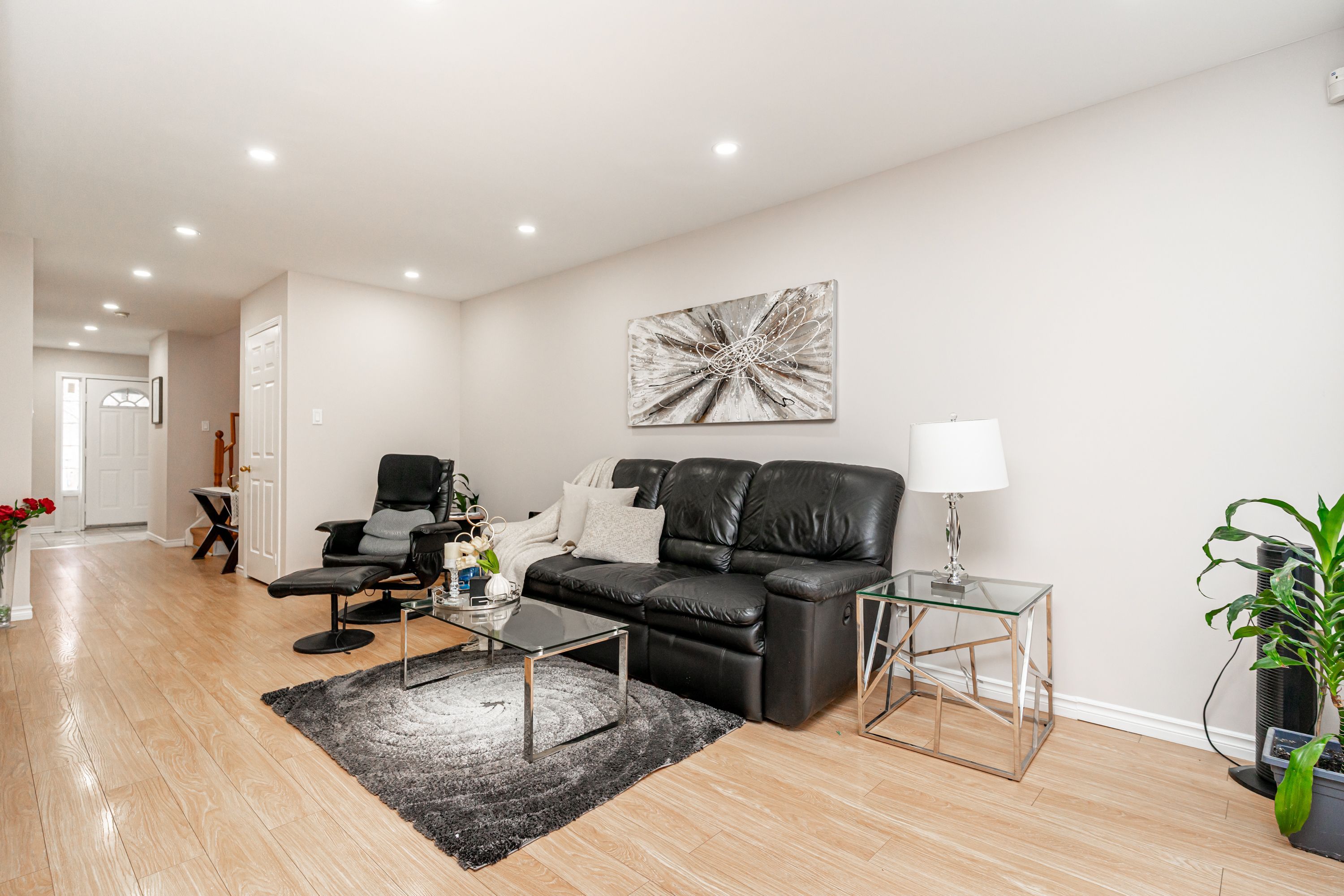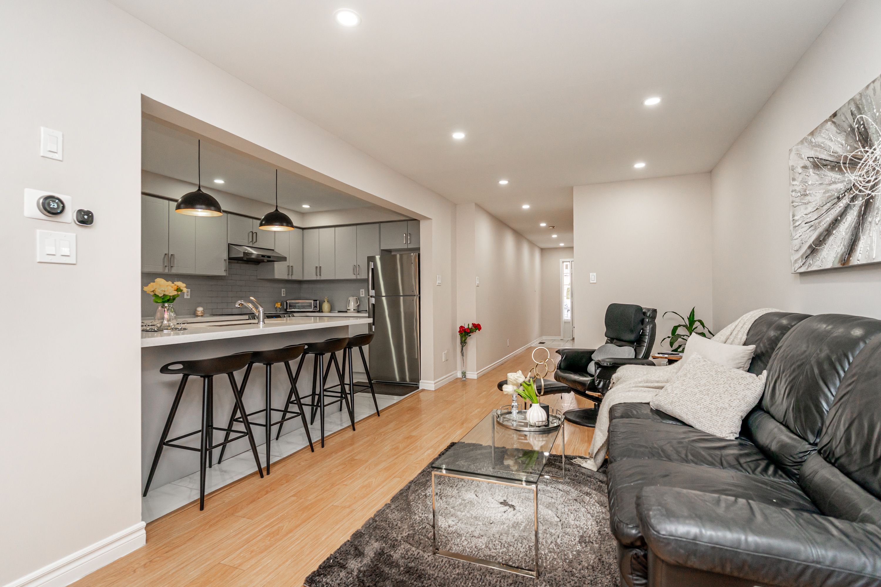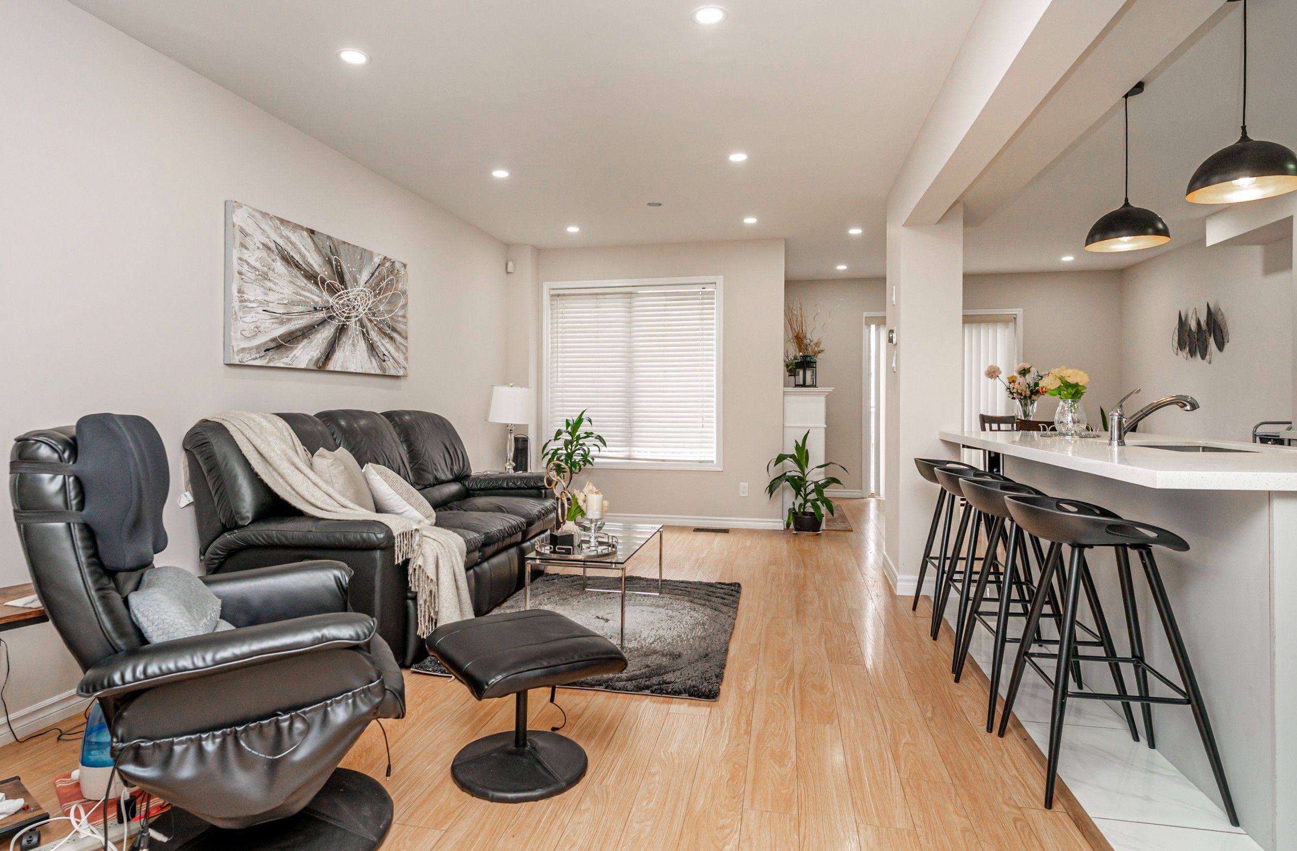 • Spacious living room and modern kitchen with quartz countertops and breakfast bar.