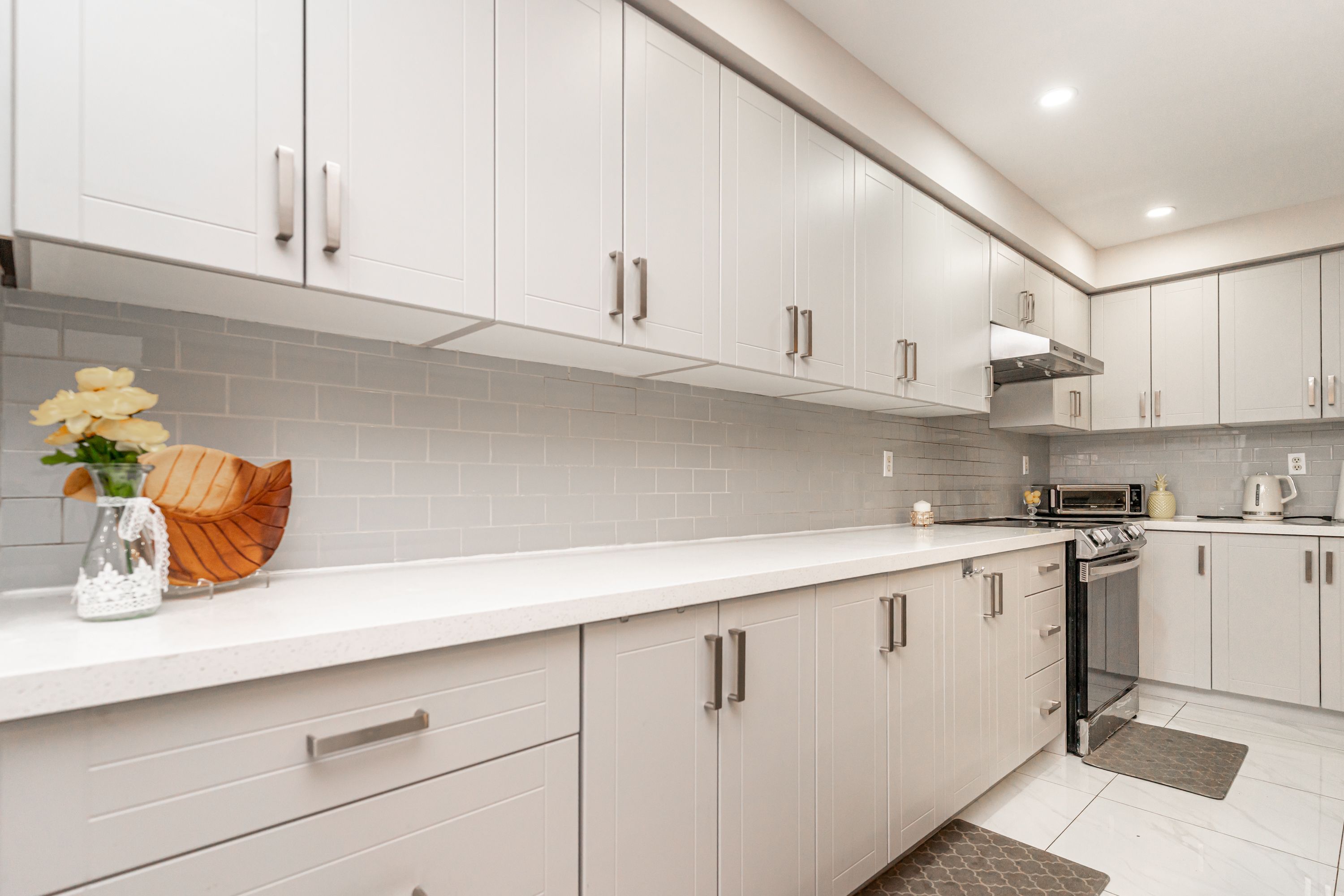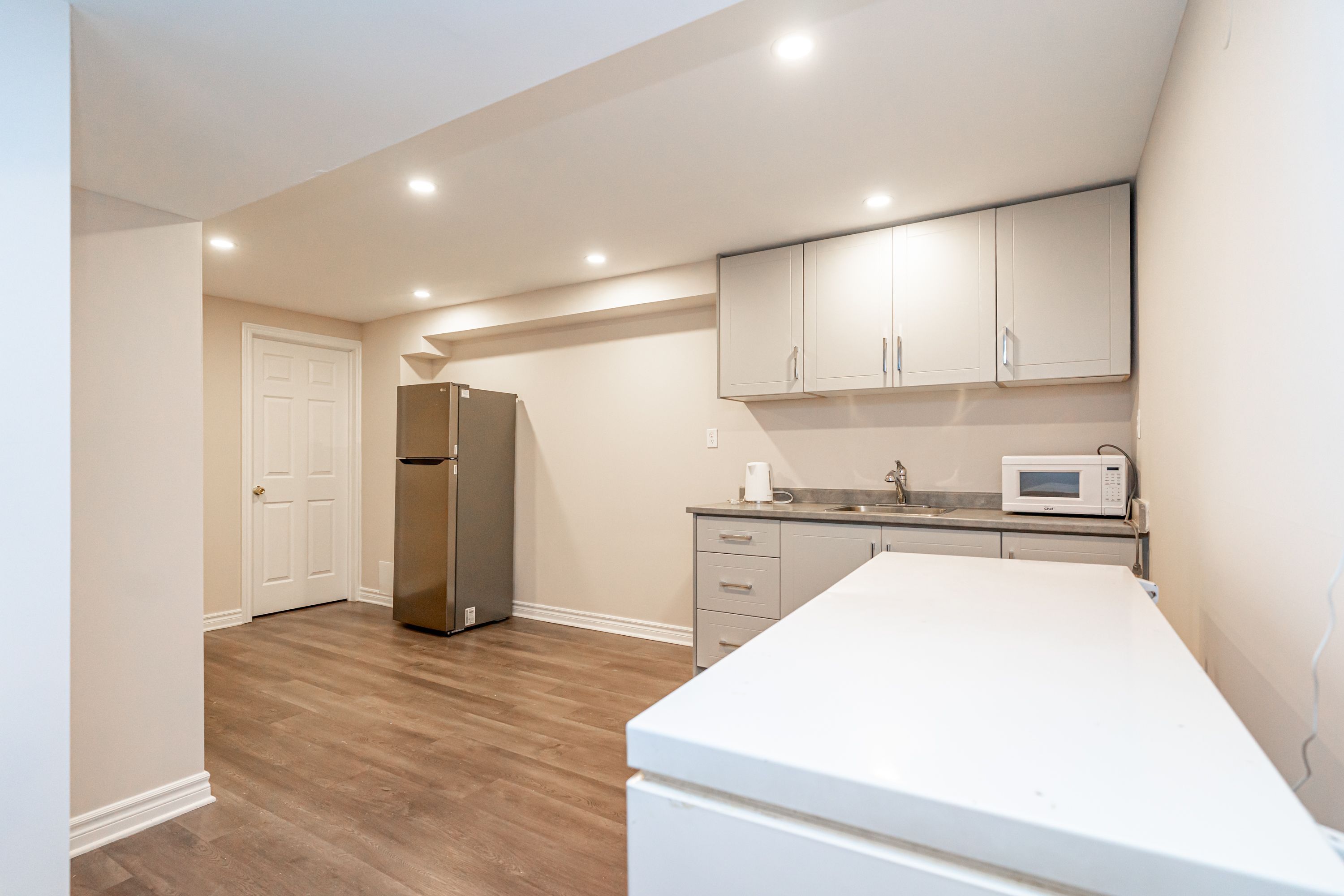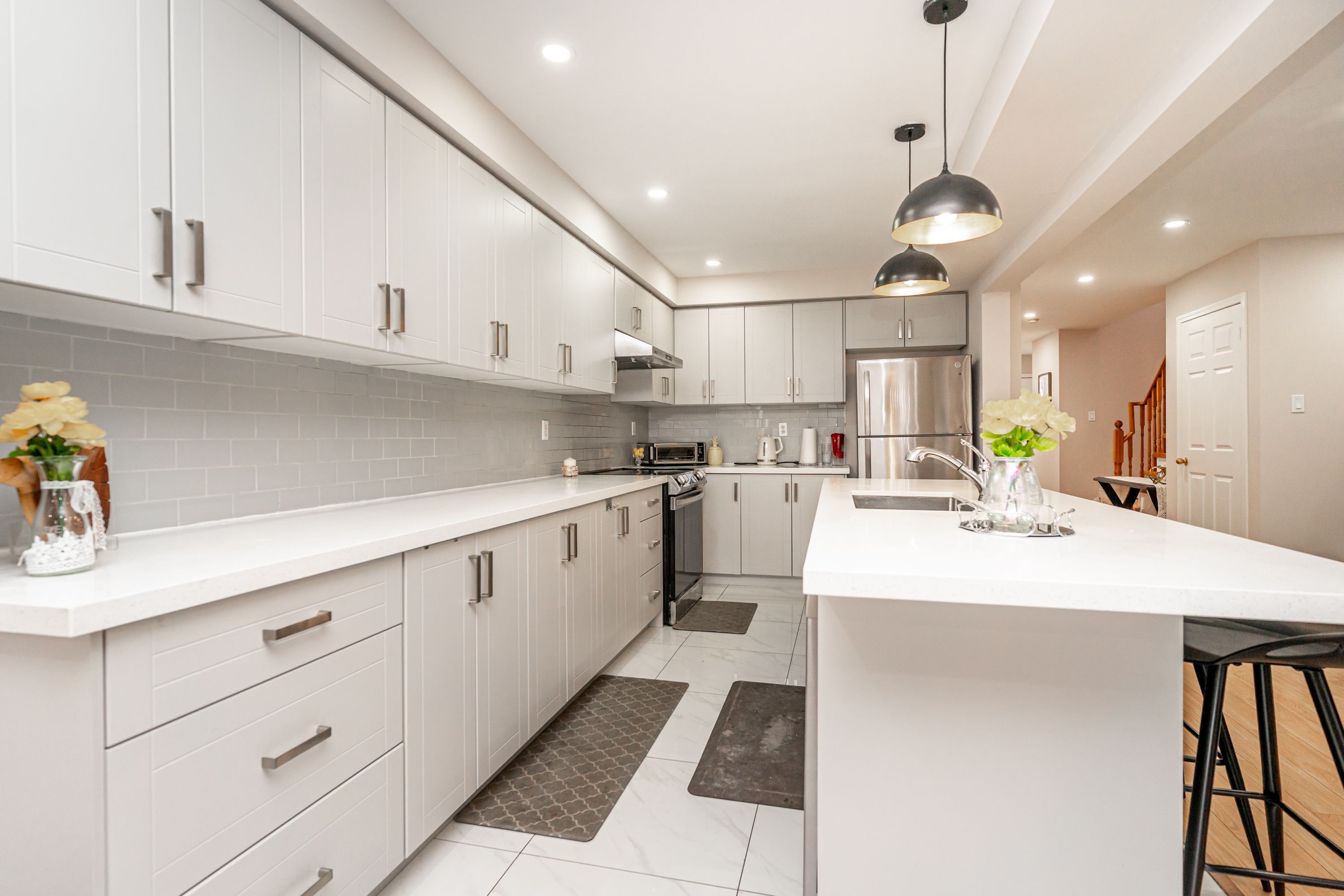 • Spacious living room and modern kitchen with quartz countertops and breakfast bar.