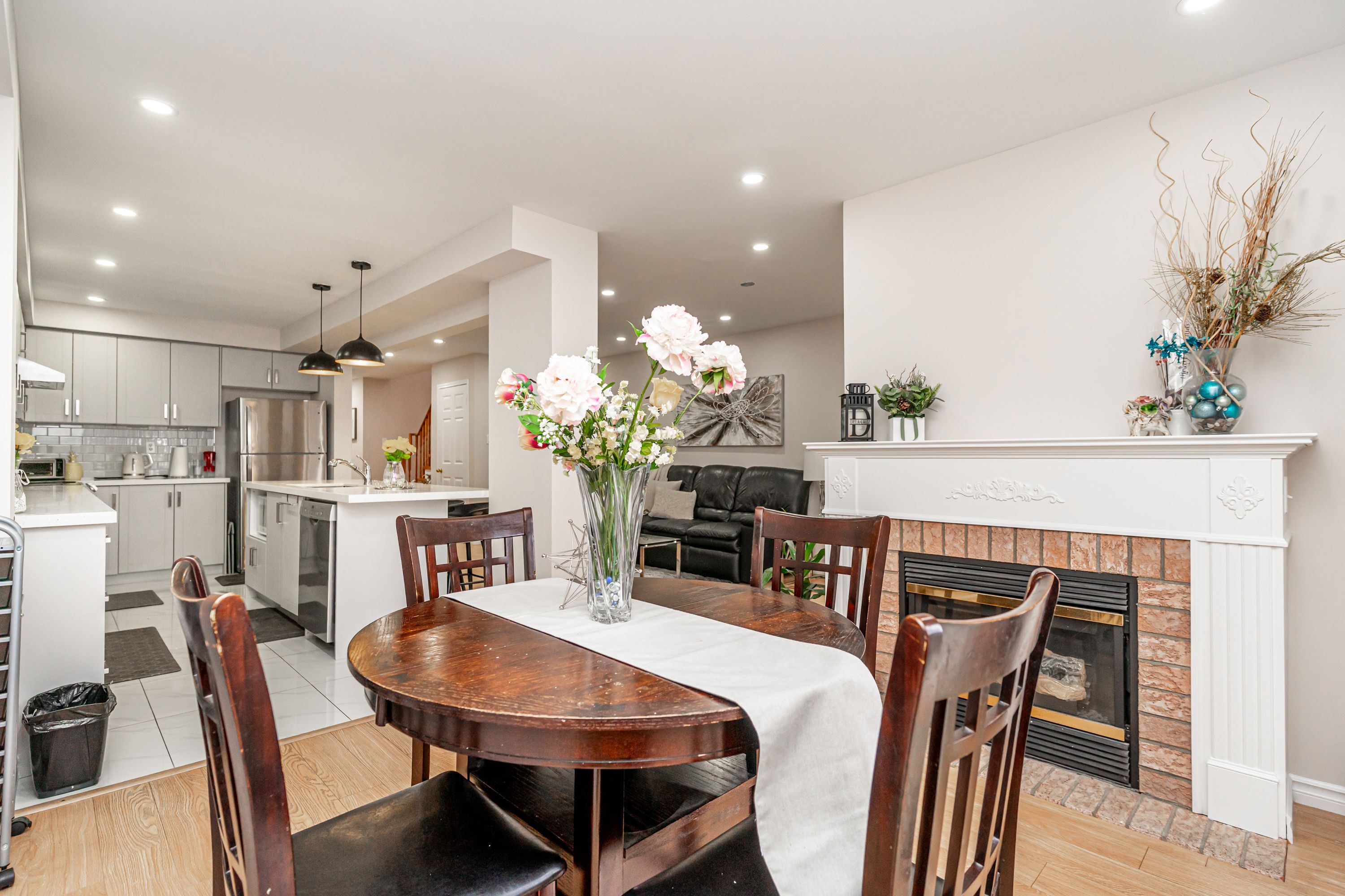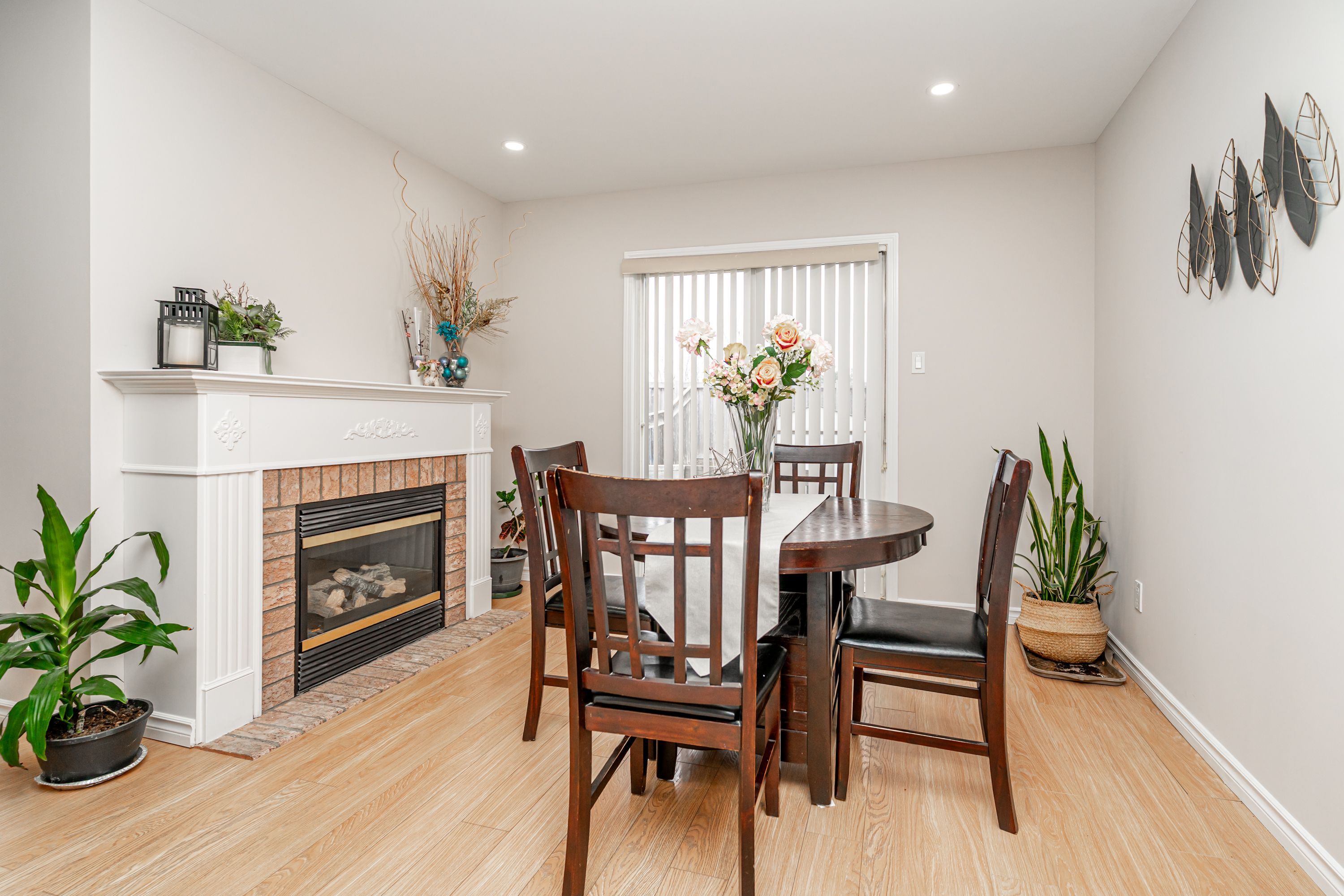 • Cozy dining area with fireplace, leads to a well-maintained backyard.