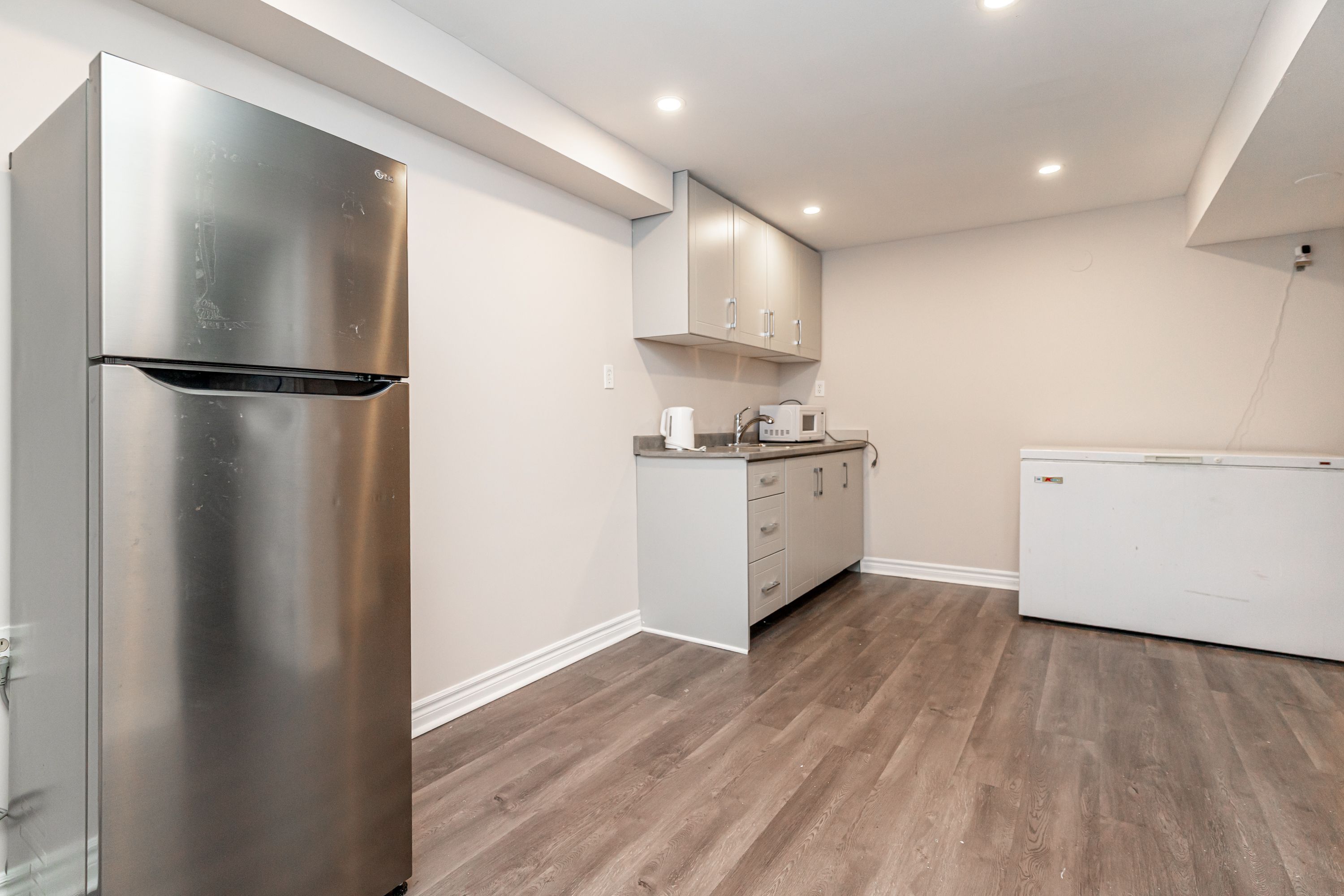 • Finished basement with rec area, two bedrooms, and kitchenette for guests.
