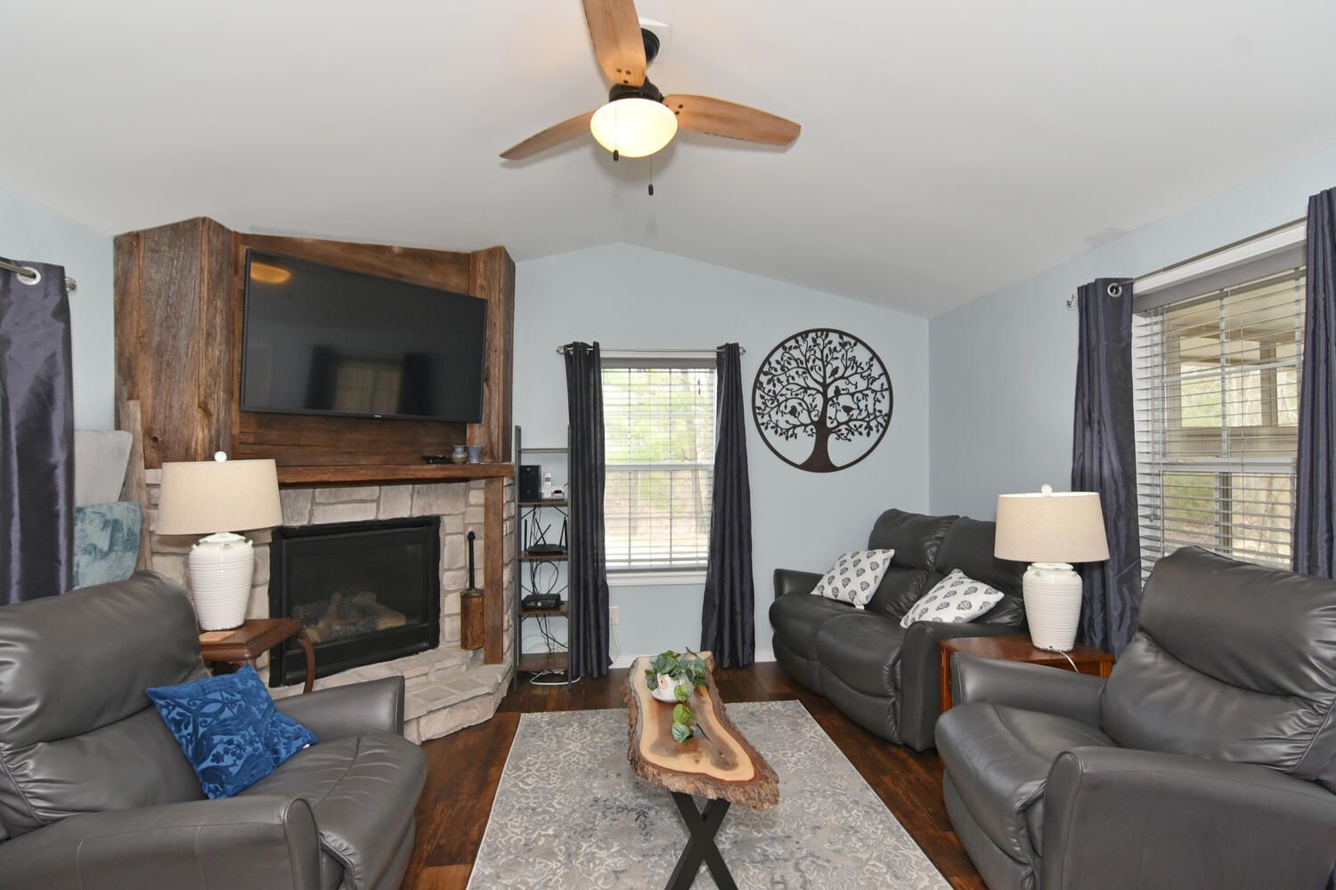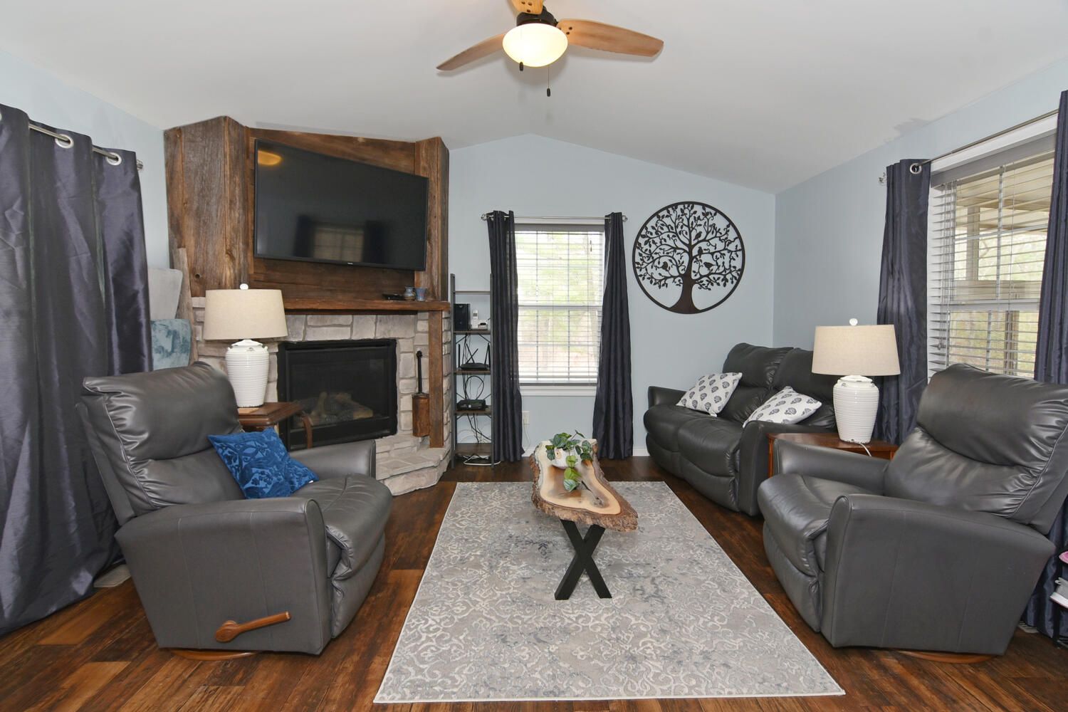 • Inviting living room with cathedral ceiling and gas fireplace.