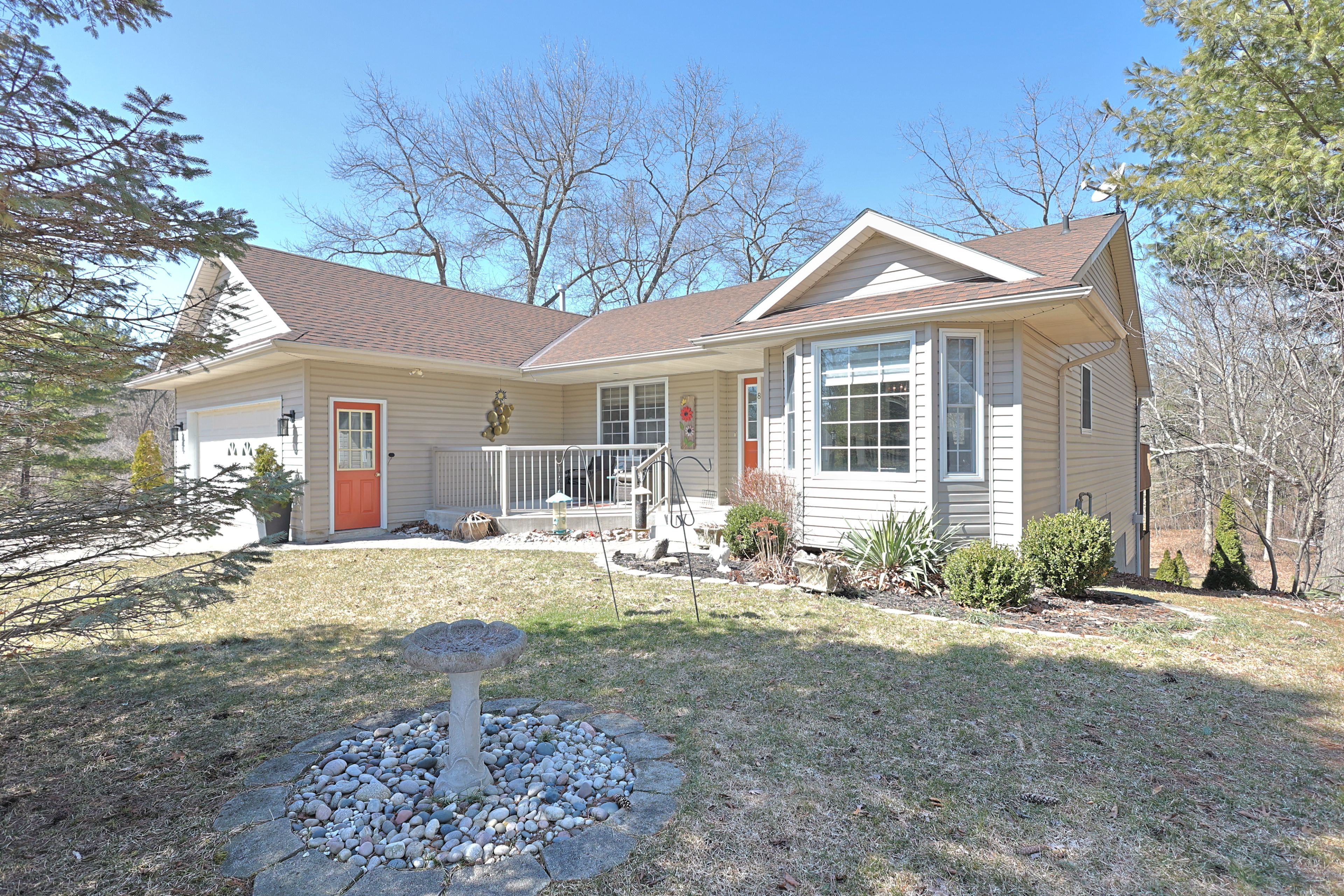 Thinking about retirement but don't want to "settle" when downsizing? Well your in luck! Welcome to northville estates and this fantastic site built bungalow. 1440 sqft main floor, walk out lower lever, attached heated garage and backing onto a mature treed setting. At first glance you notice the property has great curb appeal from the interlocking brick drive, landscaped gardens, large yard space and vinyl siding. The interlocking brick walkway leads to a concrete front patio; great for enjoying your morning coffee. Inside the home offers an open concept floor plan flowing with natural light. The updated kitchen features white shaker style cabinetry, lots of storage in the pantry cupboard, dark stainless steel fridge and gas stove. Eating area off the kitchen overlooks the front yard. The great room with cathedral ceilings has room for separate dining and living areas plus patio doors leading to the back deck that features a power shade awning & gas bbq. Main floor primary suite includes your spacious bedroom with windows overlooking nature, ensuite with double vanity and jetted tub, walk in closet plus wall closet for storage. Guest room for family to visit. Mudroom with laundry off the heated oversized garage. 27' deep allows for cars and workbench! Downstairs you have a fully finished walkout lower level. The family room with gas fireplace and patio doors leading to the back deck is spacious enough for a family room, games area or billiards table. The hobbyist will love the crafting room; big enough for quilting, stain glass, or studio space. The lower level includes storage in the utility room and a powder room to finish off the space. Outside the back yard has a mature tree setting with no rear neighbors and the deck space overlooks the natural setting. Northville estates is a leased land 55+ community with monthly land fees of $578. 06 which includes the park fee, taxes, garbage and access to amenities like the pool, clubhouse, park events and mini golf.
