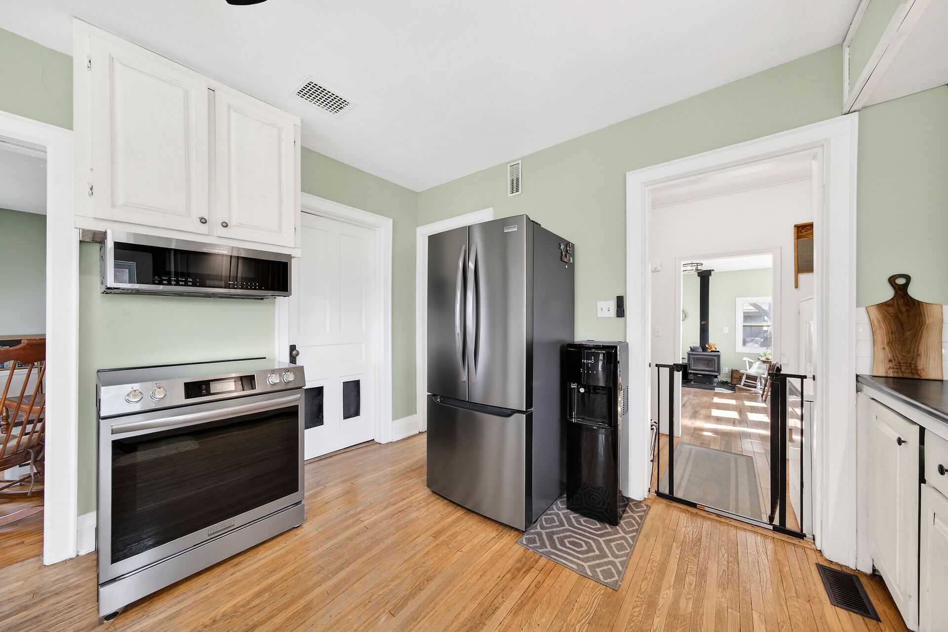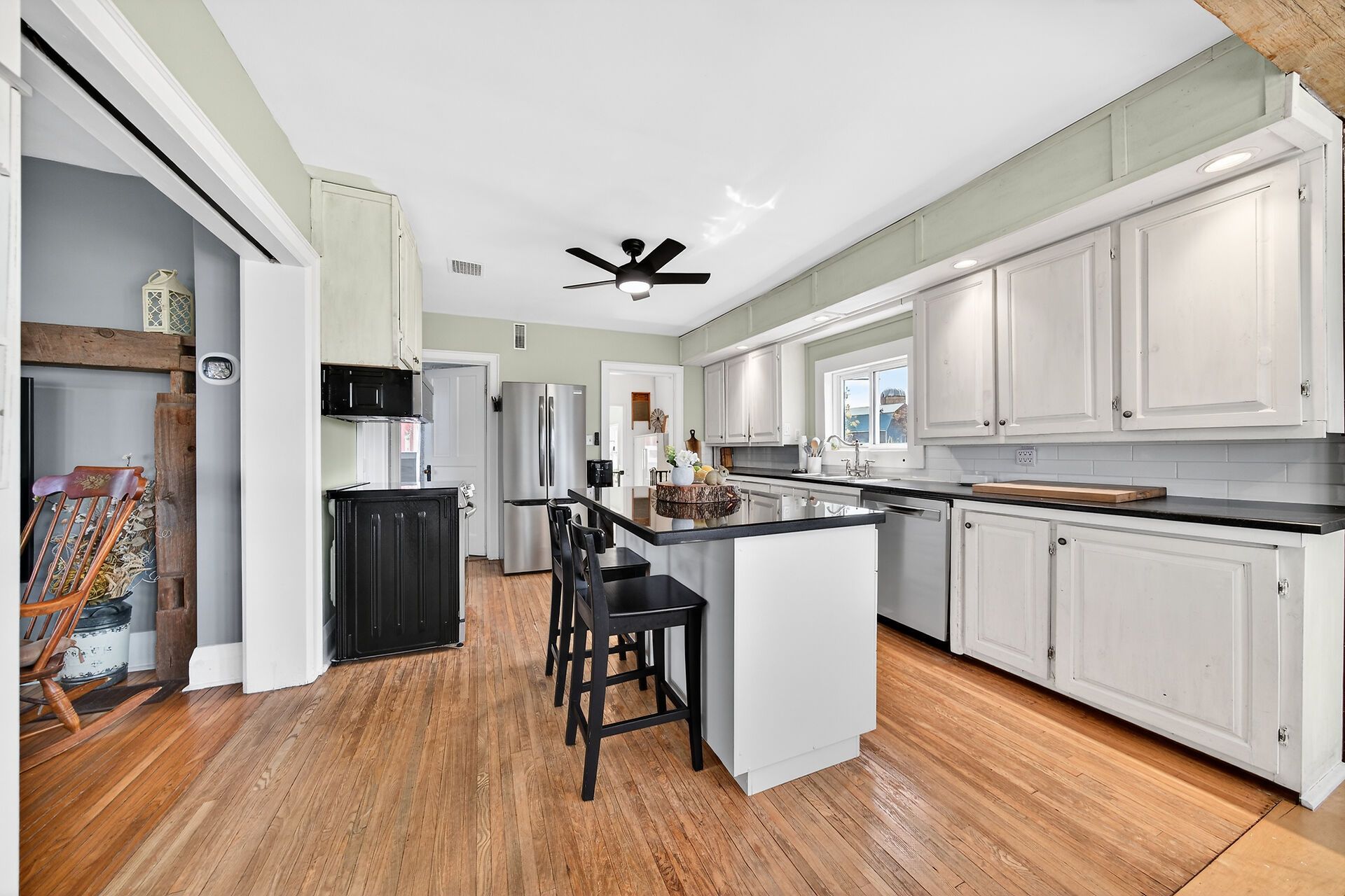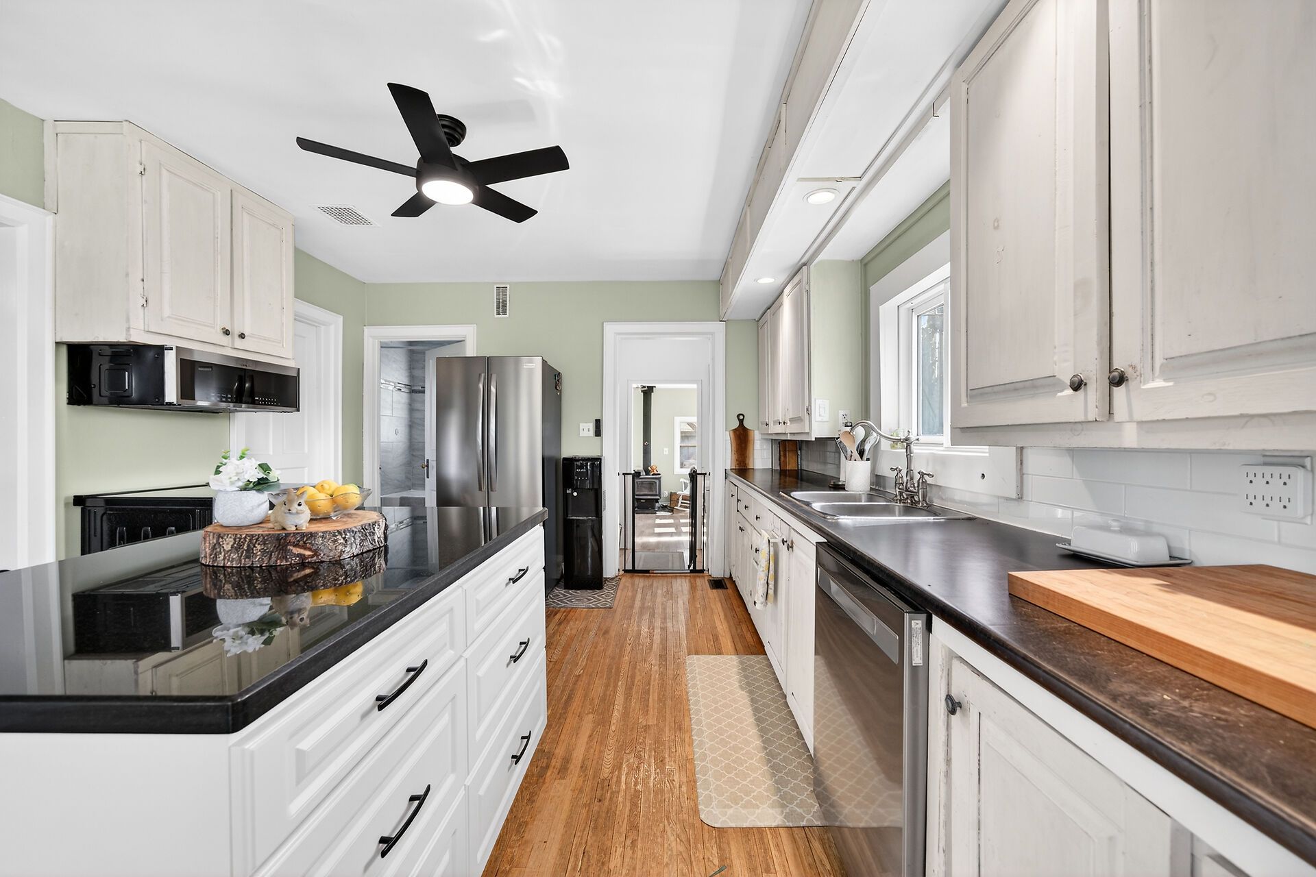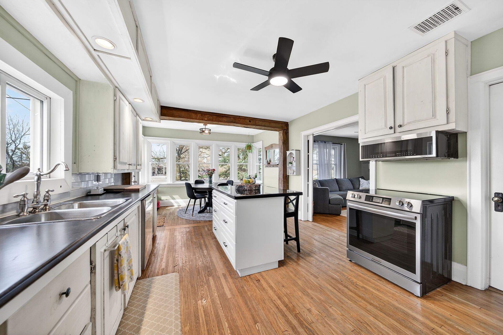 • Updated eat-in kitchen with granite countertops and rustic accents.