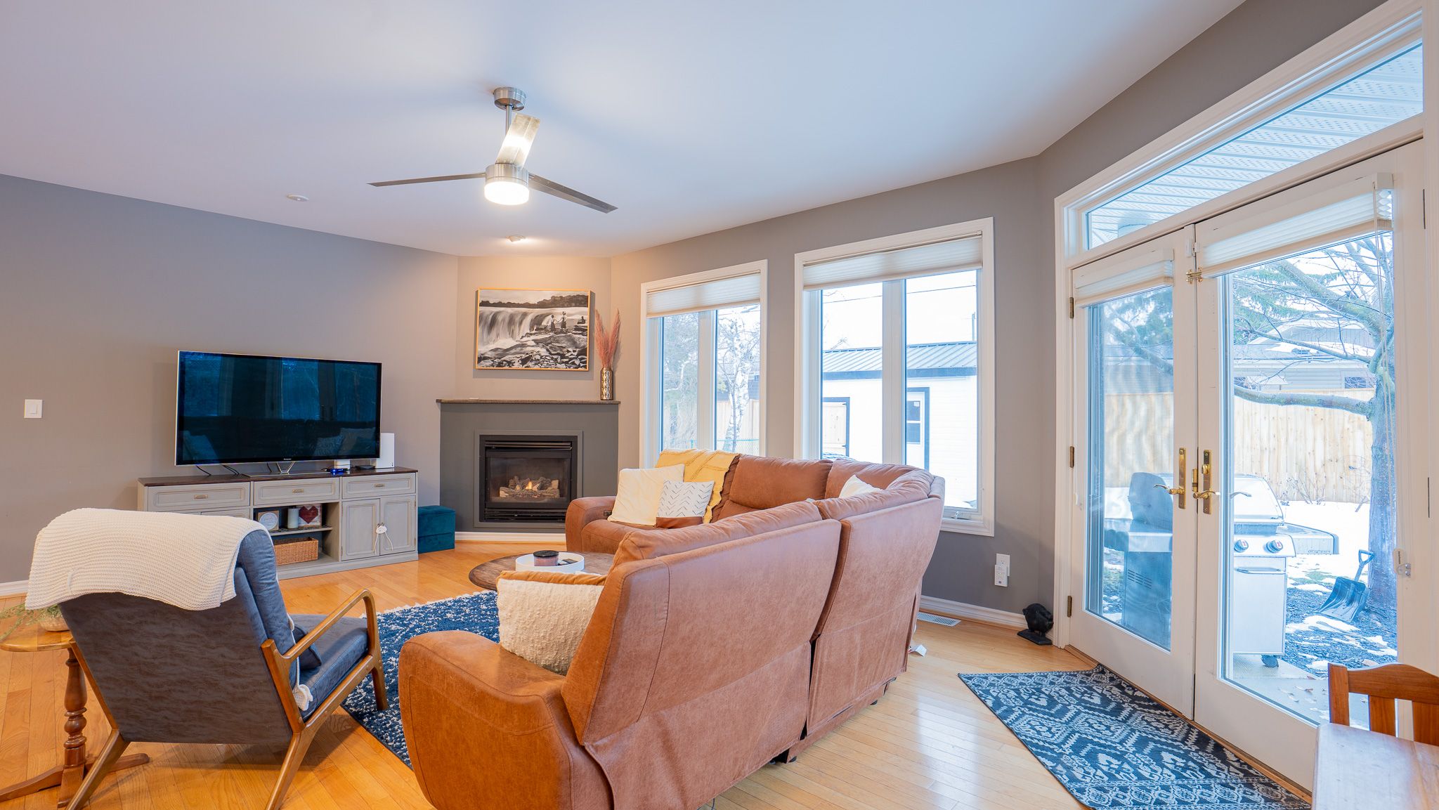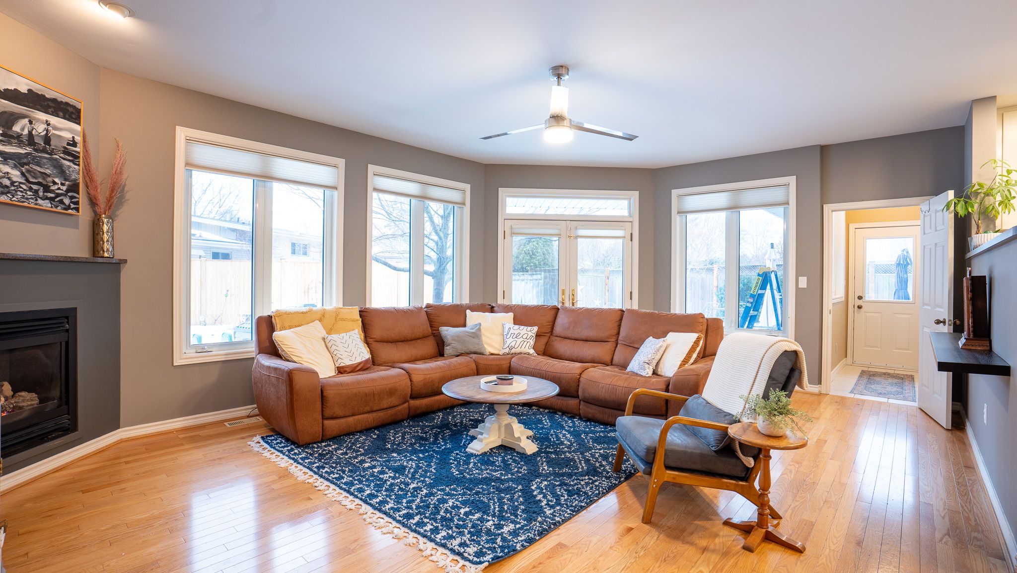 • Cozy great room with gas fireplace and large windows overlooking the backyard.
