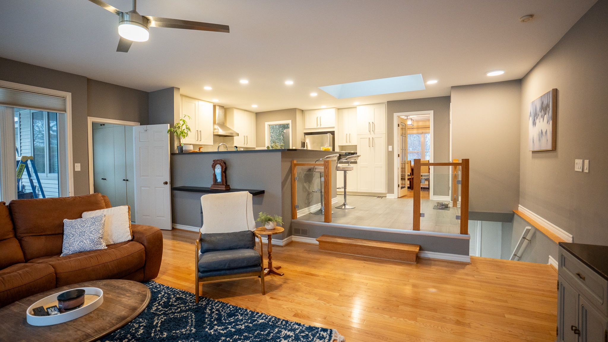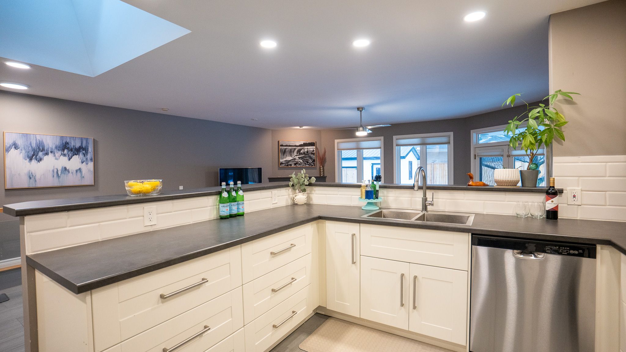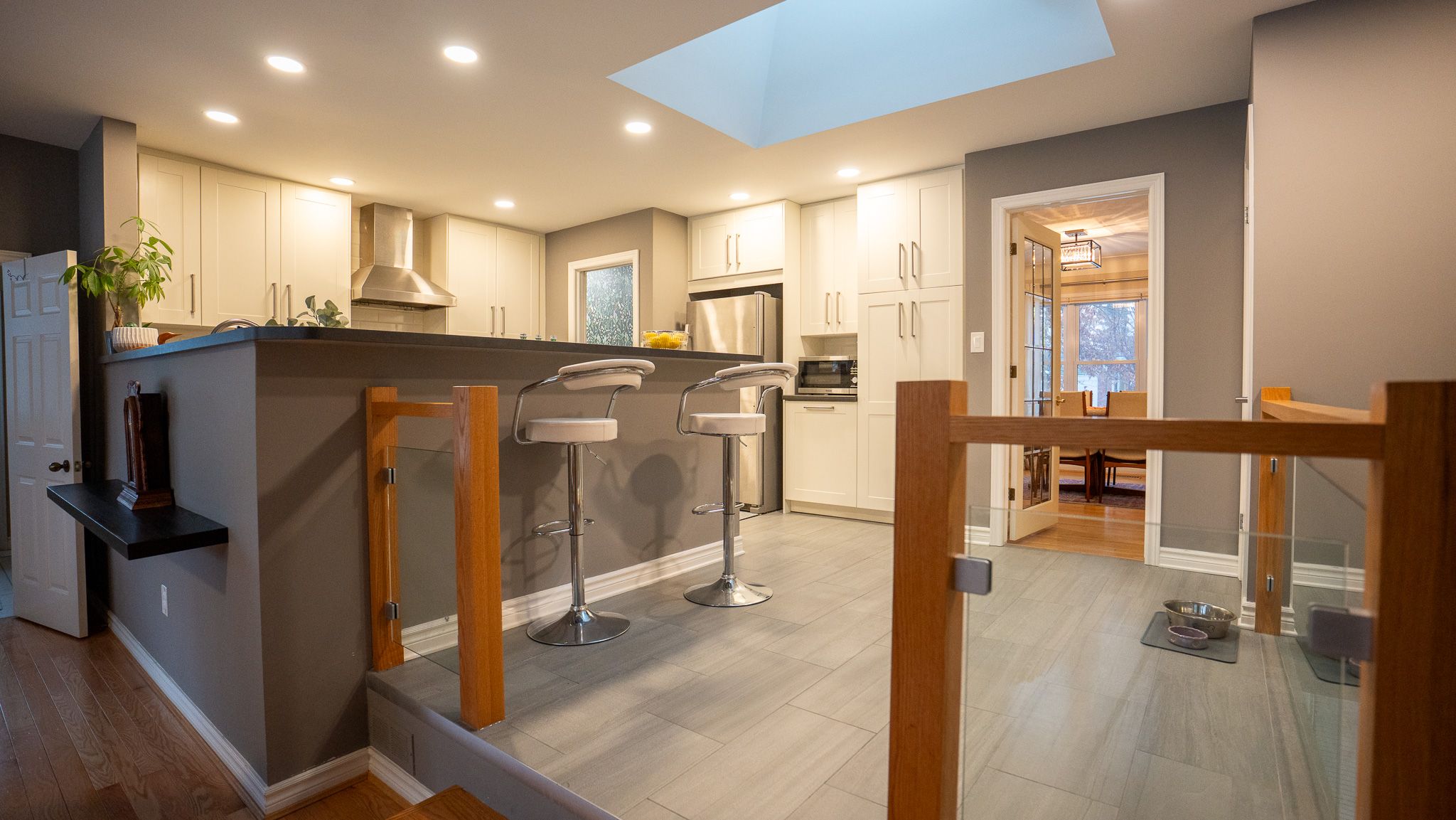 • Modern kitchen features an island, skylight, and walk-in pantry.