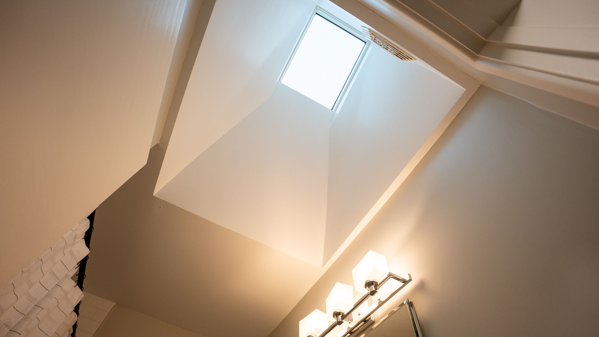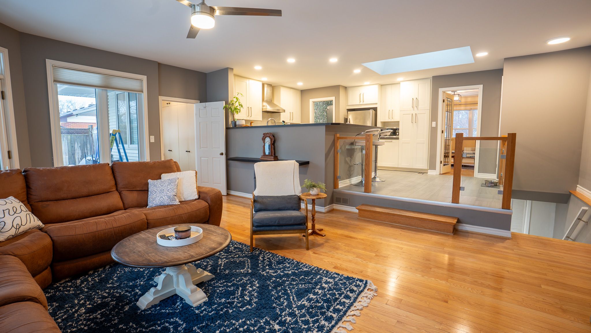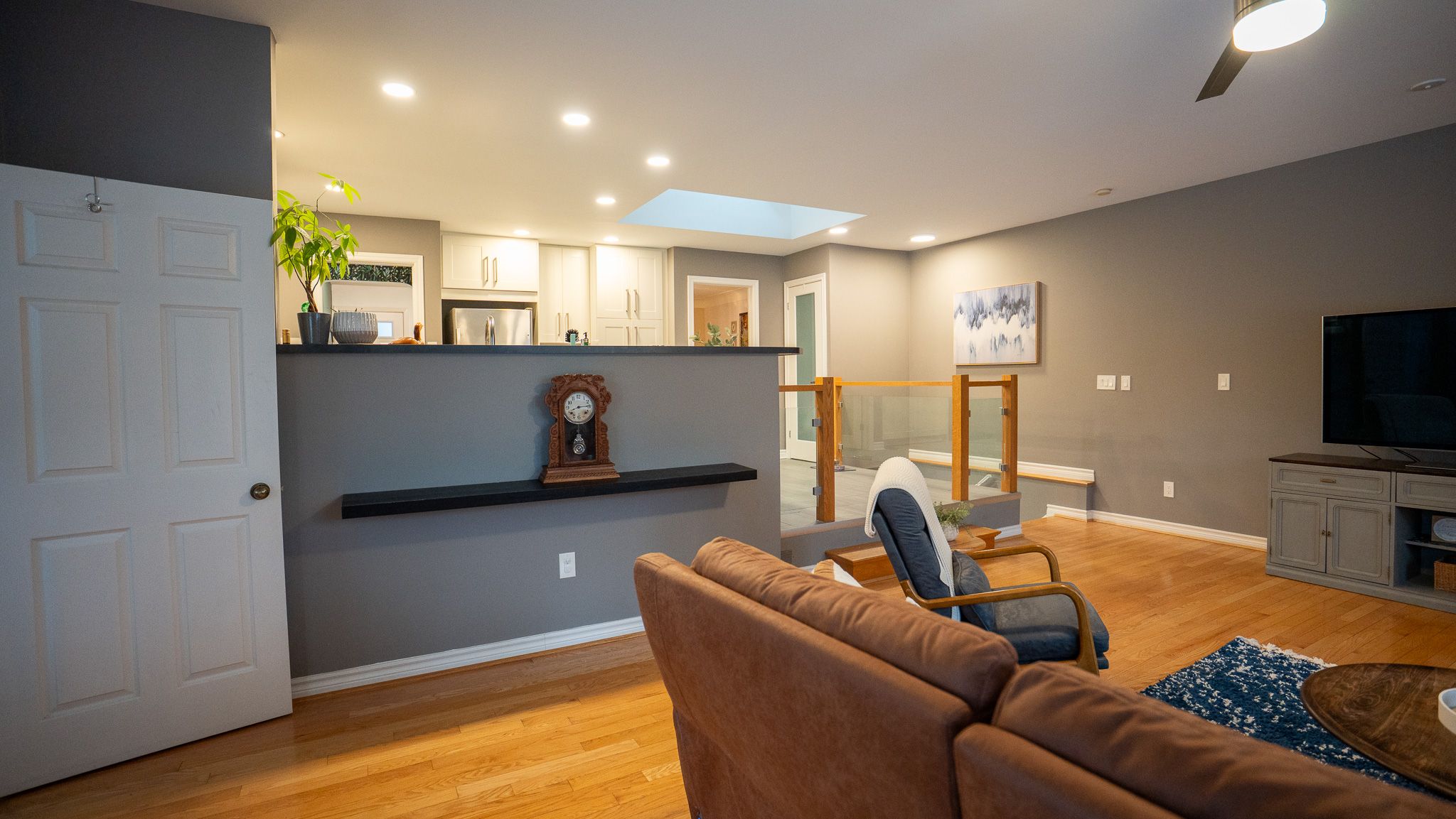 • Modern kitchen features an island, skylight, and walk-in pantry.