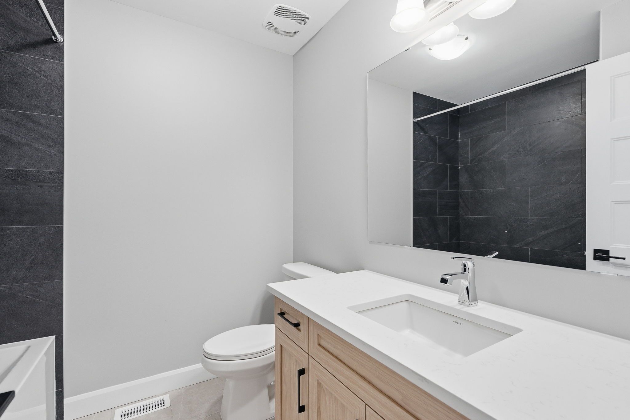 • Modern kitchen with quartz countertops and ample cabinetry.