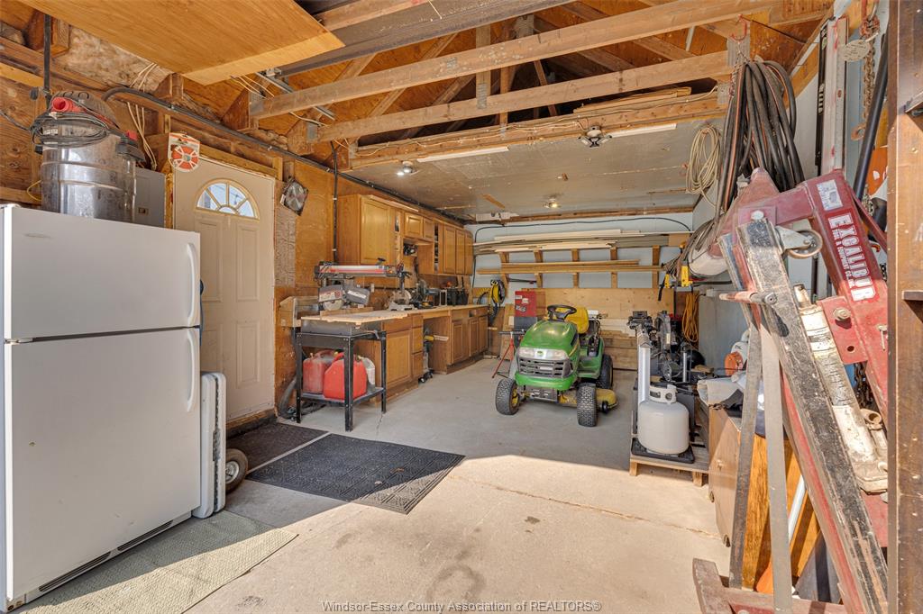 • 1-car garage with workshop area and insulated storage shed for hobbies.