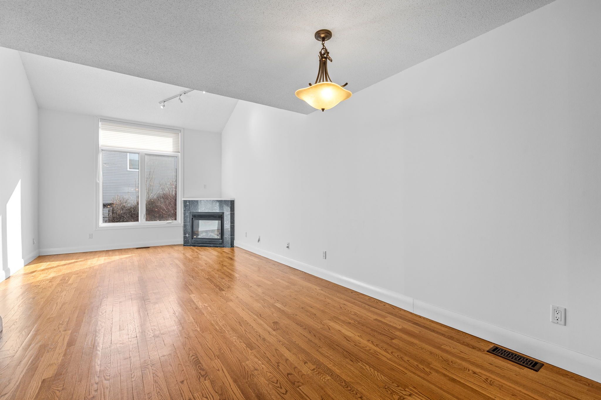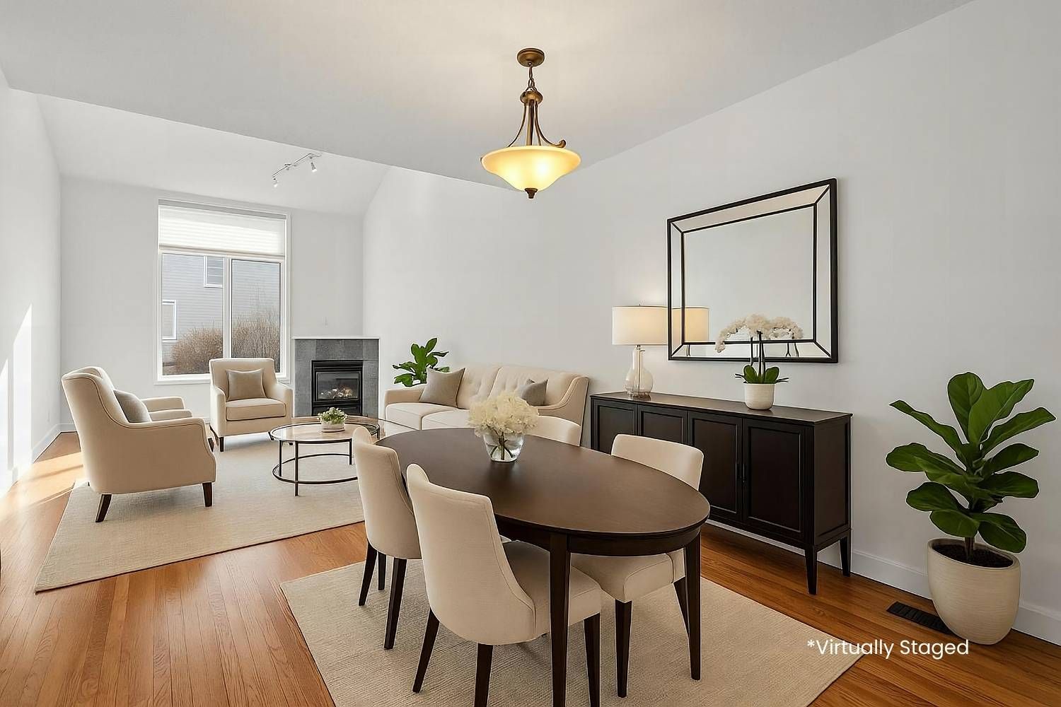 • Open living space with cozy fireplace and rich hardwood floors throughout.
