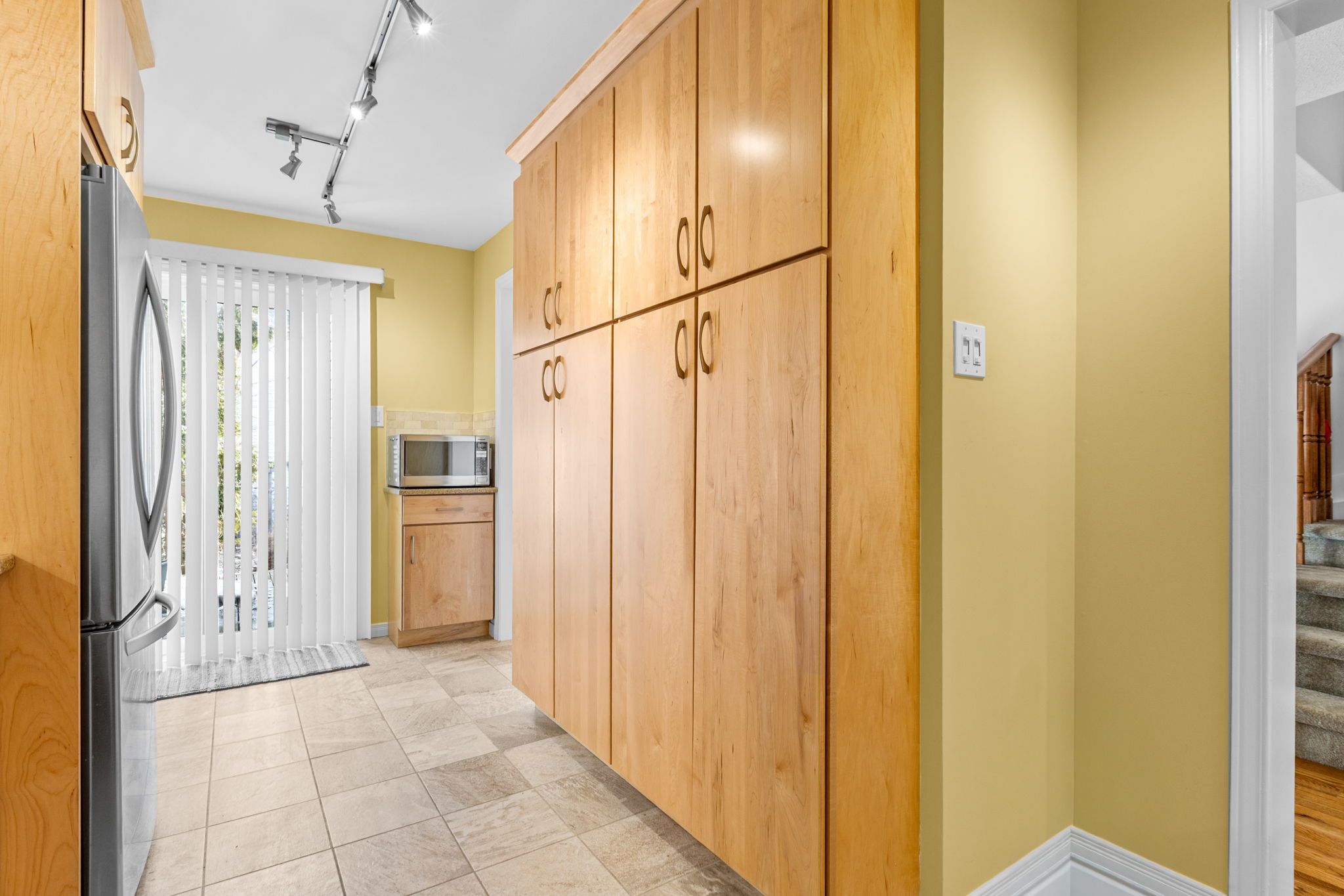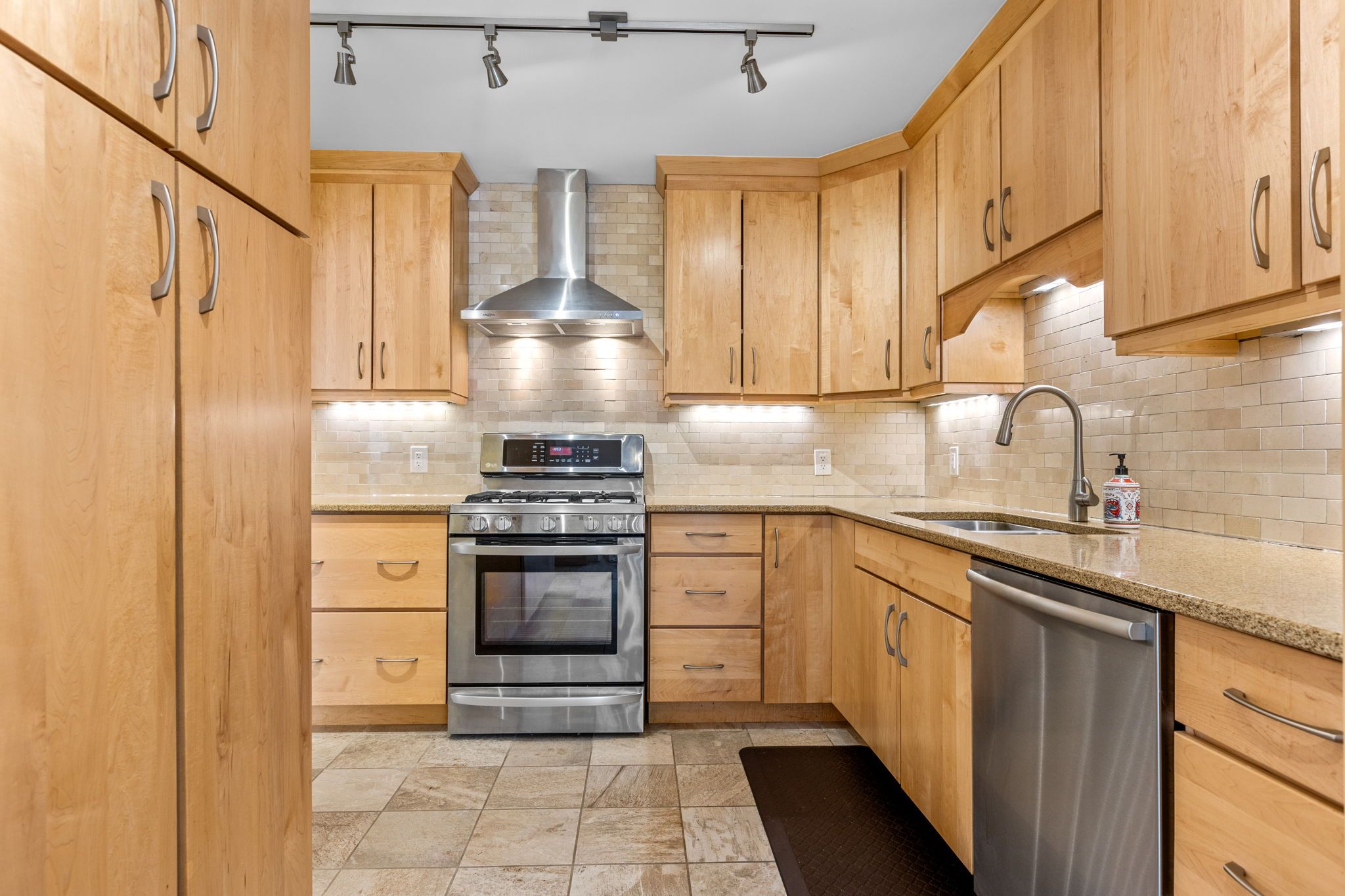 • Fully renovated kitchen with solid maple cabinetry and sleek quartz countertops.