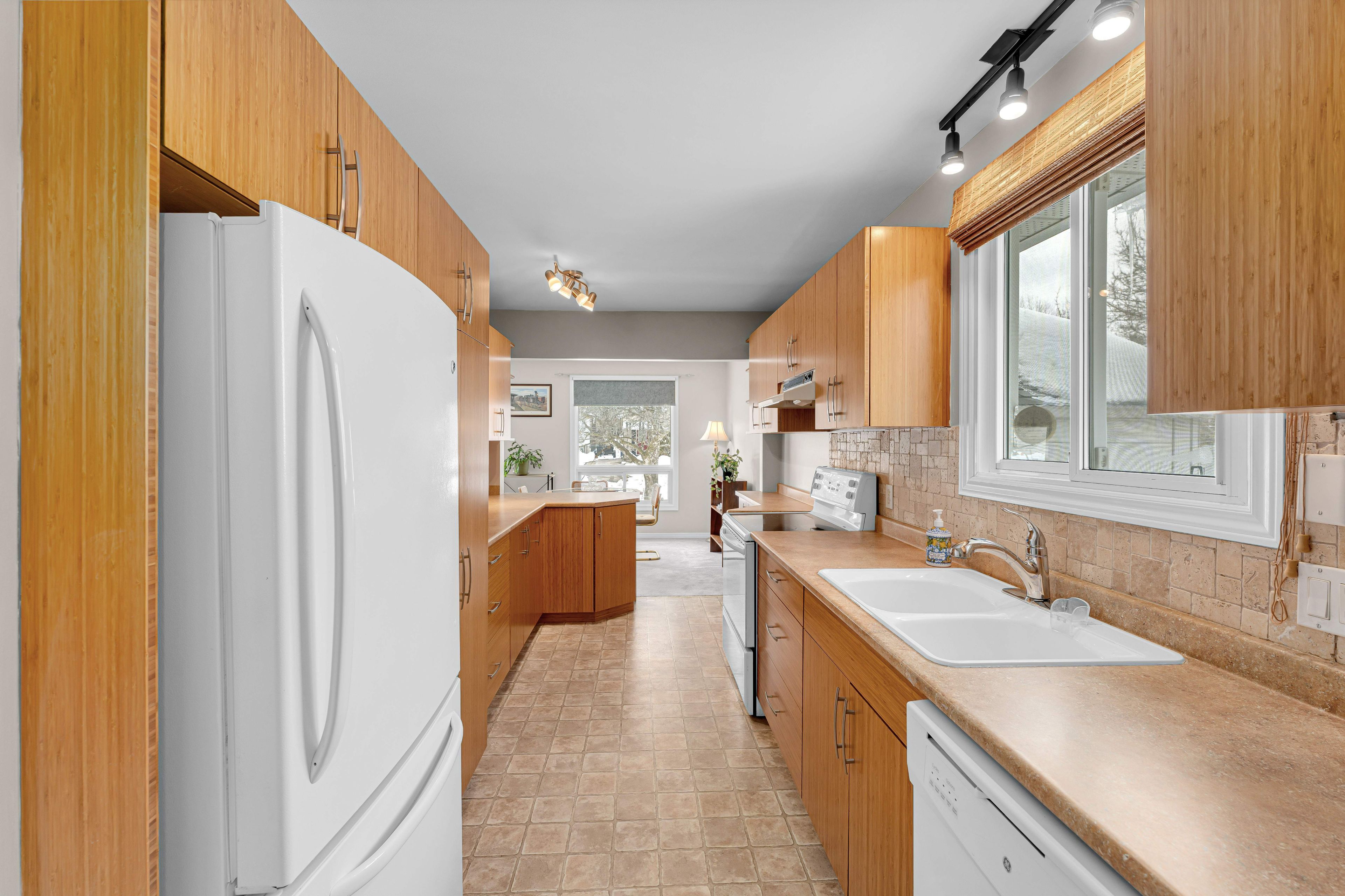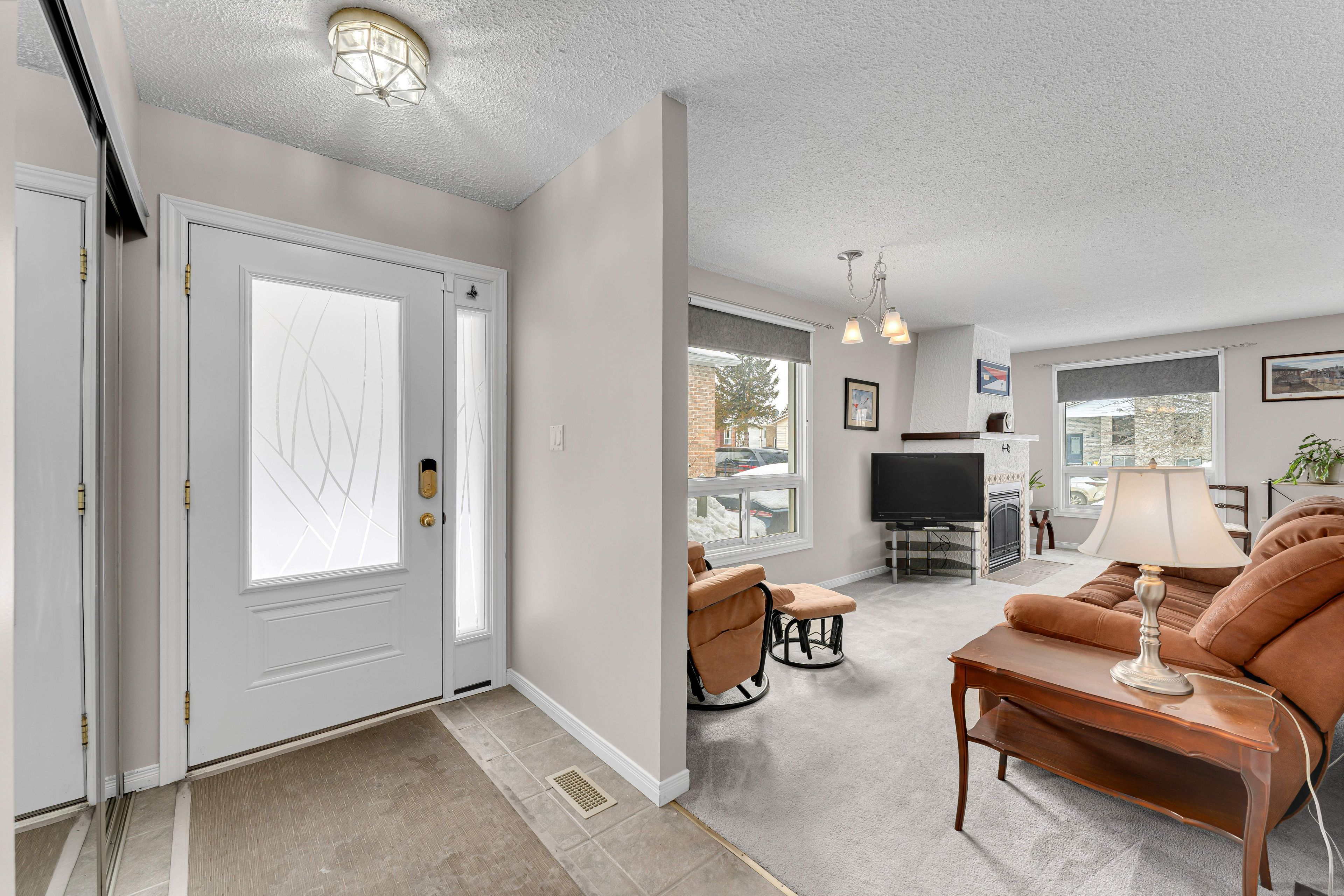 • Cozy gas fireplace in the L-shaped living and dining area.