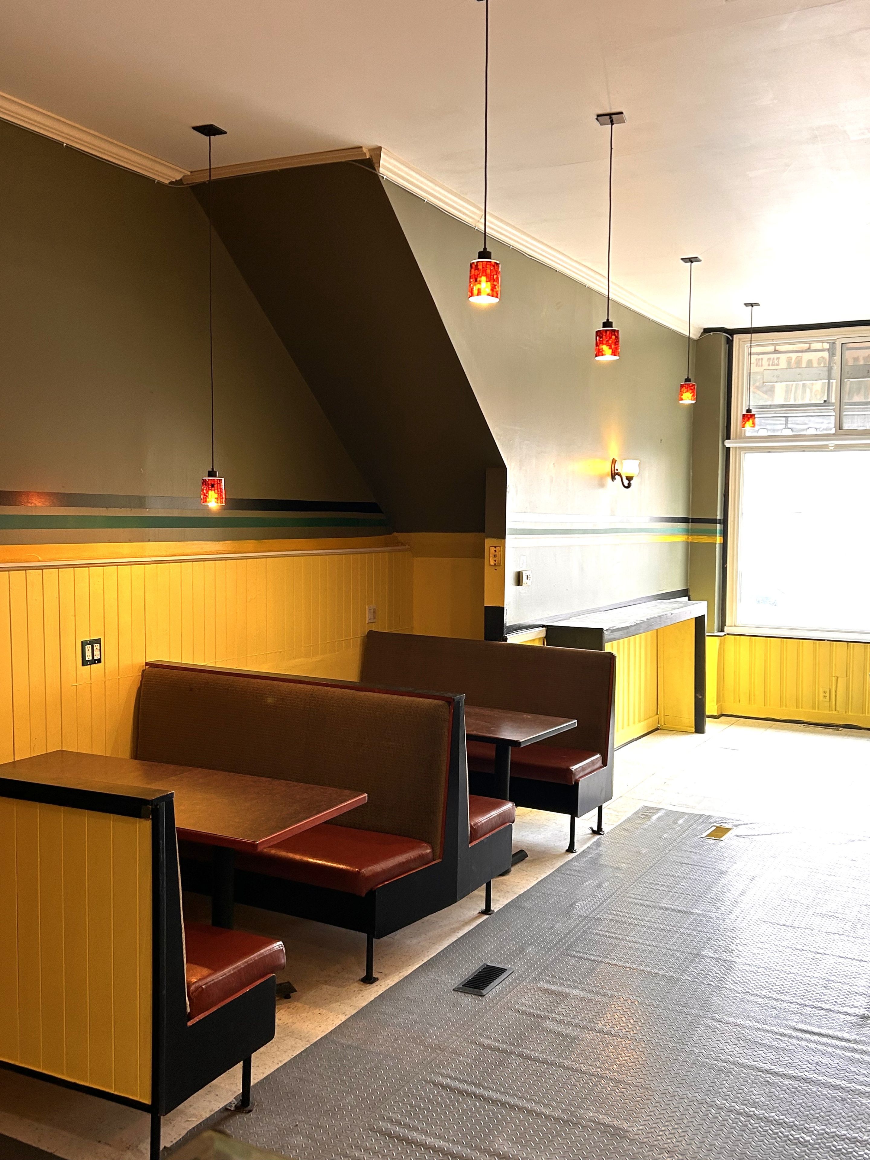 • Seating area with booths and dining counter for customer comfort.