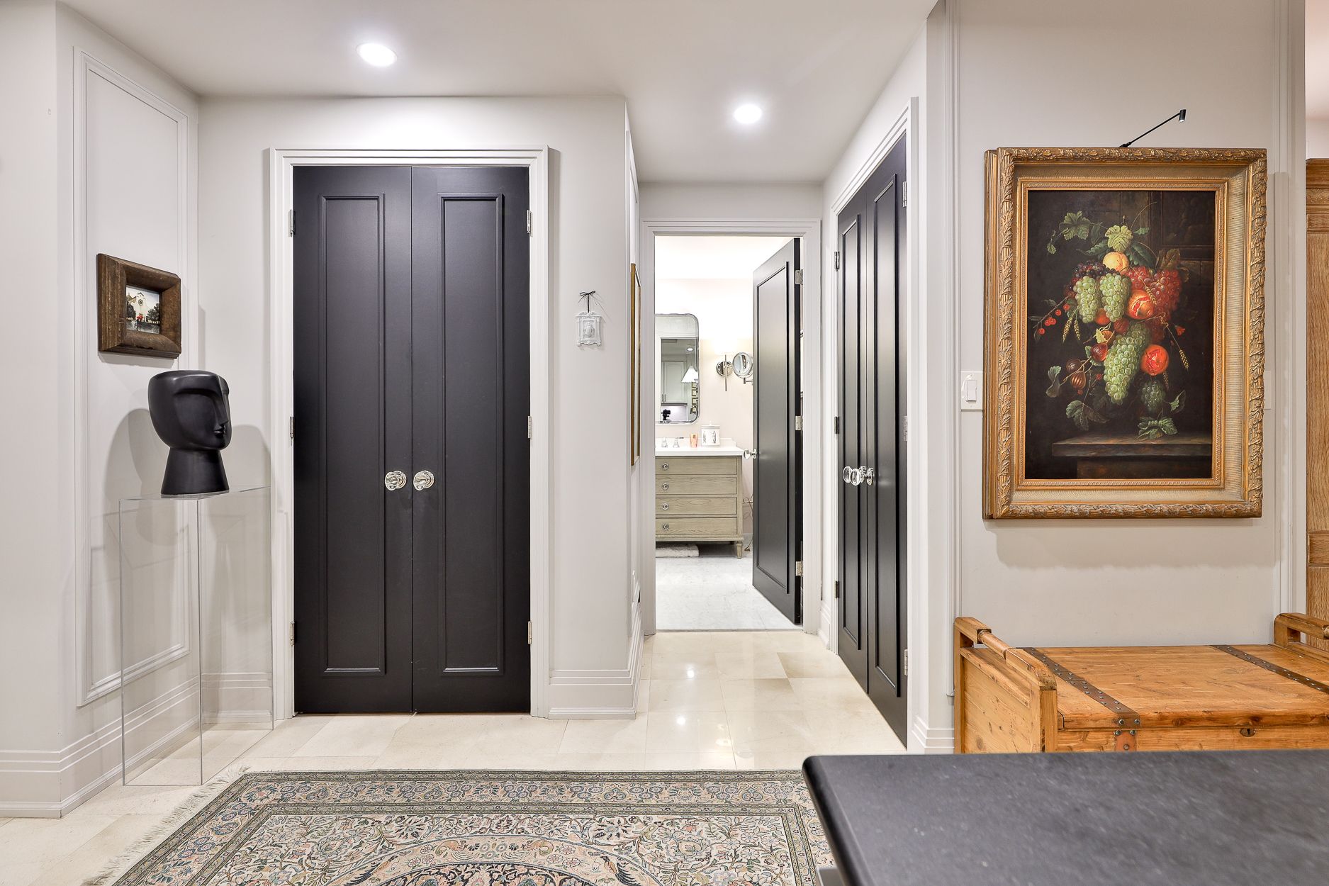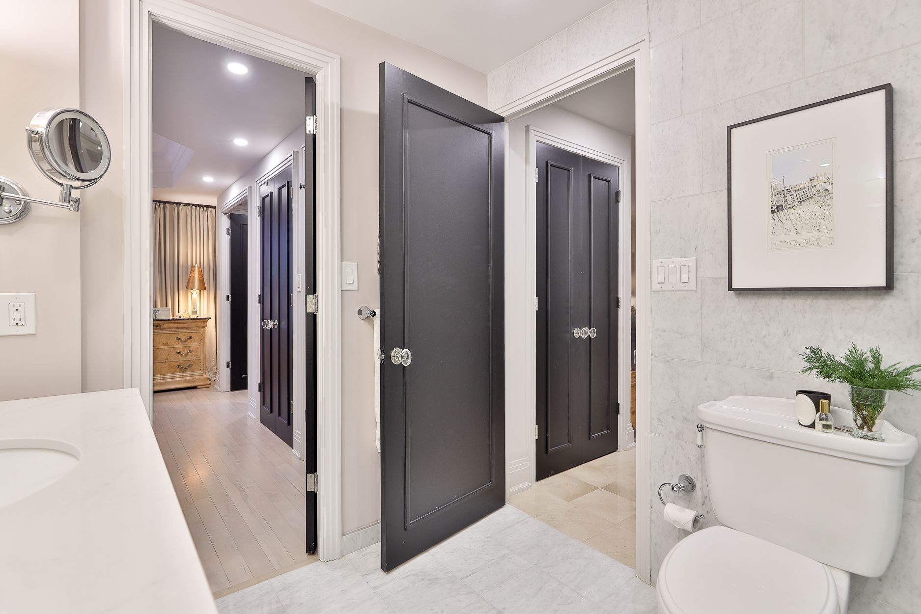 • Spa-inspired bathroom with high-end fixtures and elegant marble materials.