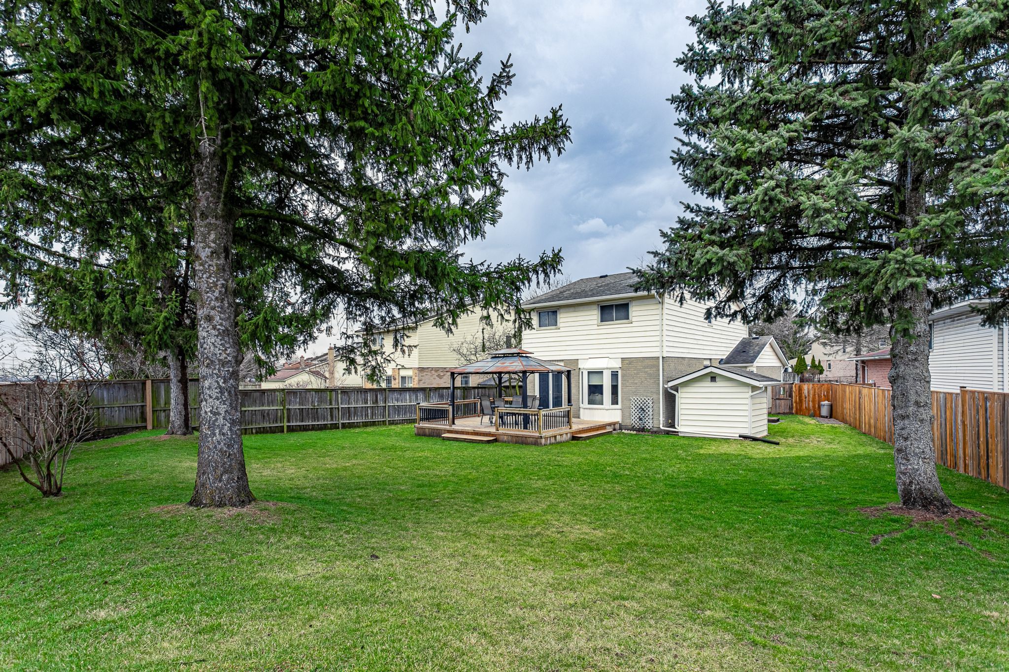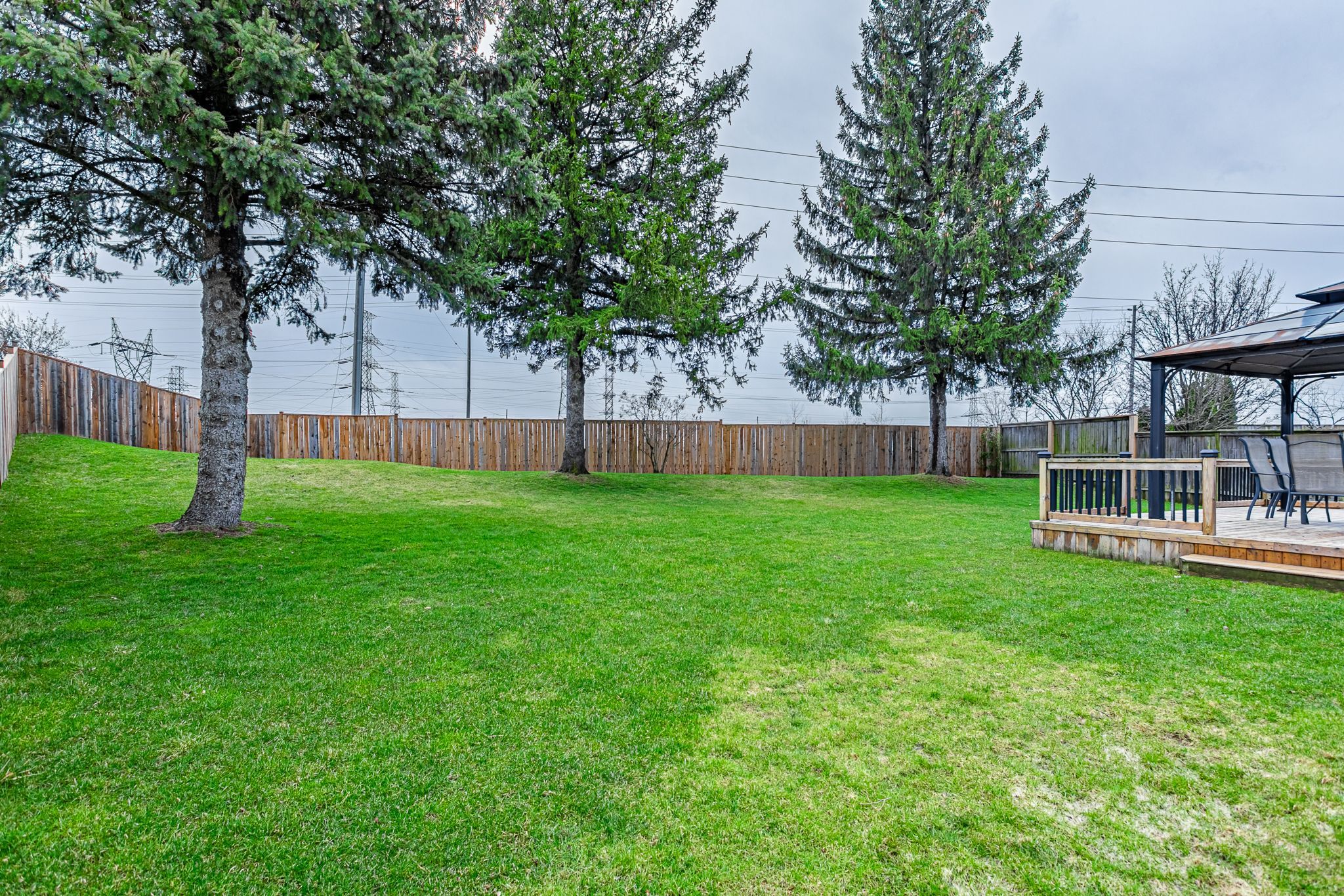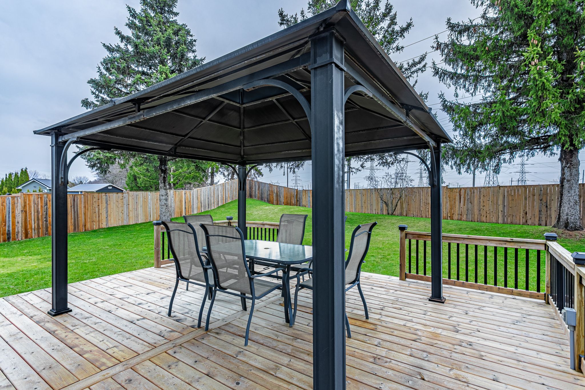 • Expansive fenced backyard with a large deck and gazebo for outdoor living.