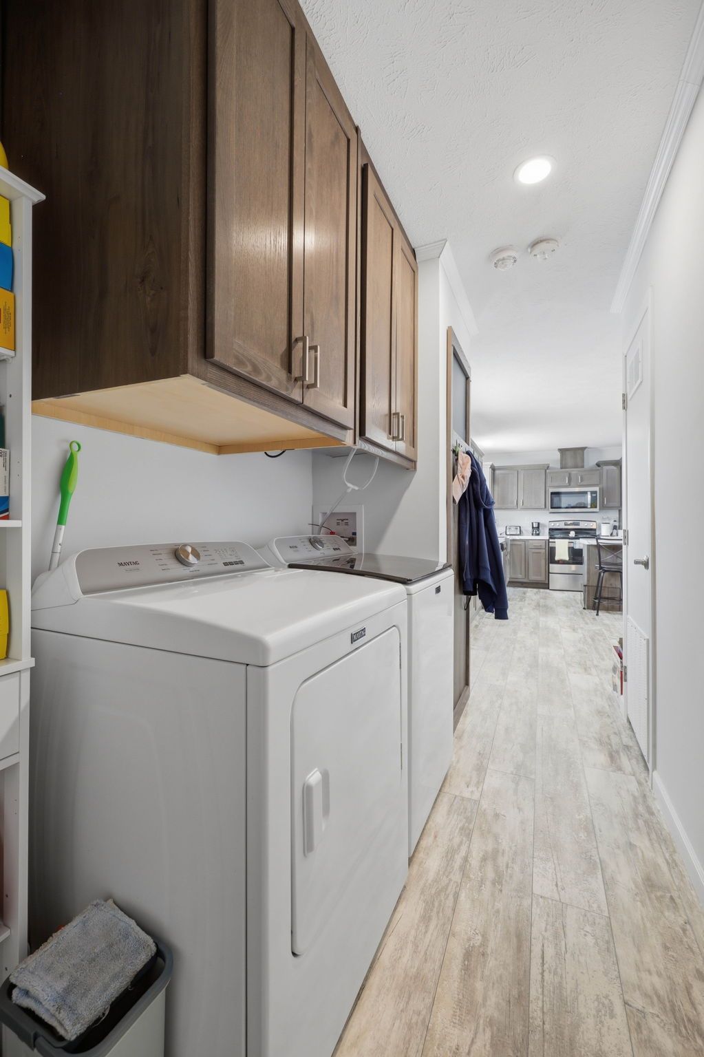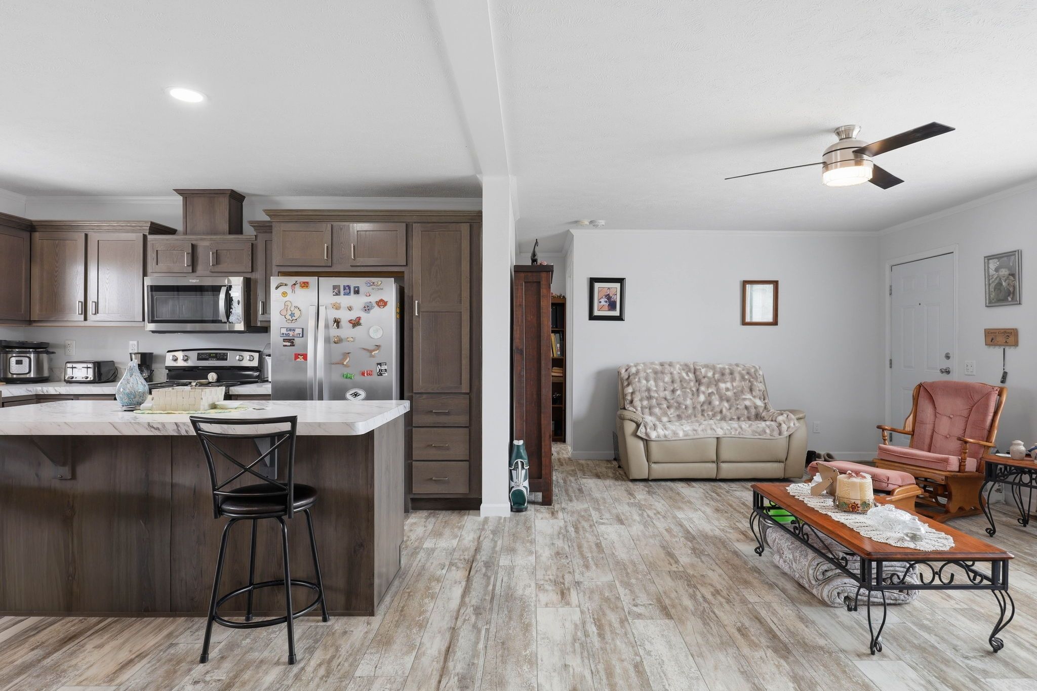 • Large eat-in kitchen with island and ample storage space.