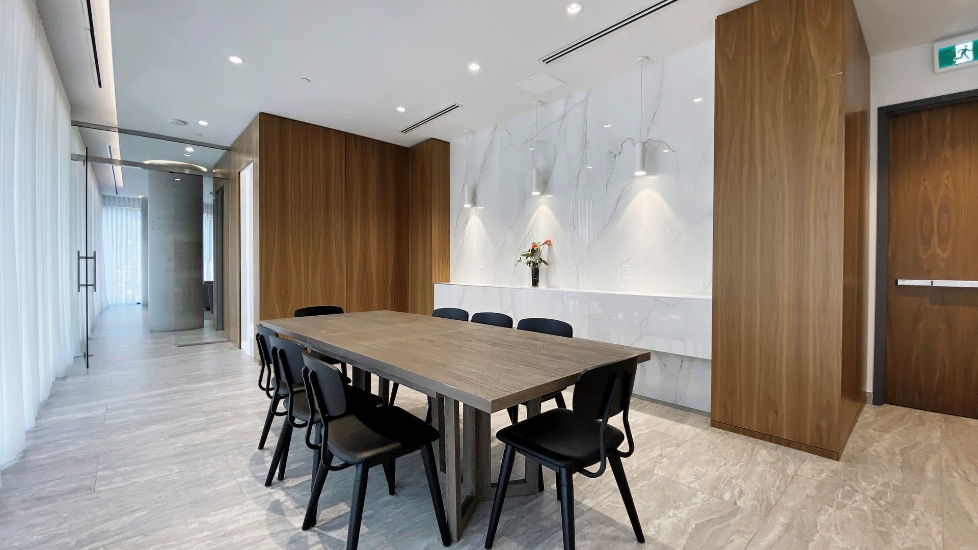 • Modern finishes include sleek laminate flooring and custom cabinetry.