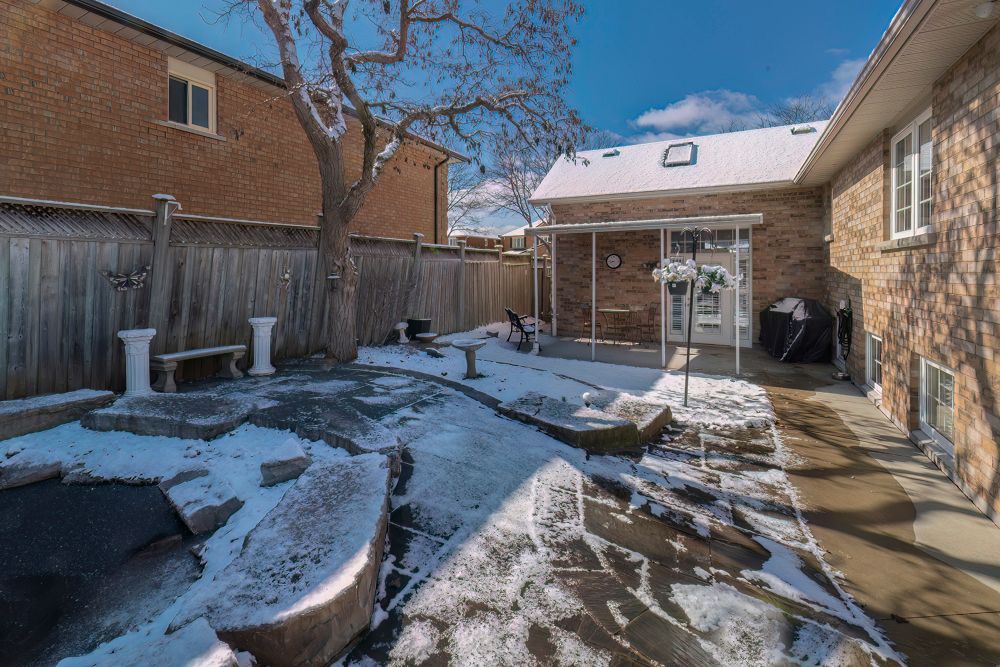 • Backyard features a pond, landscaping rock, and a storage shed.