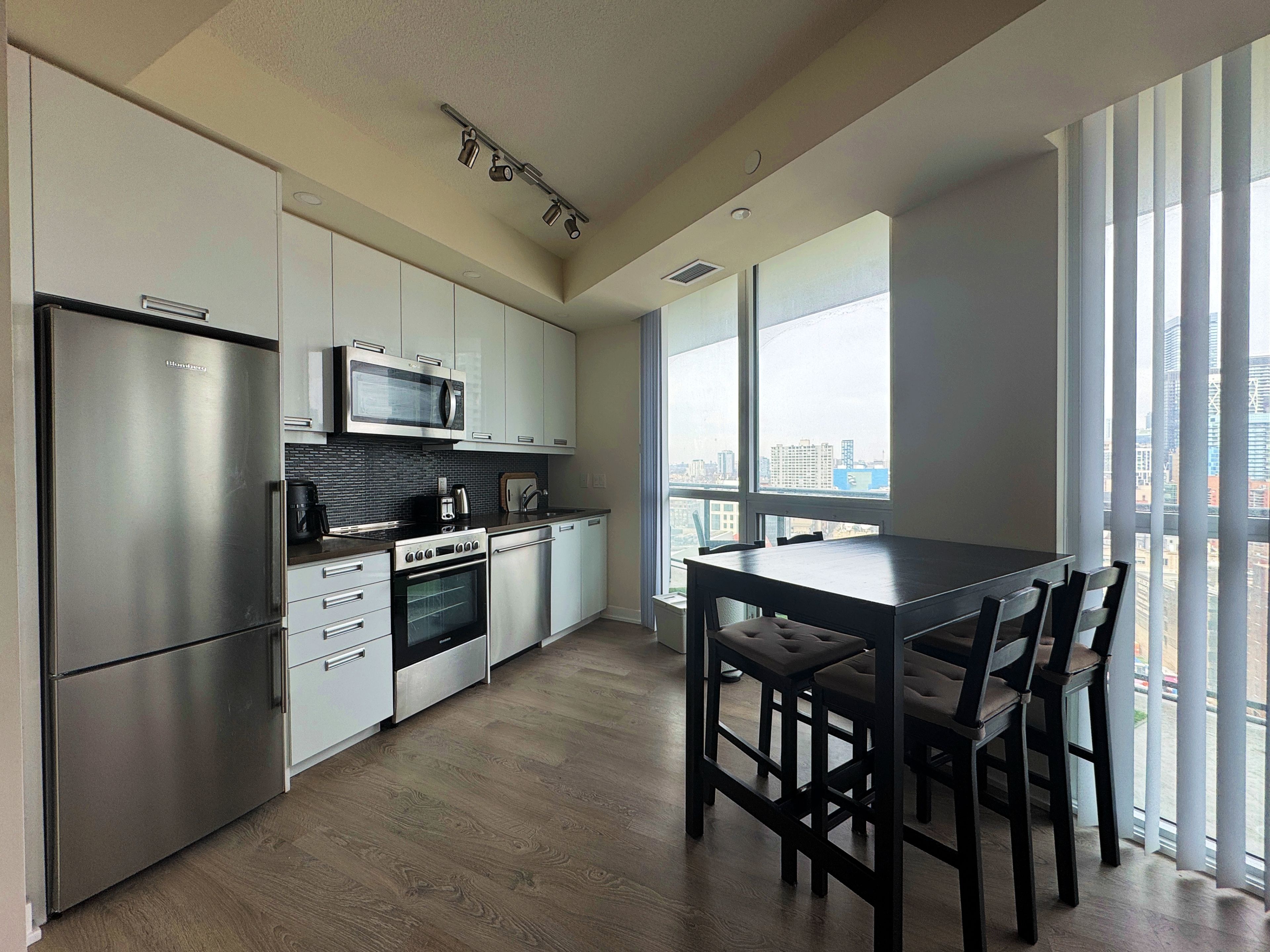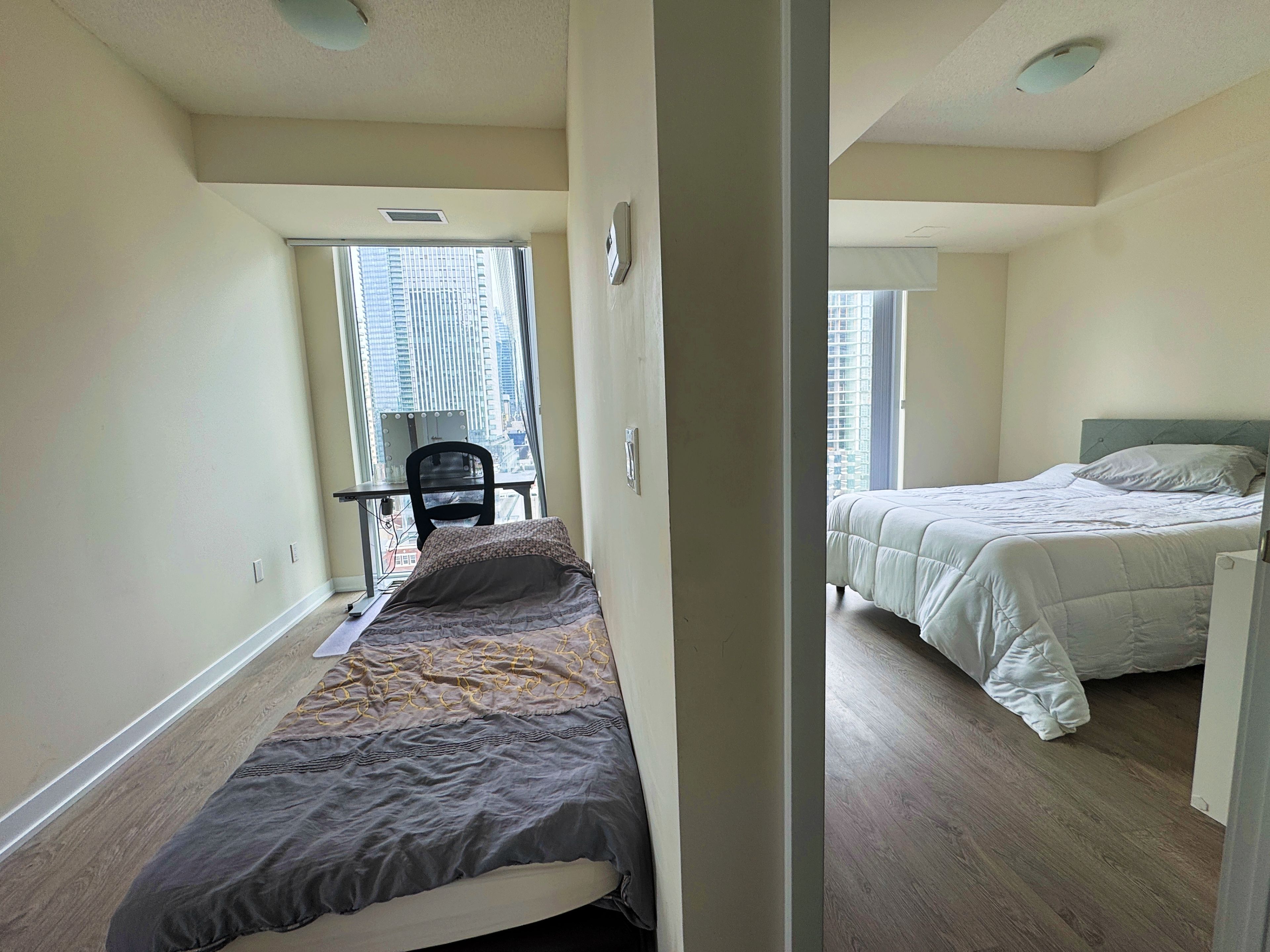 Welcome to 99 john st - a bright & spacious downtown condo! This functional 640 sq. Ft. Suite with a den offers an excellent layout and plenty of natural sunlight thanks to its corner exposure. The windowed den is a versatile space that can easily be used as a home office, guest room, or spare bedroom. Optional furniture can stay or be removed, offering flexibility for the next occupant. The unit also includes the added bonus of a locker and dedicated bike storage. Residents enjoy a full range of premium building amenities, including a fitness centre, outdoor pool, bbq terrace, party room, and 24-hour concierge service. Note: vacant photos added for reference only!