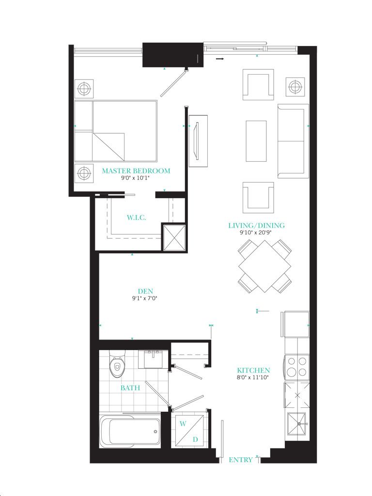 • Spacious 637 sq. ft. with 9 ft ceilings and floor-to-ceiling windows.