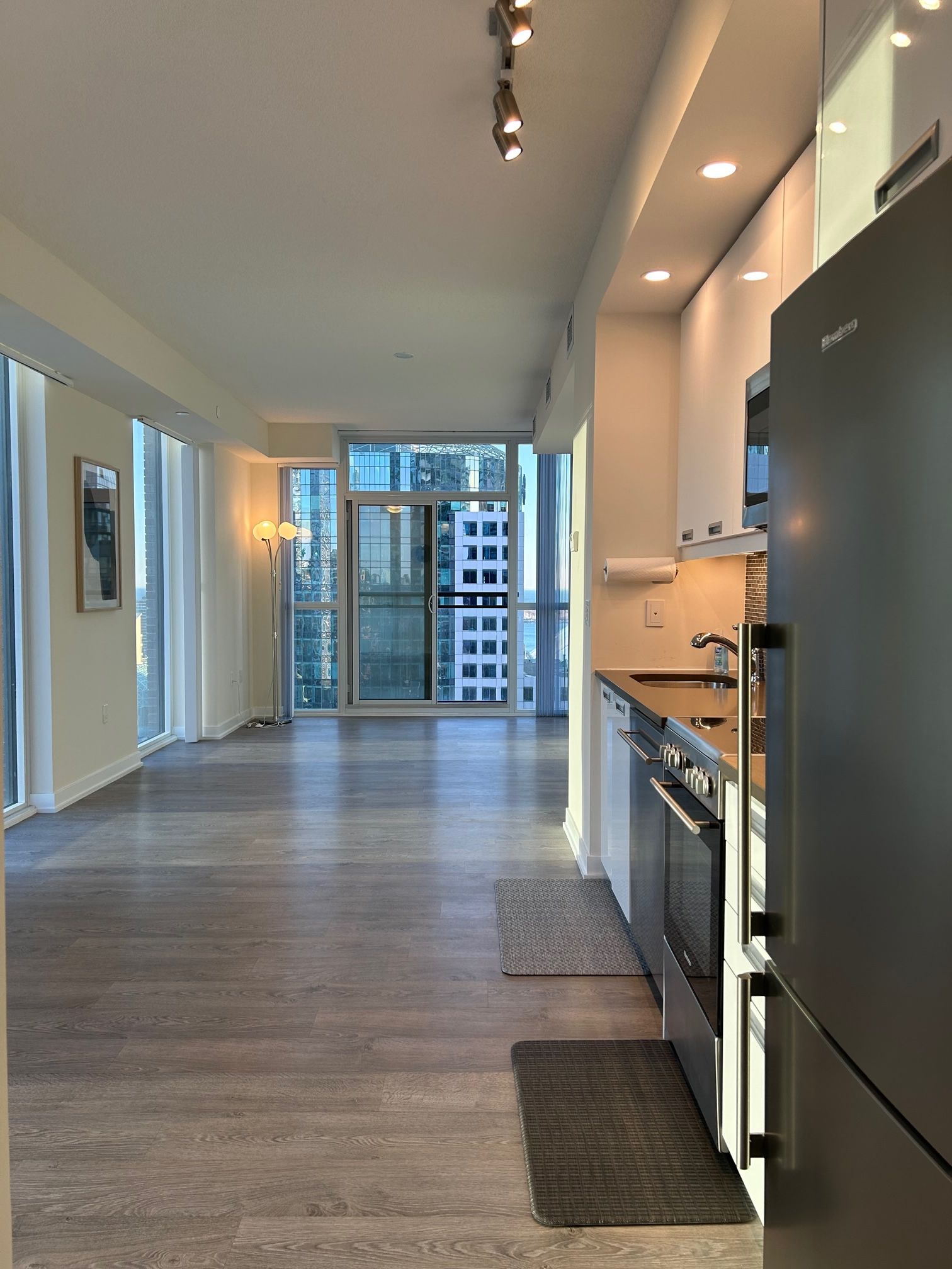 Rarely offered sun-filled 1+den corner unit with 9' ceilings and multiple floor-to-ceiling windows. This bright, modern suite features luxury finishes throughout, including stainless steel appliances, a quartz countertop, and a stylish backsplash with natural color of the cabinets. The spacious open-concept living and dining area offers a direct southeast view of the cn tower, along with stunning city and water views and beautiful sunrises. Price includes a parking and a locker. Conveniently located within walking distance to the city's best restaurants, the cn tower, ripley's aquarium of canada, and rogers centre. Just steps to public transit, streetcars, union station, and the path. Ideal for young professionals looking to live in the heart of the entertainment district.