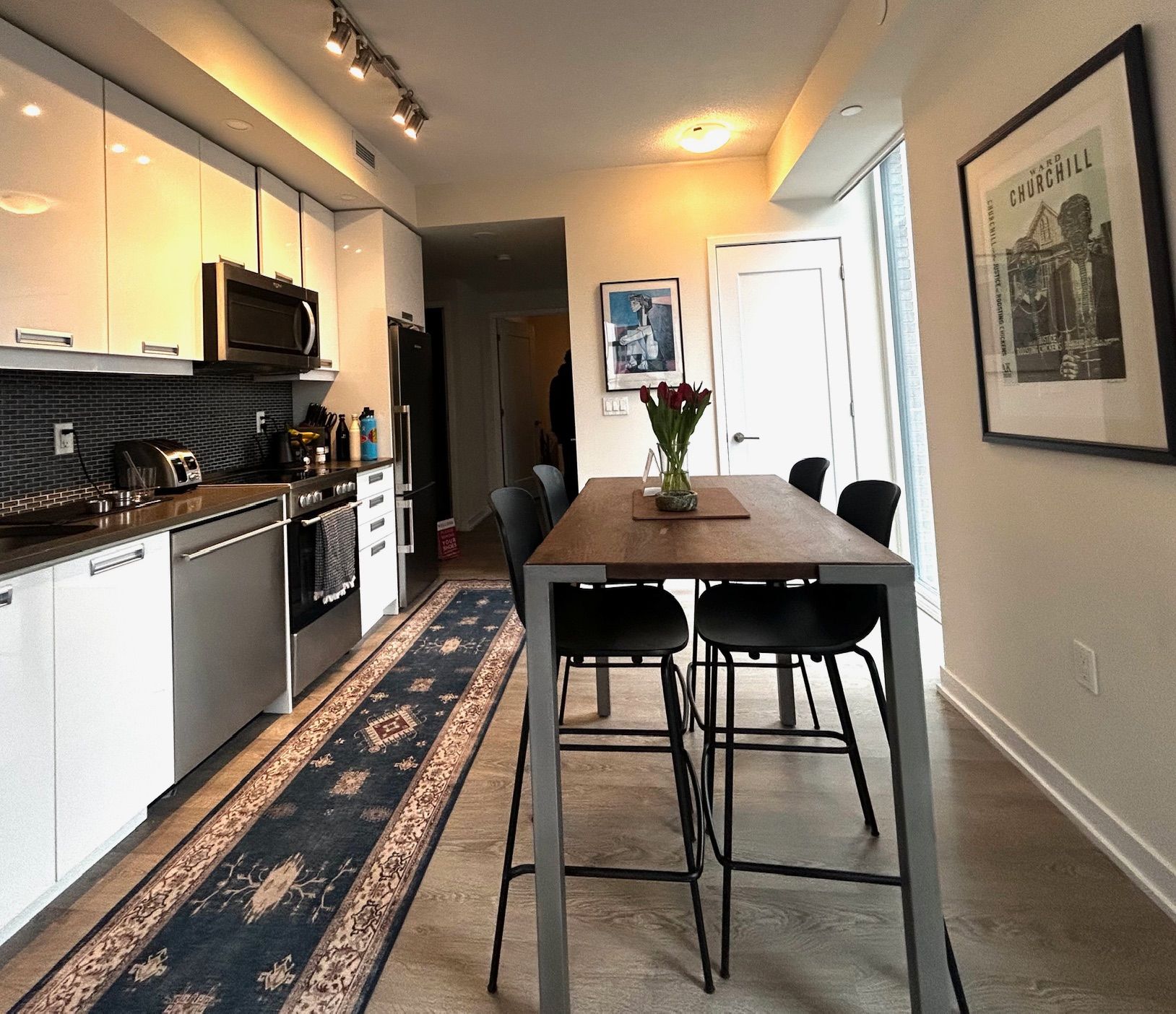 • Bright corner unit with 9' ceilings and floor-to-ceiling windows.