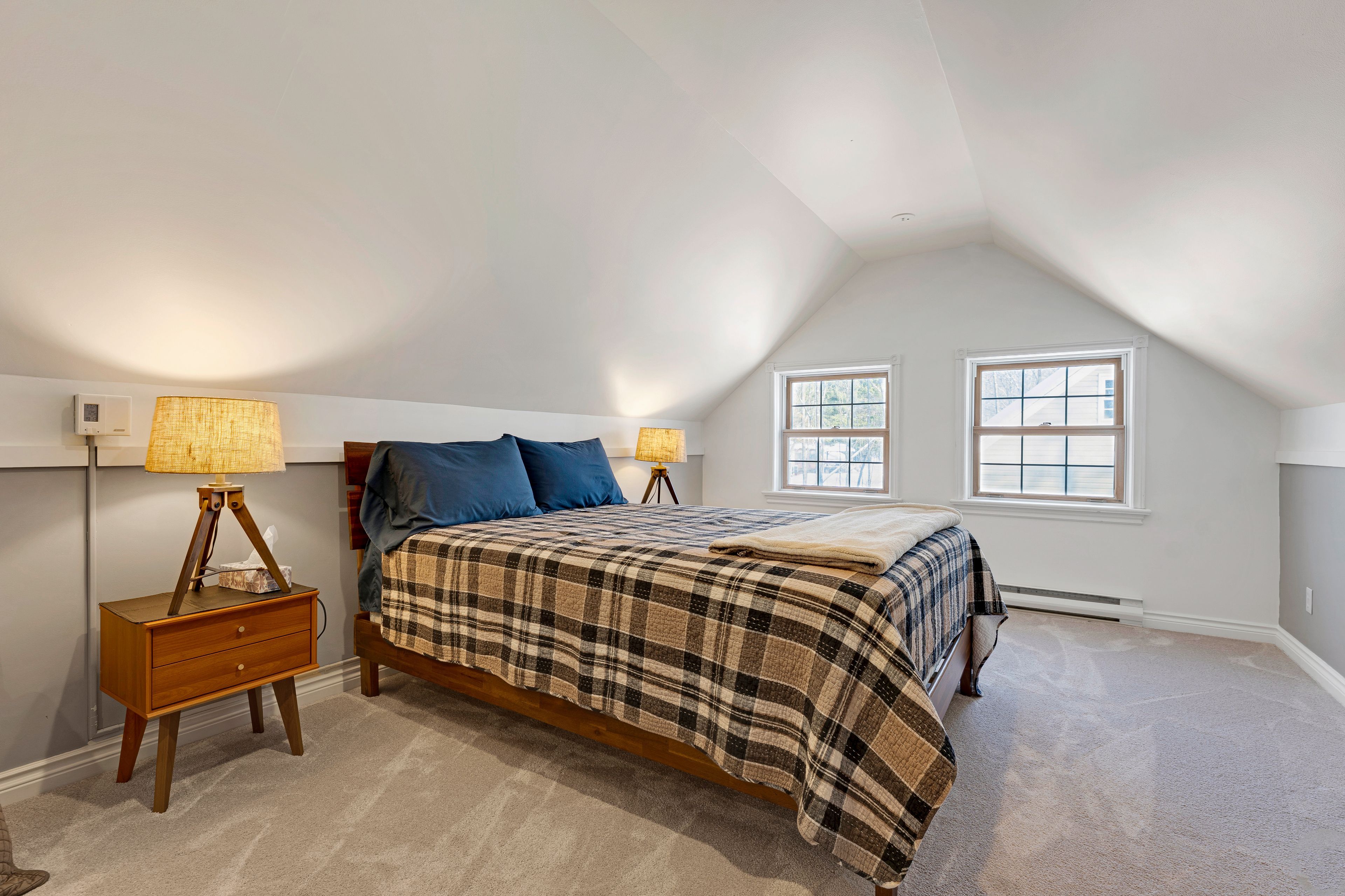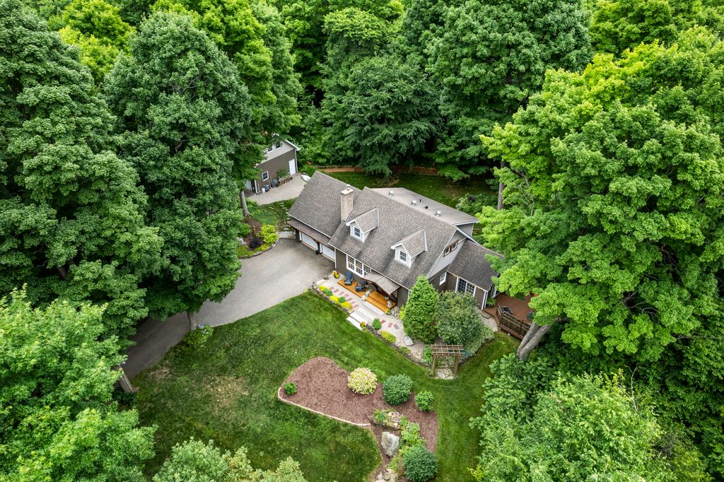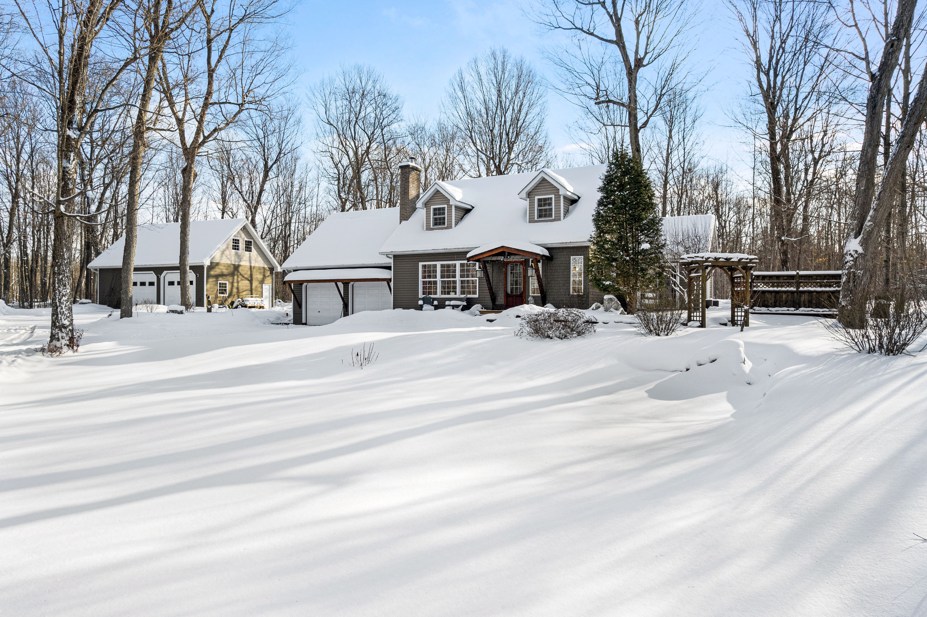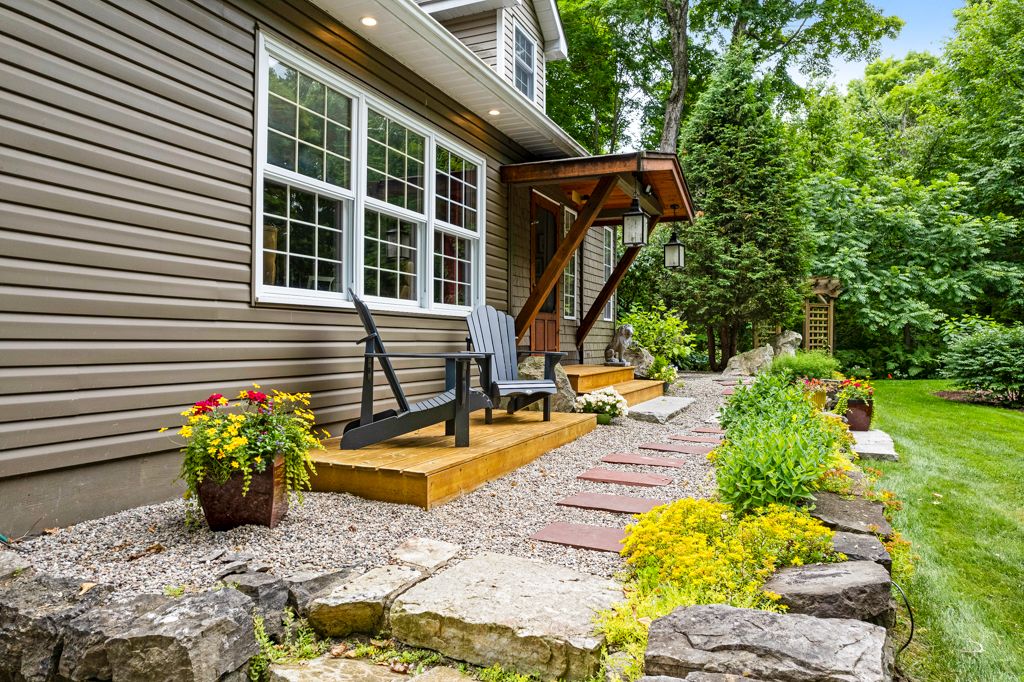 Easy to fall in love with this irresistible cape cod home and its landscaped gardens blending into the surrounding tranquility. On private acre that feels like a park, the three bedroom home has attached double garage plus detached double garage-workshop. The front walkway has deck perfectly designed for quiet times, watching spring perennials bloom and birds sing. Light-filled foyer adjacent to coat room with large windows. Open floor plan offers defined family spaces; never-ending walls of windows, maple floors and 8' ceilings with high-end recessed lights. Livingroom full of natural light flowing in from oversized windows and has stone fireplace with jotul woodstove insert. Dining room wall of windows frame great outdoors. Contemporary 2022 kitchen with quartz counters, ceramic matte backsplash, island-breakfast bar, upscale appliances and tiffany lights. Dinette has full-length windows giving you views of backyard oasis. Family room three sets of patio doors open to wrap-about deck with 2023 salt-water artic spa hot tub. Combined powder room & laundry station renovated 2024 with slate-like tile floor, decorative copper sink, custom wrap-about counter & shiplap ceiling. Mudroom door to garage and also door to yard. Upstairs, you have office/flex room. Sunny spacious primary bedroom deep window dormers with built-in bench and, walk-in closet with window. Two more large bedrooms, one with walk-in closet. Second floor bathroom a delight; all renovated 2023 with gorgeous custom vanity & luxury rain-head glass shower. Home has radiant hot water heating with wall radiators and 2025 propane boiler. Mini-split 2019 a/c. Hot water on demand 2025. Auto generac can power whole home. Attached garage has epoxy floor & 240 v. Detached garage insulated, 250v, hoist, floor drains, windows & big loft. Hi-speed. Cell service. Located on paved township paved road with garbage pickup & school bus route. Just 4 mins to lower rideau lake boat launch. 10 mins to smiths falls or perth.