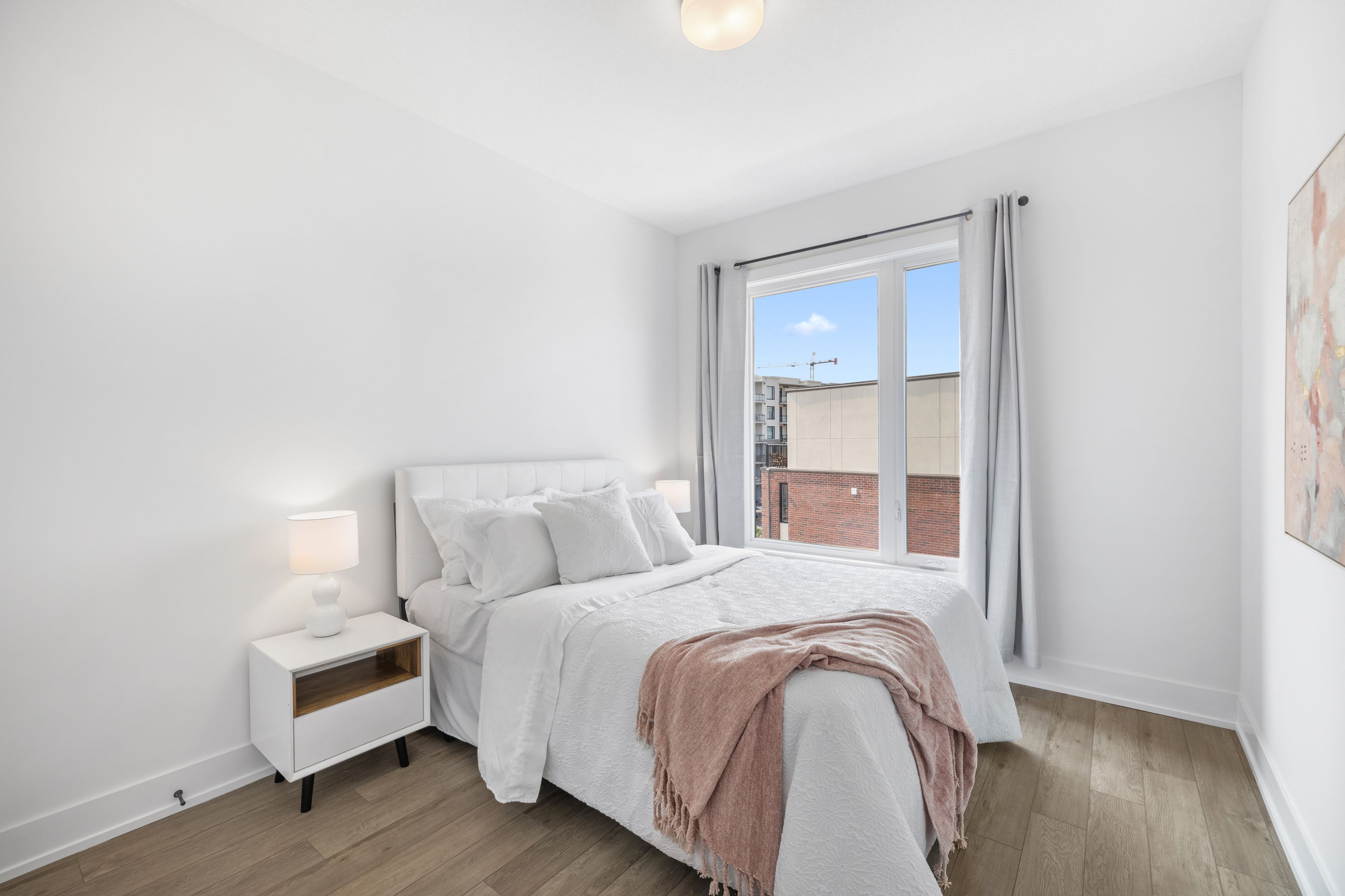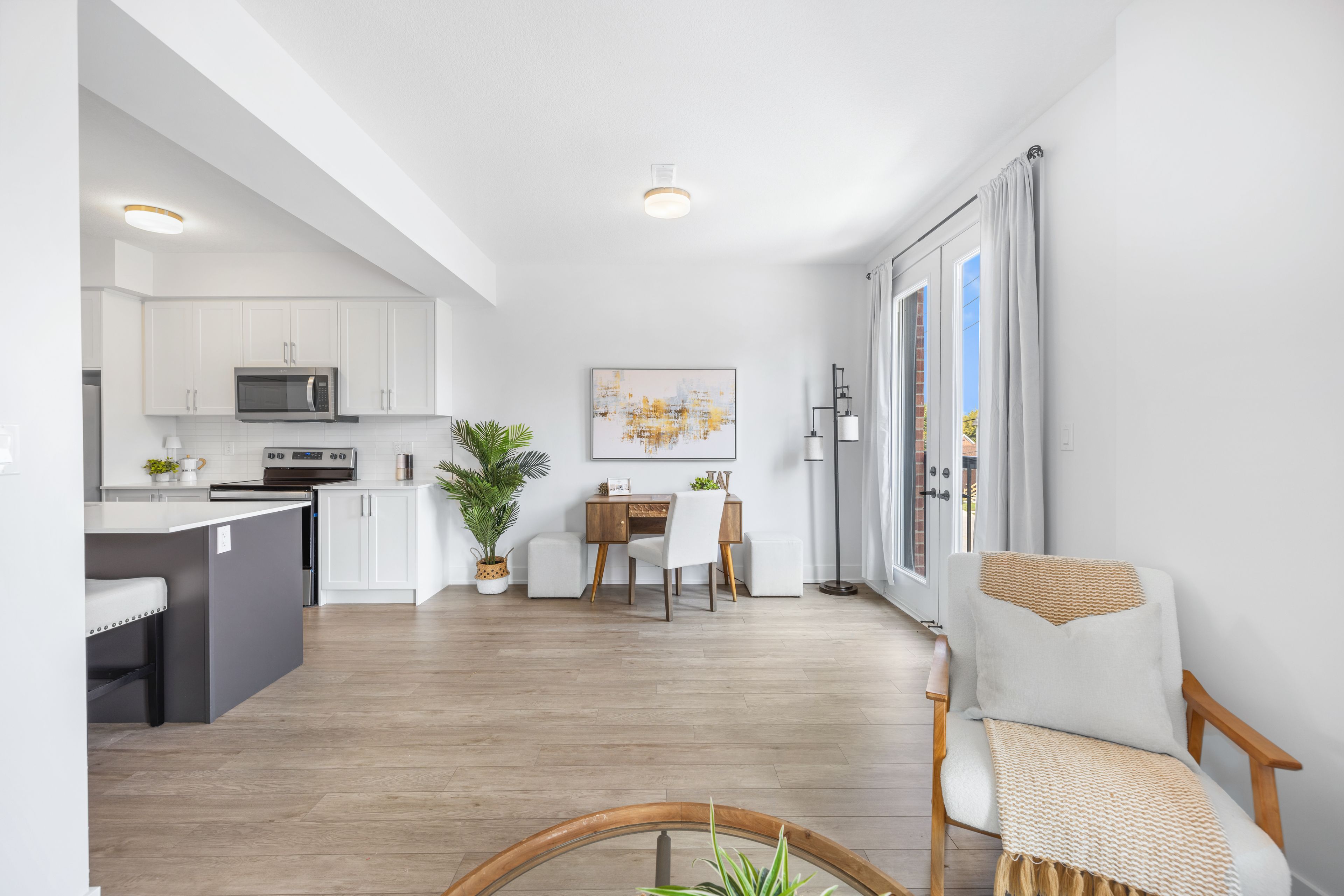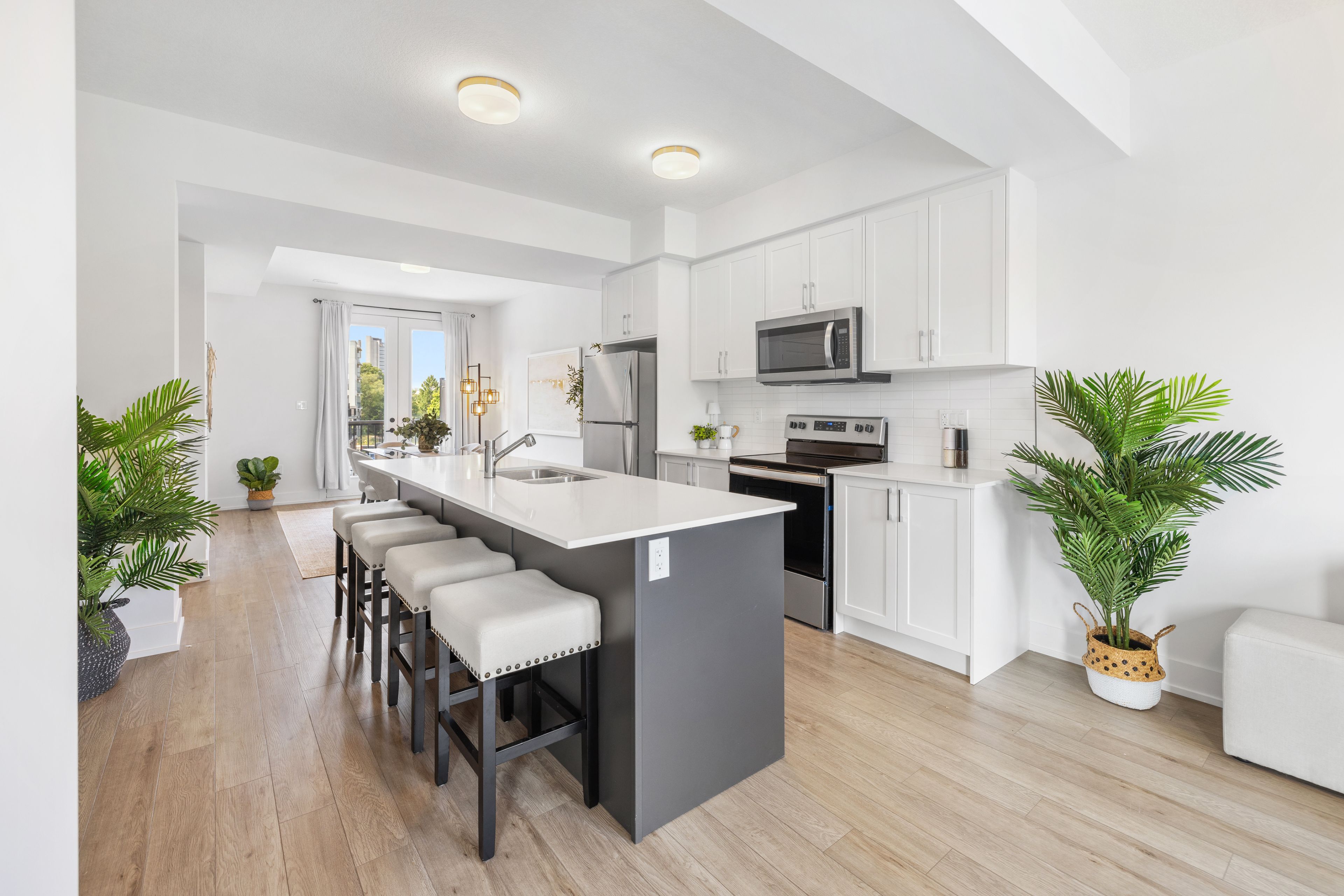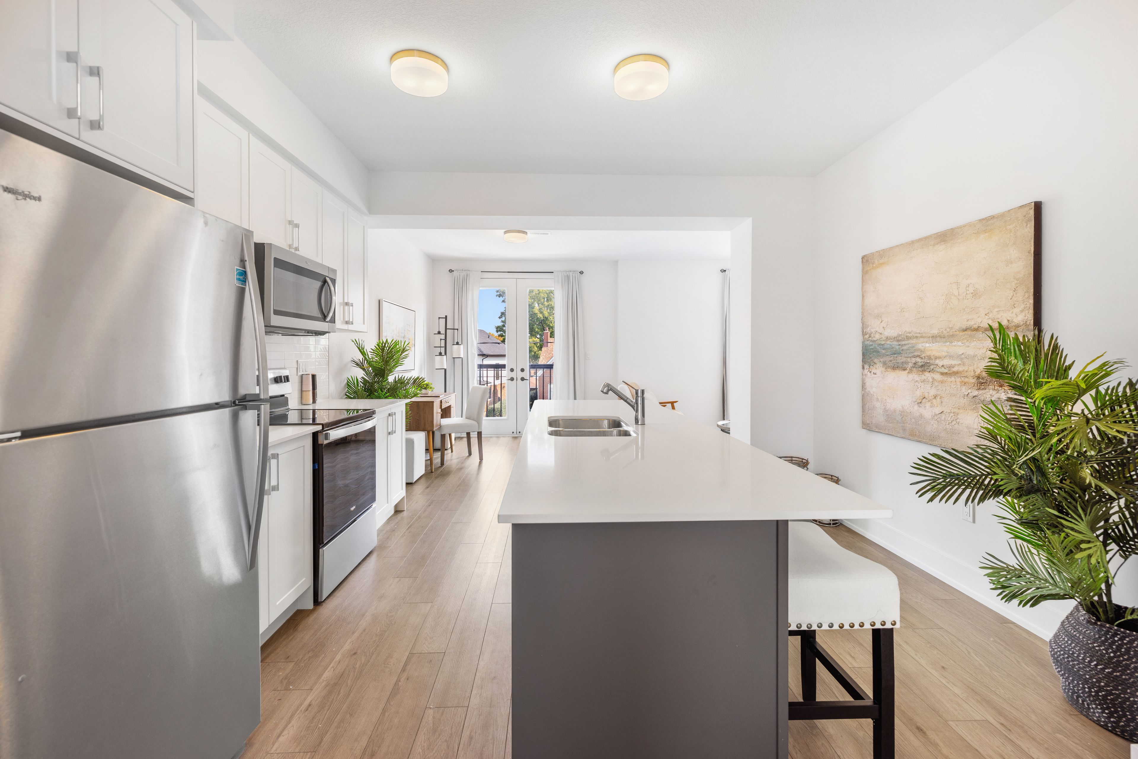 • Modern finishes with quartz countertops and in-suite laundry for convenience.