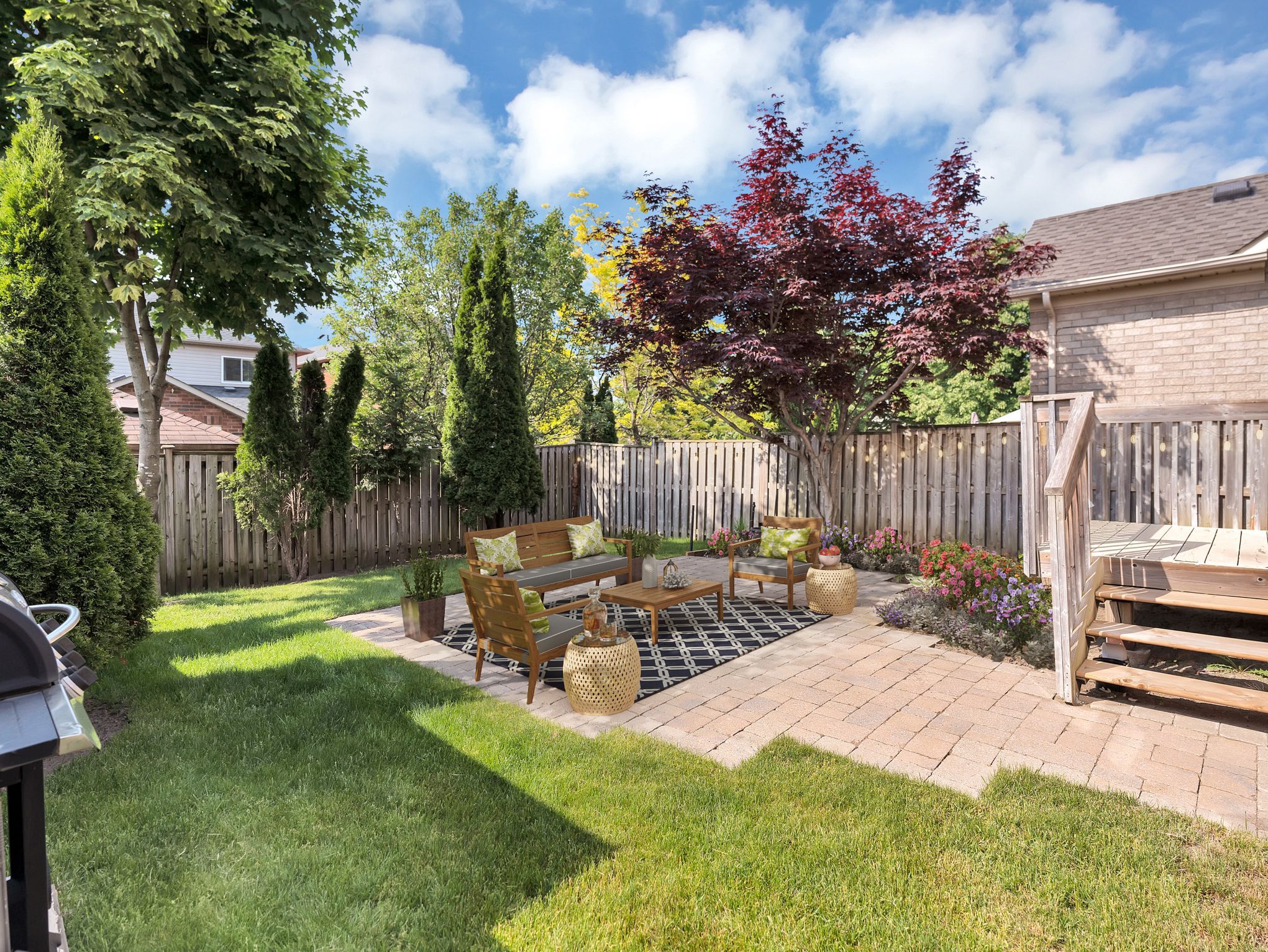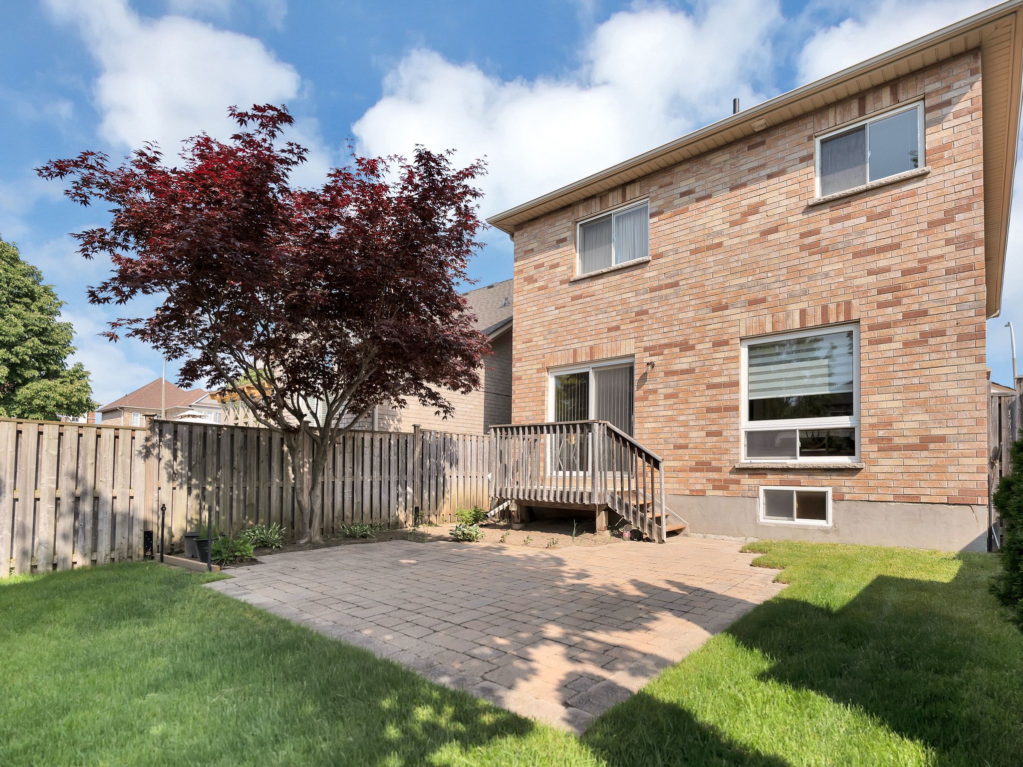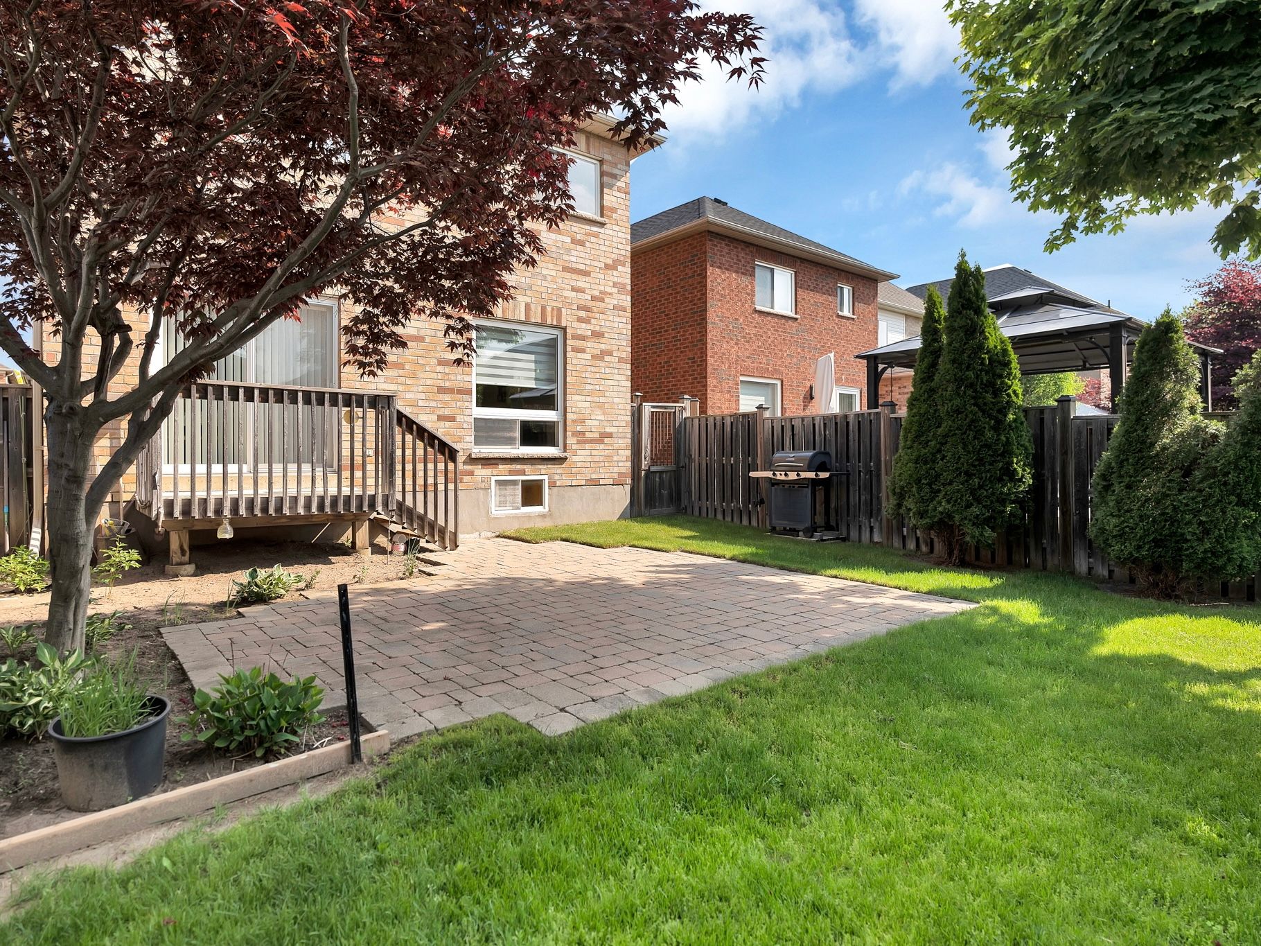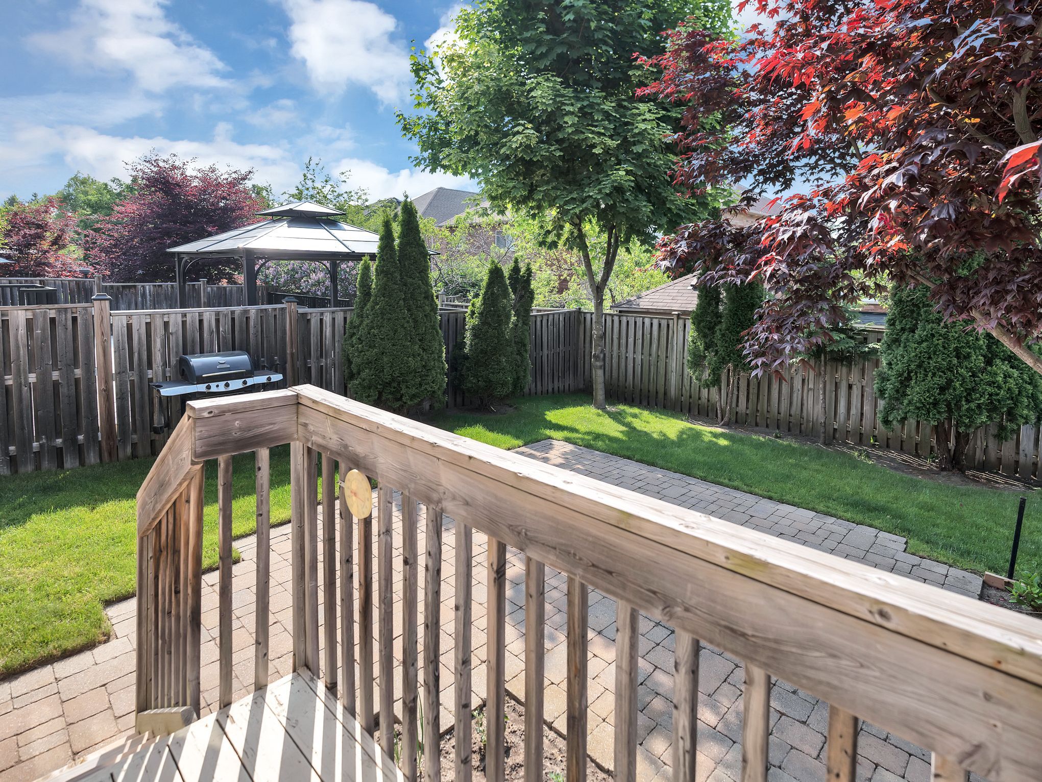 • Beautifully landscaped backyard with mature trees for privacy and shade.