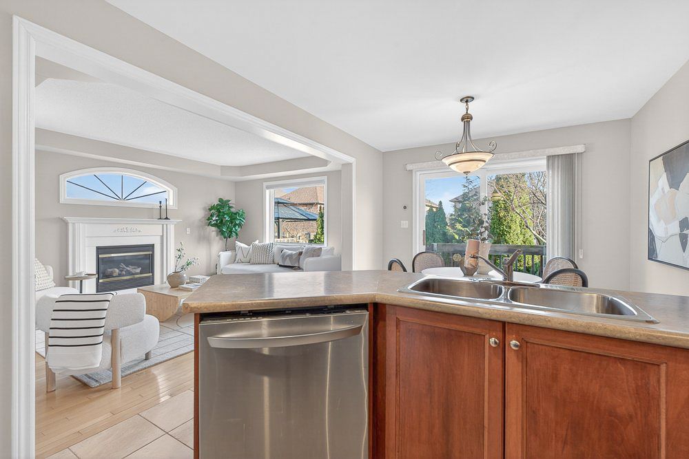 • Bright kitchen with maple cabinetry and a cozy family room fireplace.