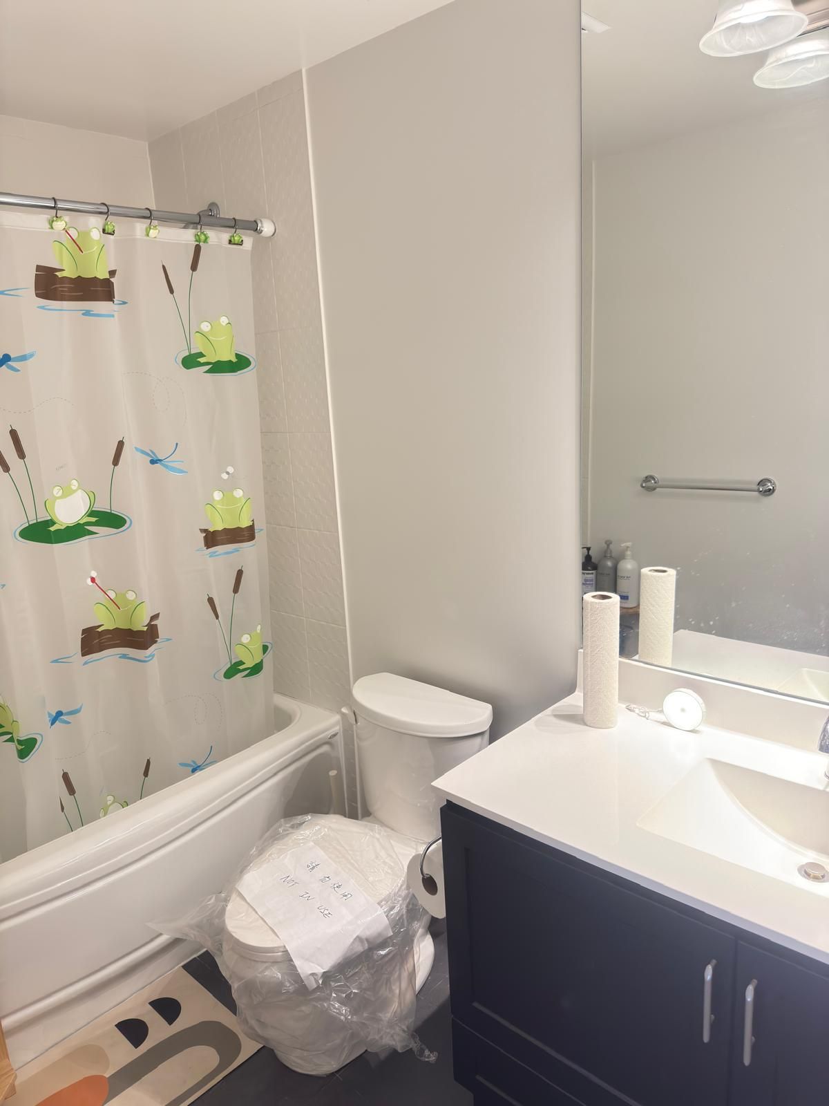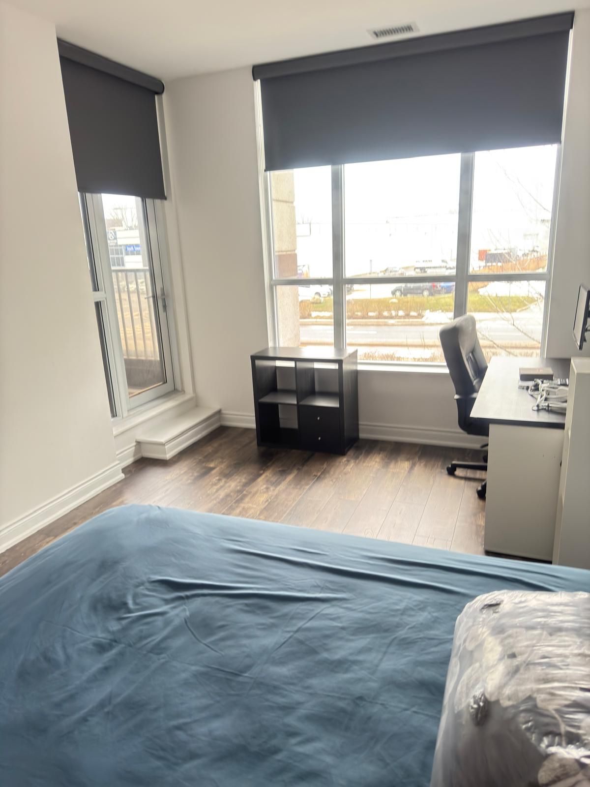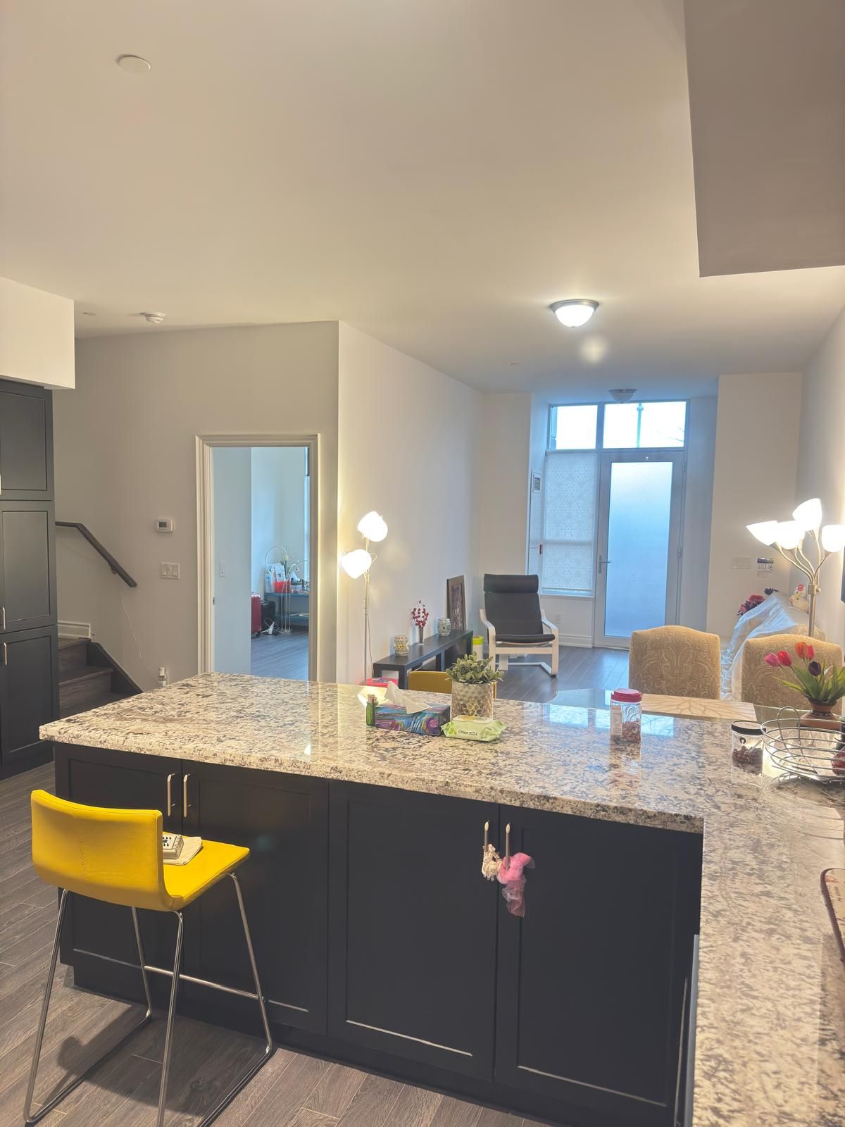 • High ceilings and laminate flooring create a modern feel.