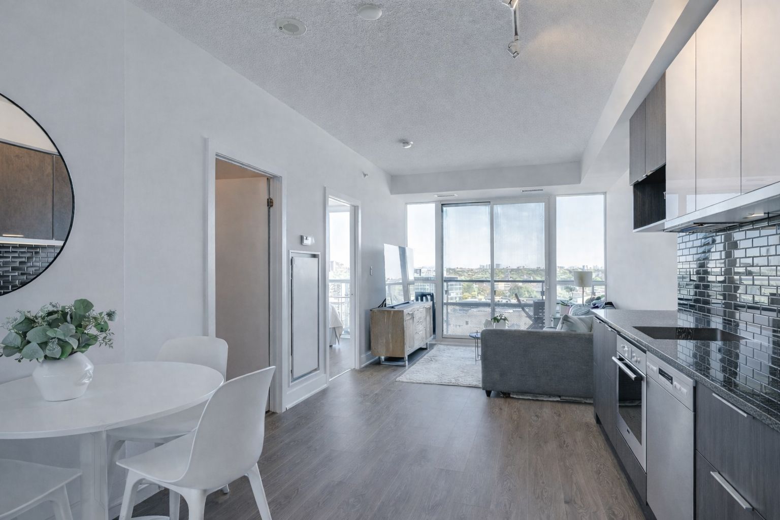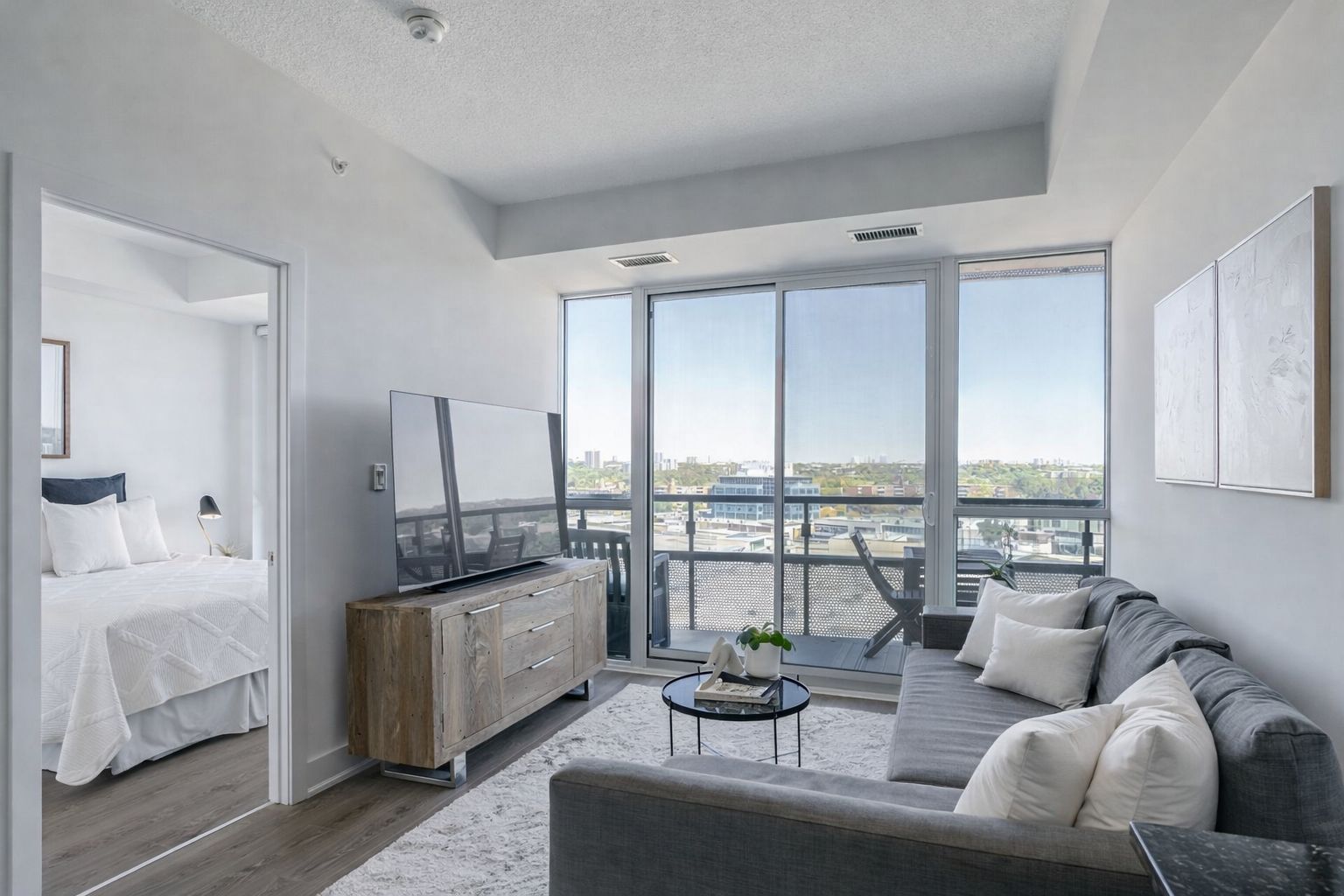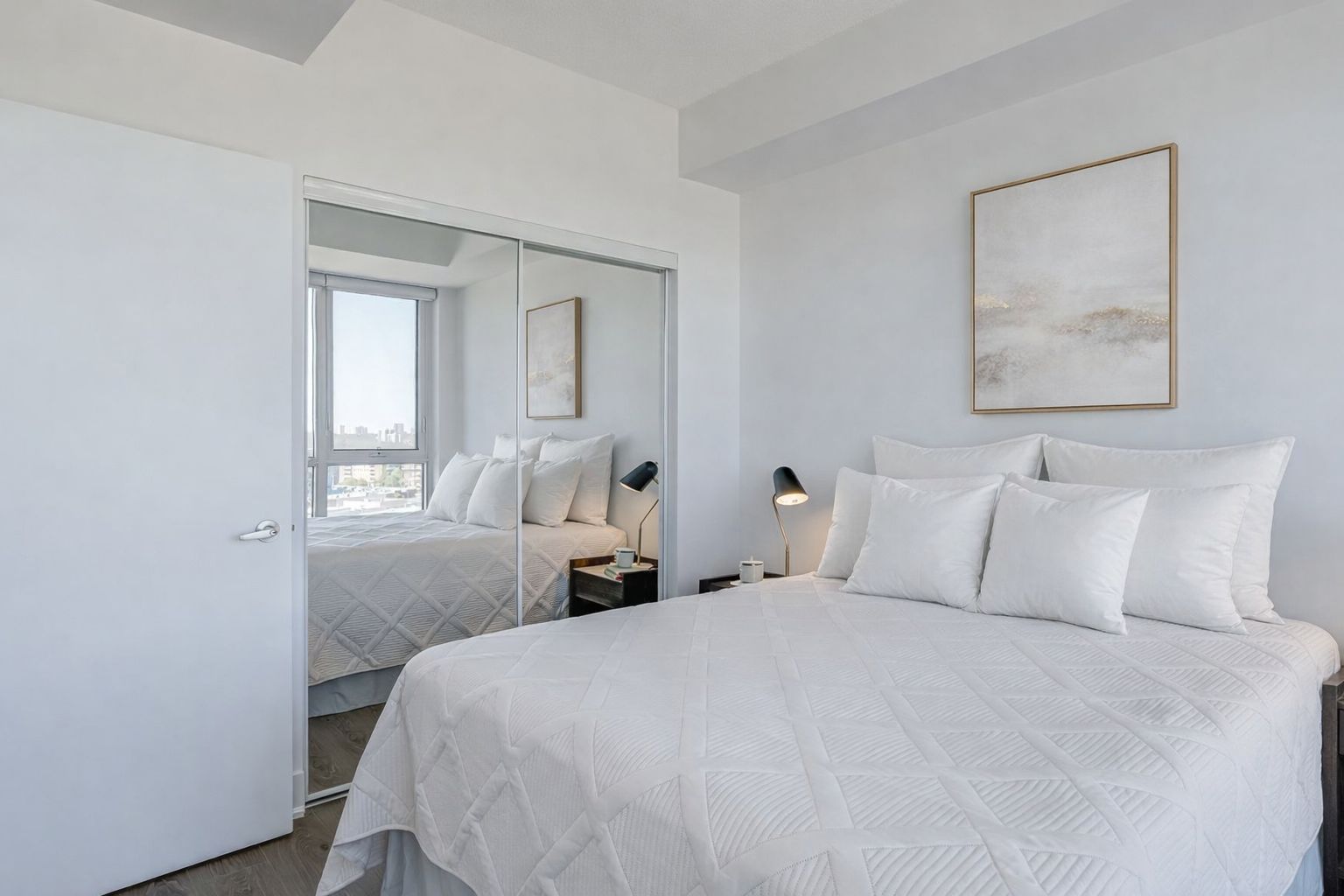 • Bright one-bedroom suite with floor-to-ceiling windows and city views.